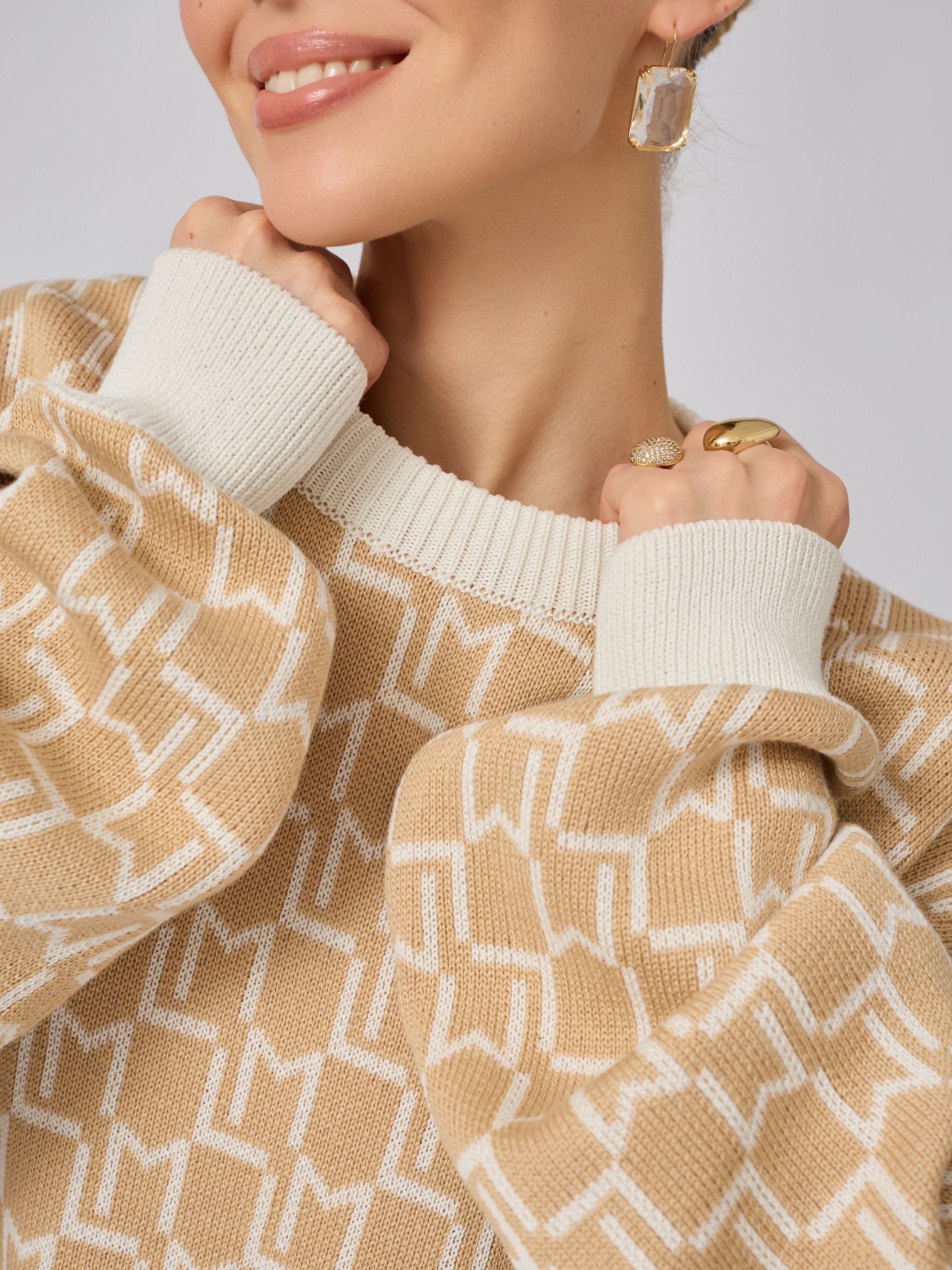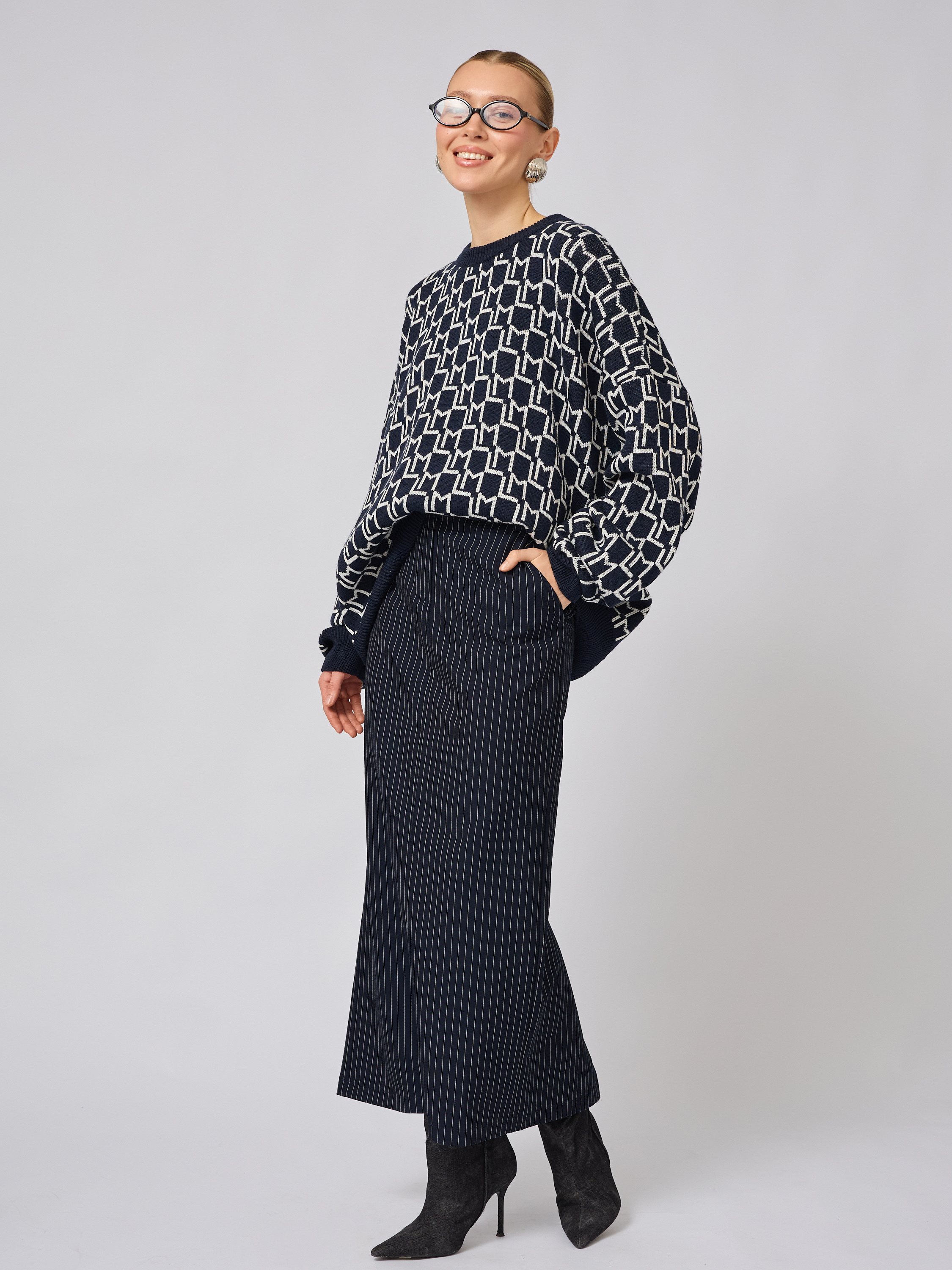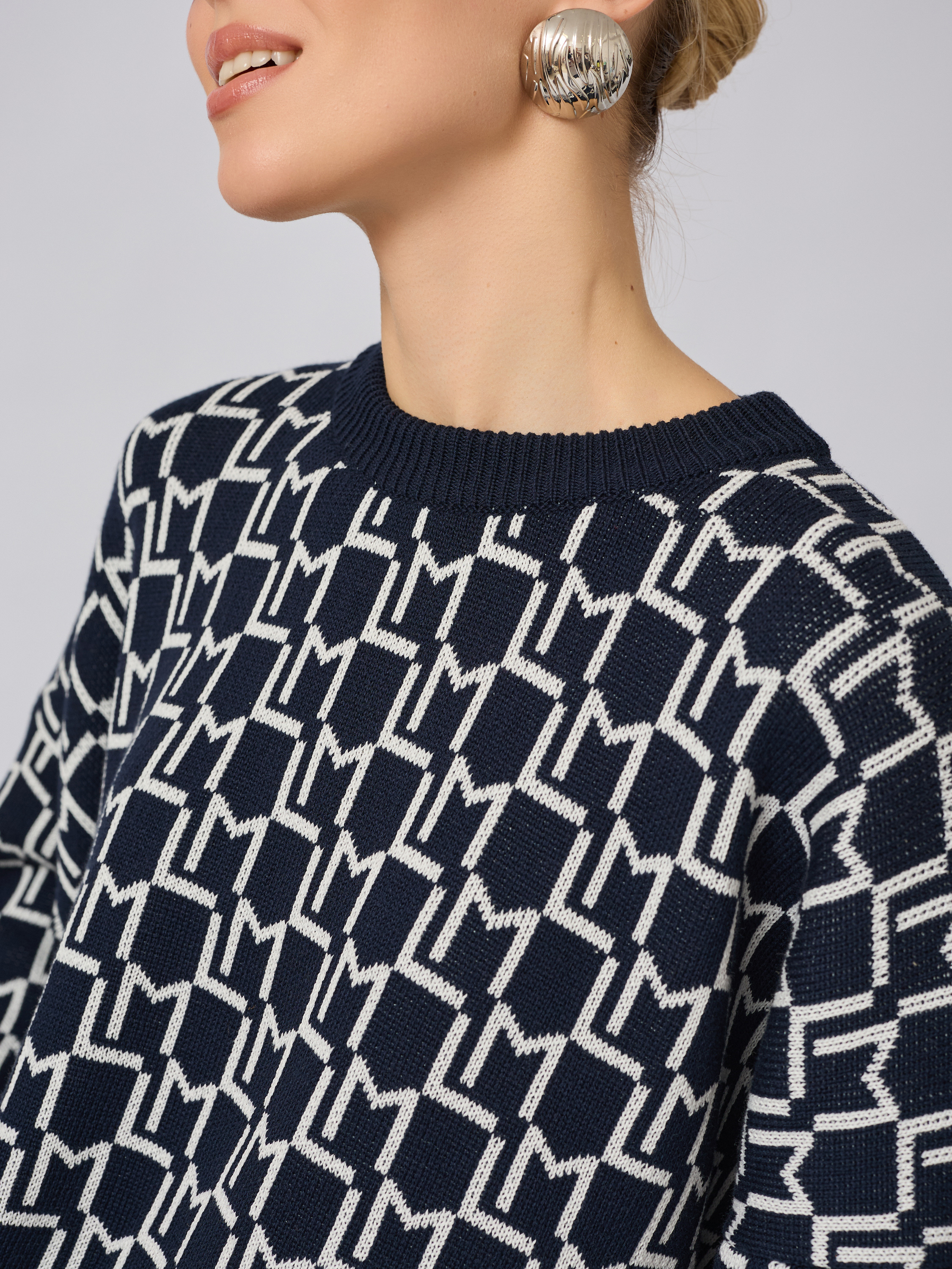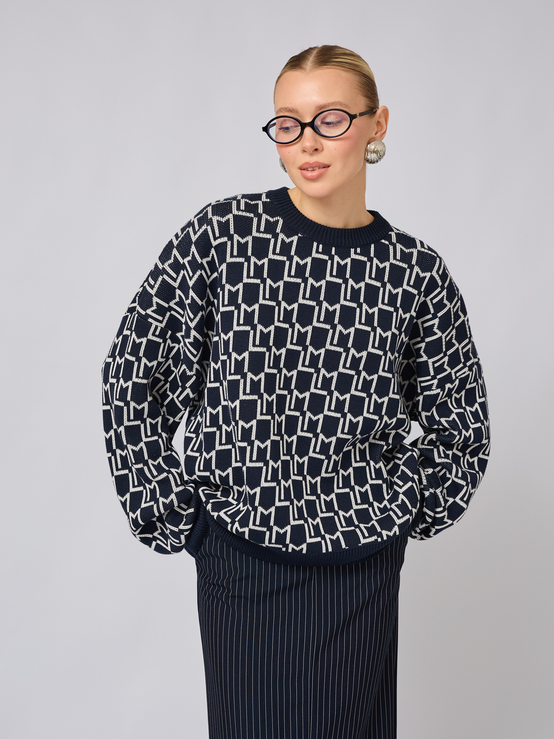 Этот женский джемпер выполнен из мягкой хлопковой и акриловой пряжи, что обеспечивает теплоту и комфорт в демисезонный период. Дизайнерский двухцветный узор с аккуратным логотипом придает изделию модный вид и подчеркивает стильные декоративные элементы. Свободного кроя с длинным рукавом и удлиненным низом, он отлично держит форму благодаря вязанию с переплетением высокой плотности. Уютный свитер без горла обладает формоустойчивой структурой, которая сохраняет аккуратный внешний силуэт даже после многочисленных циклов стирки. Мягкая основа изделия образует гладкий на ощупь материал, который не образует катышков и гипоаллергенен. Манжеты на рукавах и внизу создают эффект аккуратного завершения, а длинный свободный рукав добавляет удобства и практичности. Такой теплый свитер легко сочетать с разными моделями юбок, брюк, становясь незаменимой частью гардероба тех, кто ищет стильную вещь для создания нарядного образа в сочетании с модными тенденциями. Базовый синий цвет гармонично дополняется молочными элементами, что придает изделию легкую дизайнерскую изюминку. Благодаря составу из хлопка и акрила вещь отличается износоустойчивостью и легкостью ухода. Такой джемпер подходит для активной жизни — он сохраняет форму и внешний вид даже после длительного ношения. Свободного кроя модель создает эффект объемного oversize силуэта, подчеркивая индивидуальность каждой женщины. Длинный рукав позволяет чувствовать себя уютно в прохладное время года, а отсутствие горла делает дизайн более современным и универсальным. Вязаная структура изделия формирует приятную текстуру за счет использования мягкой пряжи высокого качества. Этот женский джемпер станет отличным выбором для тех, кто ценит удобство в сочетании с нарядностью и модным внешним видом. Он идеально подходит для повседневной носки или особых случаев благодаря тщательно продуманному дизайну и качественному составу материалов.