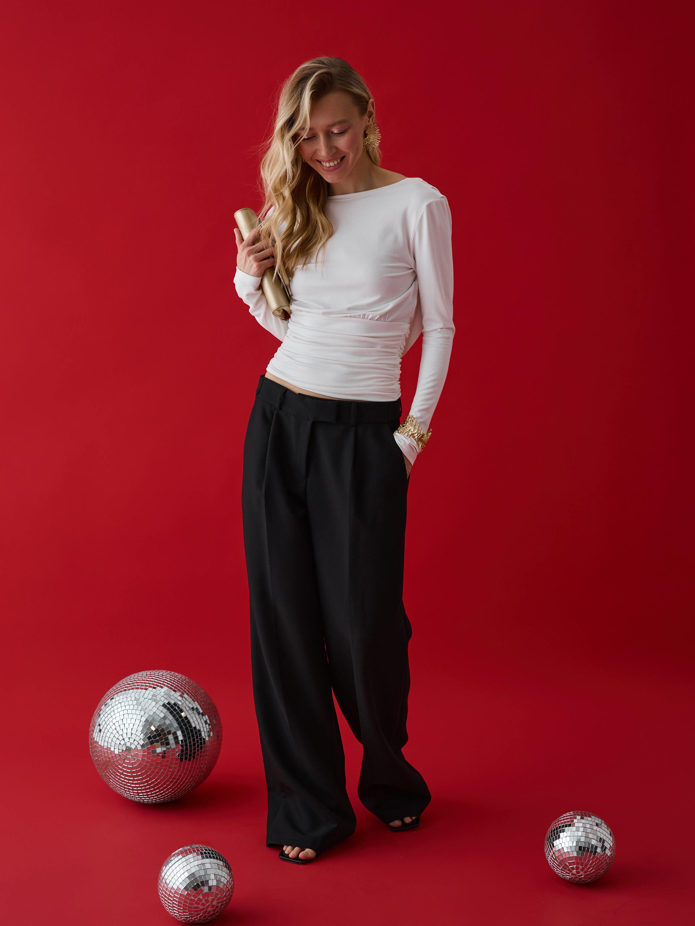 Мягкий и приятный телу материал обеспечивает отличный теплообмен и воздухопроницаемость, благодаря чему долгое ношение не вызывает дискомфорта. Этот женственный лонгслив формирует обтягивающий силуэт, изящно драпируется со спущенными длинными рукавами и сборками, добавляя образу особую изысканность. Красивый однотонный черный цвет подчеркнет свежесть и элегантность в любой ситуации.