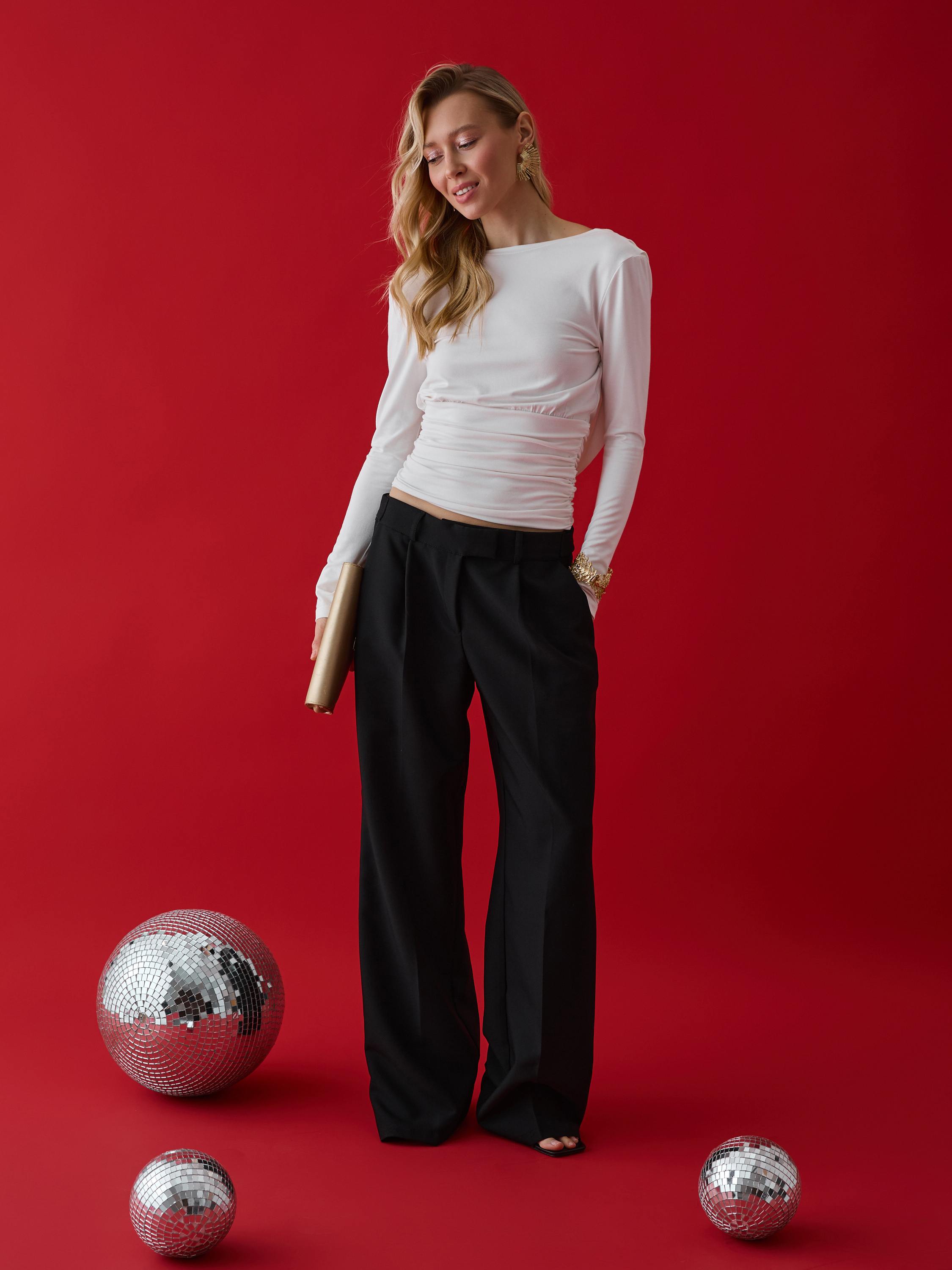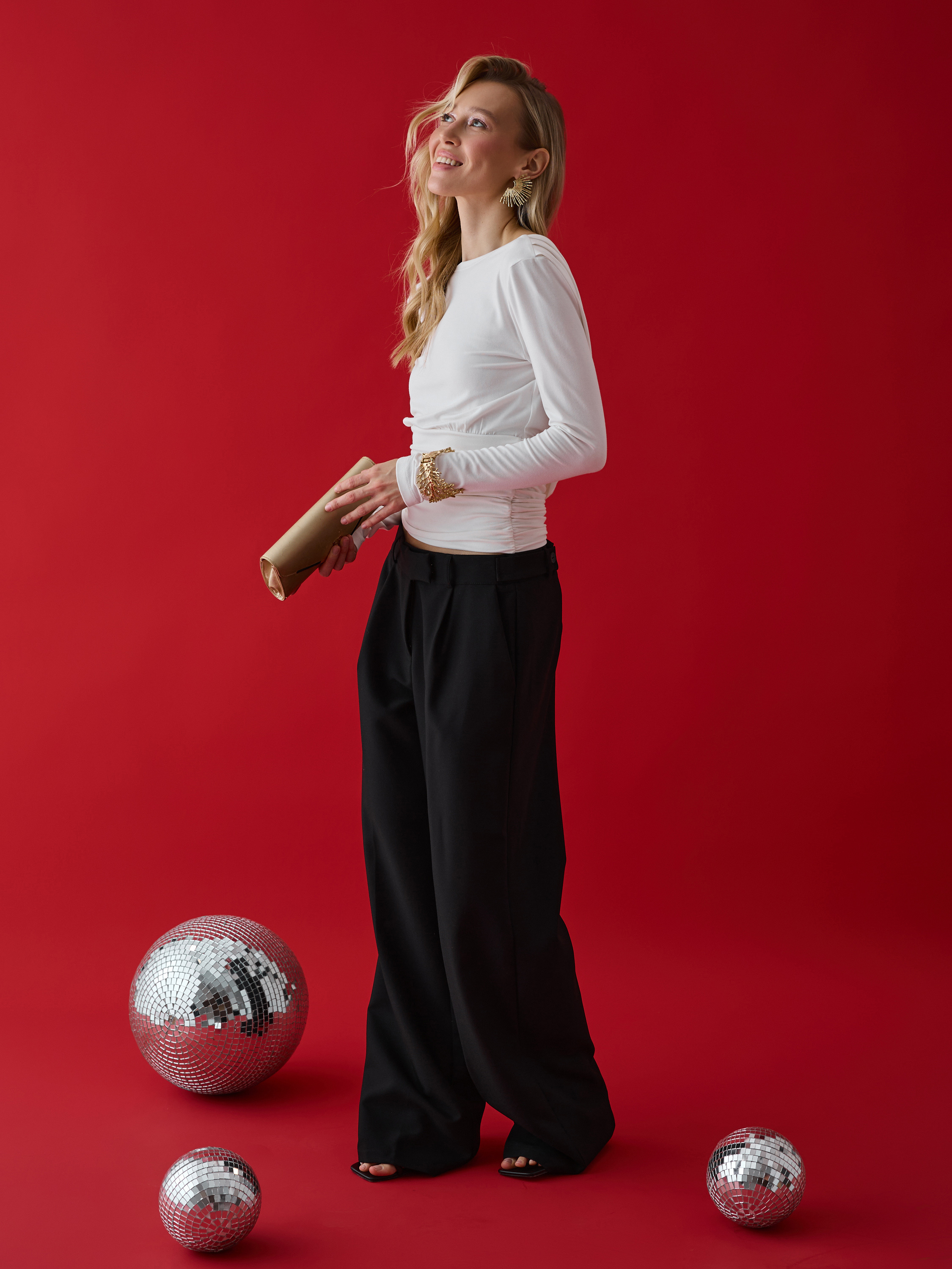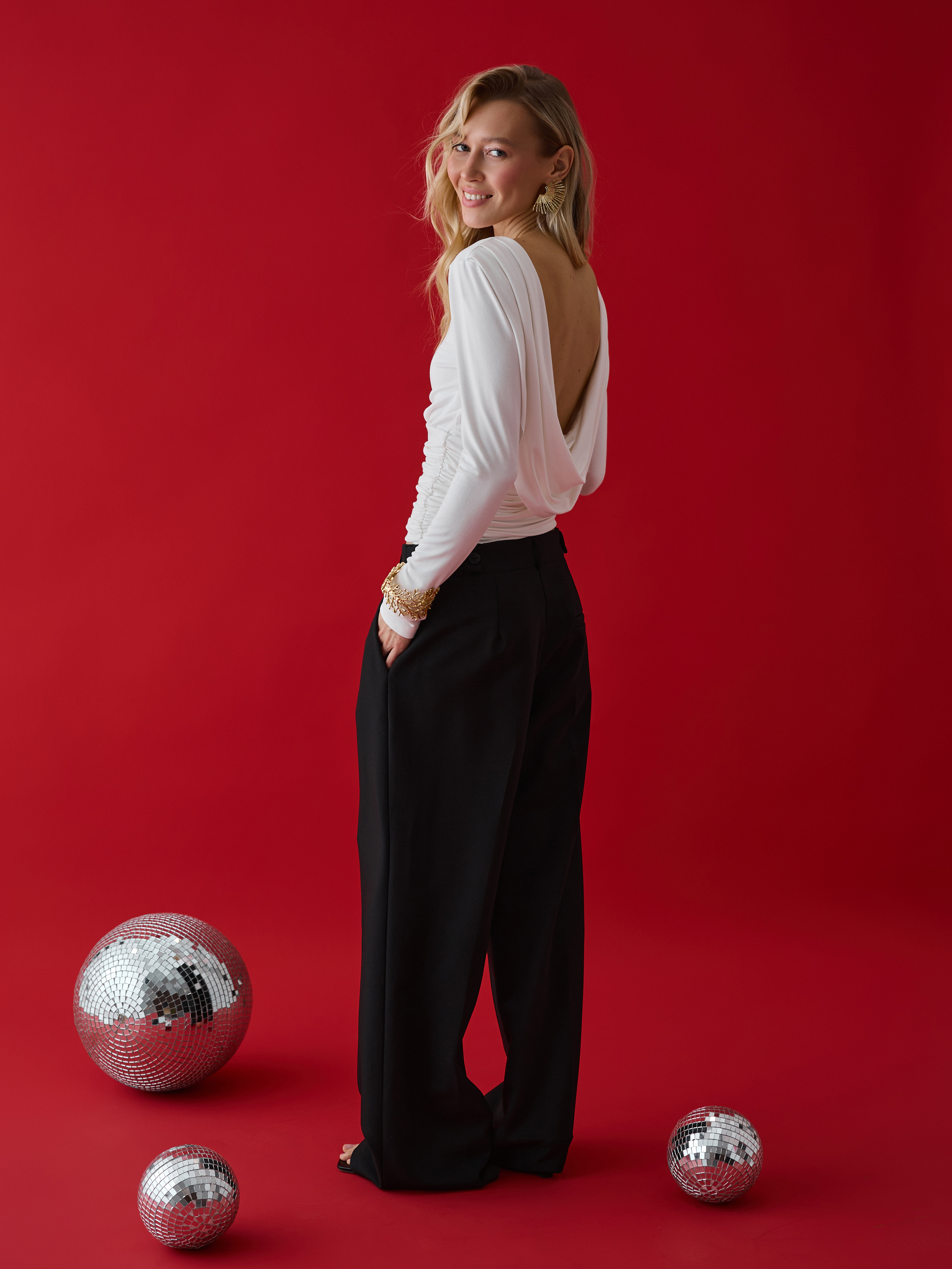 Длинные рукава и открытая спинка топа гармонично сочетаются, создавая нарядный вечерний образ с эффектом легкой обтяжки и красивой структуры. Этот лонгслив из вискозы — выбор для тех, кто рассчитывает выглядеть стильно, женственно и дорого в новогоднюю ночь, в день рождения или другие праздничные случаи. В нем чувствуешь заботу о теле и комфорт, одновременно сохраняя эффектность и изысканность.