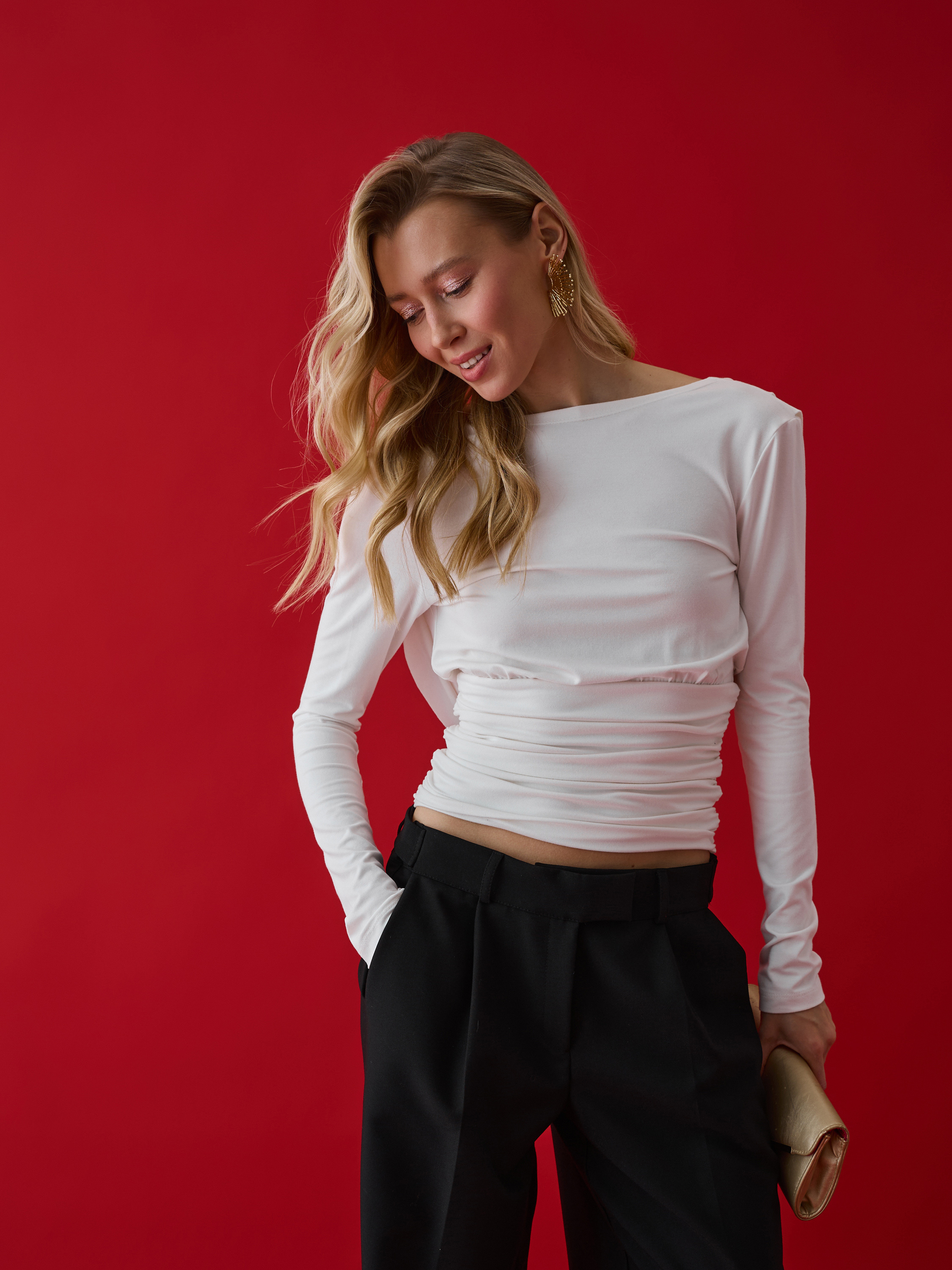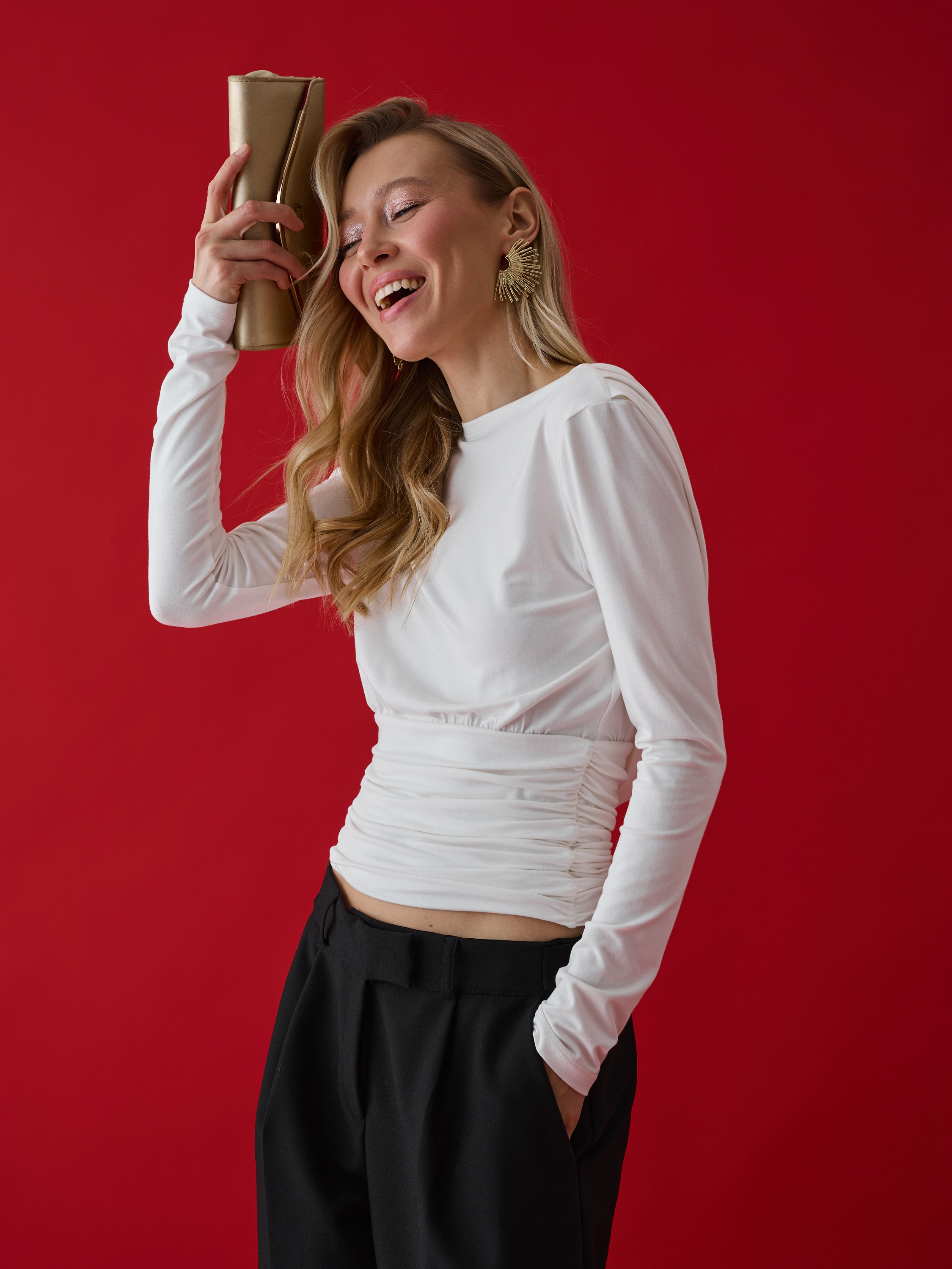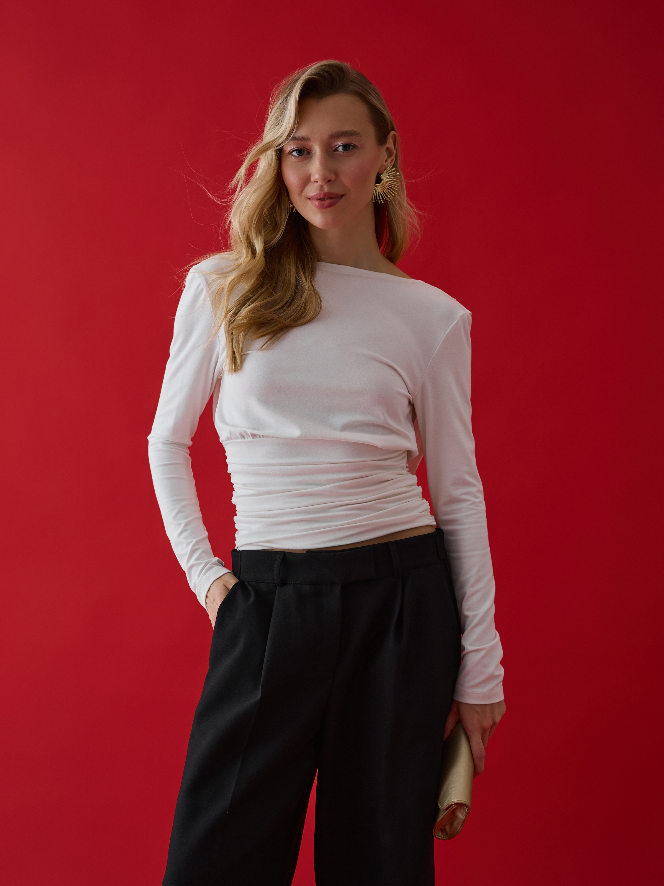 Длинные рукава и открытая спинка топа гармонично сочетаются, создавая нарядный вечерний образ с эффектом легкой обтяжки и красивой структуры. Этот лонгслив из вискозы — выбор для тех, кто рассчитывает выглядеть стильно, женственно и дорого в новогоднюю ночь, в день рождения или другие праздничные случаи. В нем чувствуешь заботу о теле и комфорт, одновременно сохраняя эффектность и изысканность.