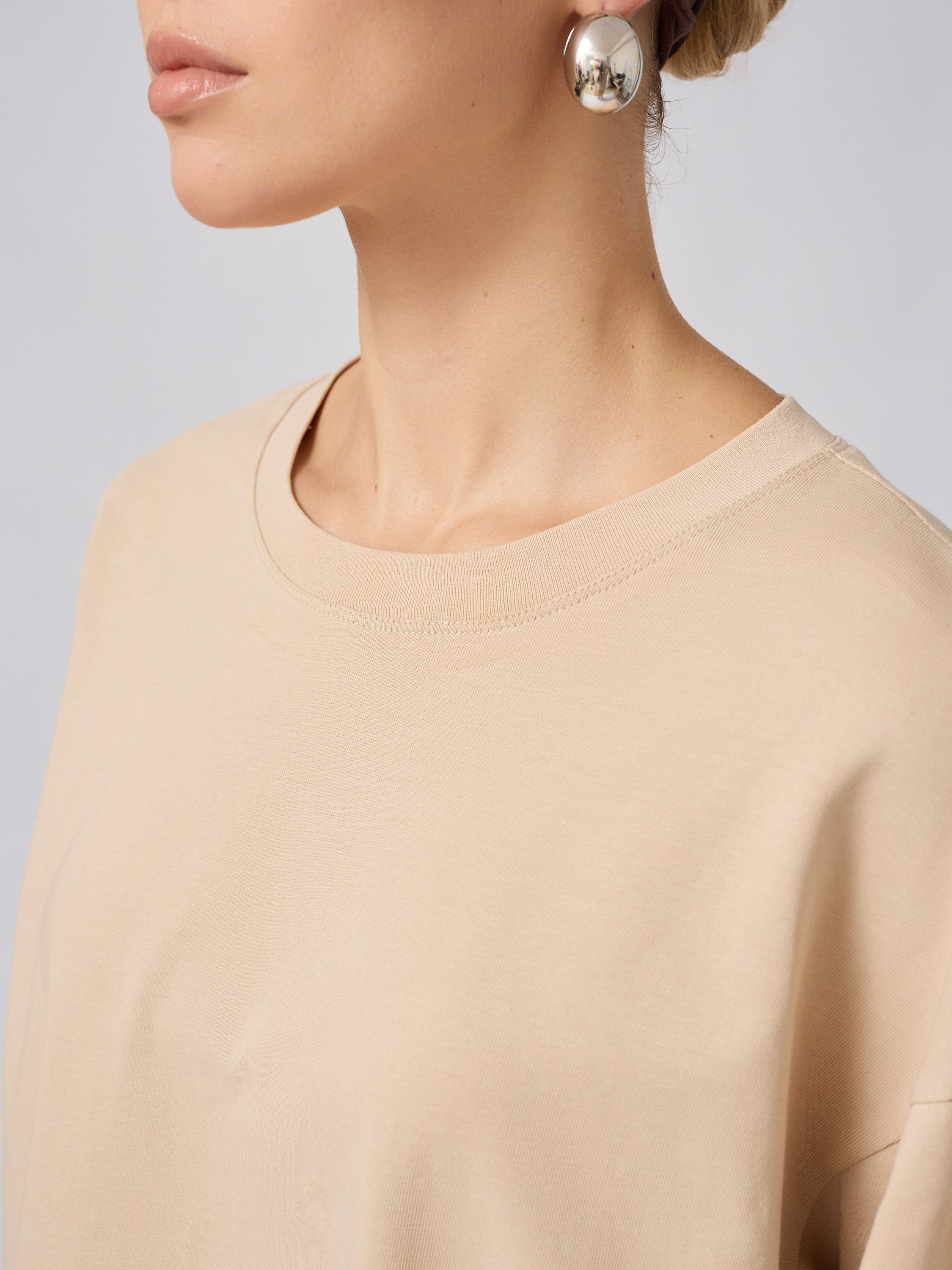 Этот базовый элемент гардероба станет надежной альтернативой облегающему свитшоту или толстовке благодаря свободному крою оверсайз. Он создает расслабленный образ, который легко сочетать с любыми предметами одежды для создания модных стилизаций. Лаконичная линия плеч и прямой крой делают модель максимально универсальной для любых ситуаций.
