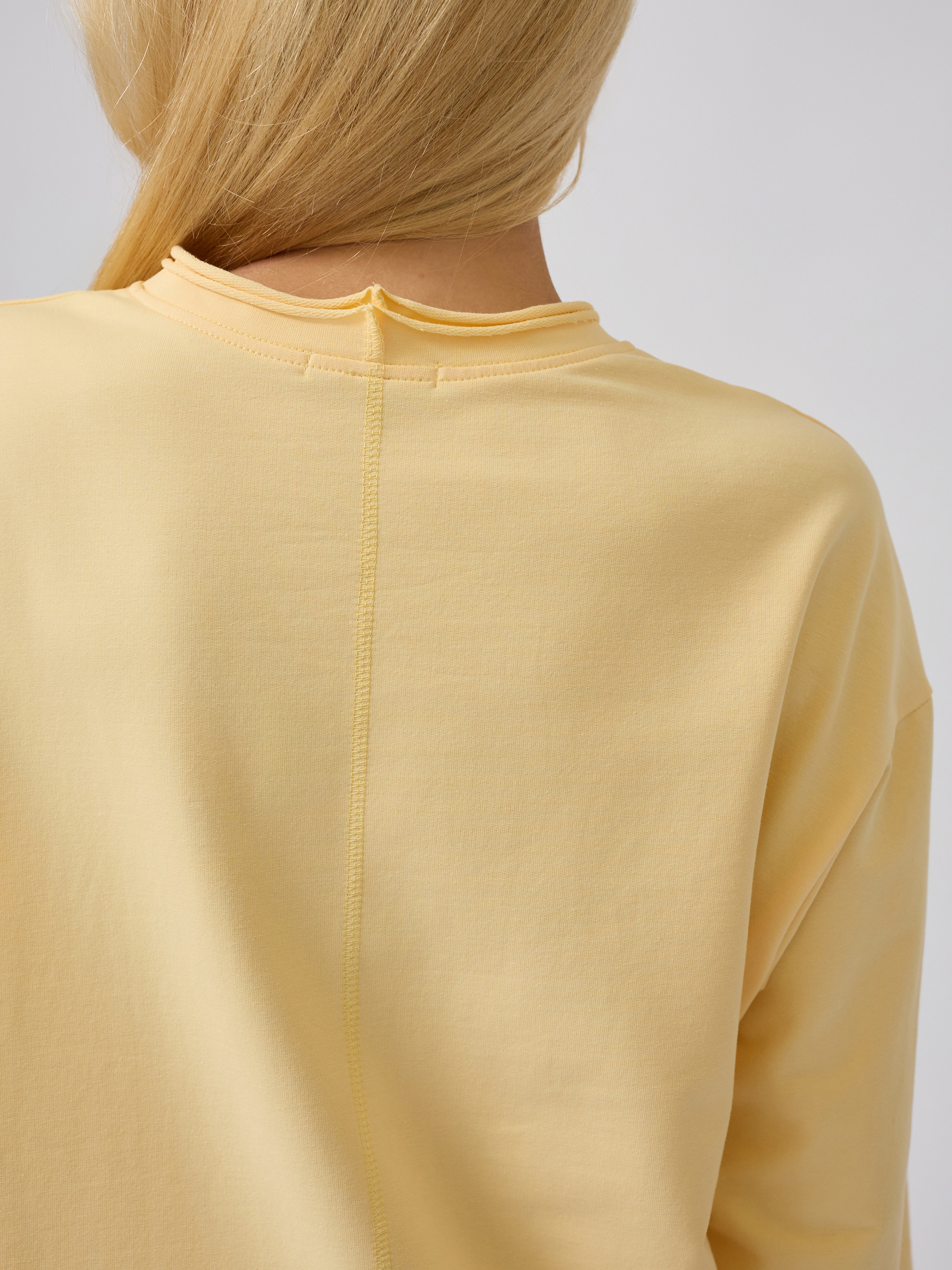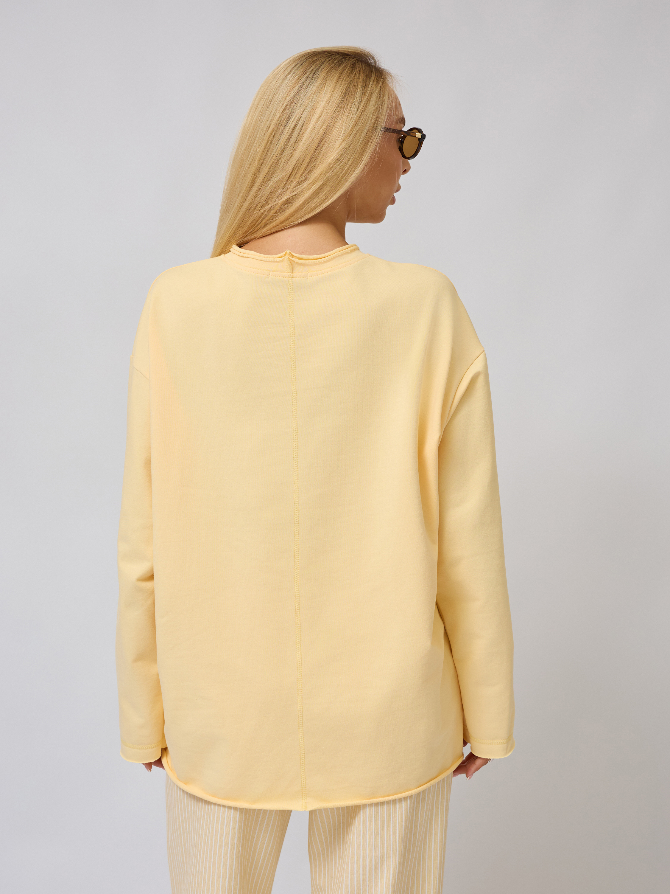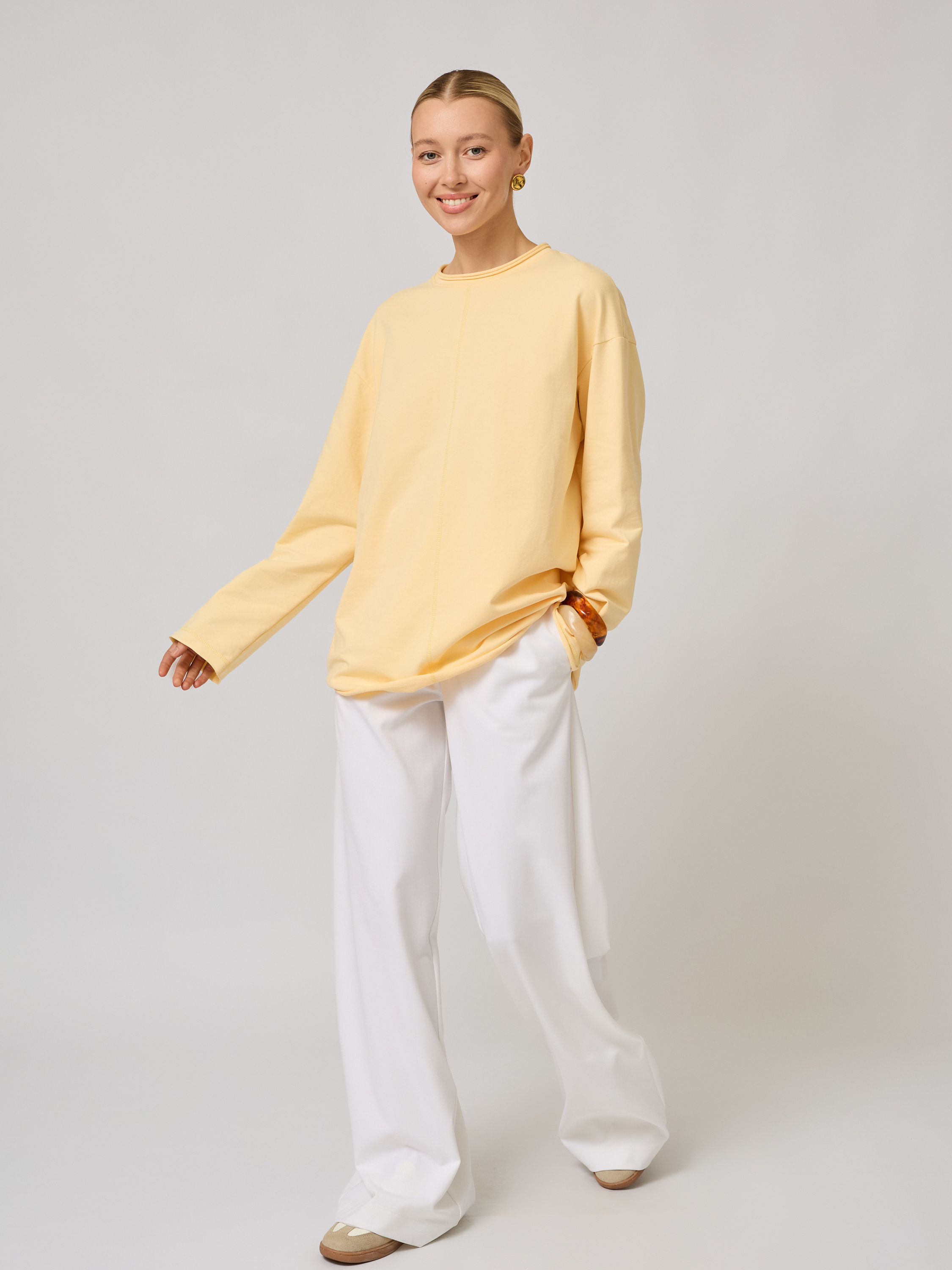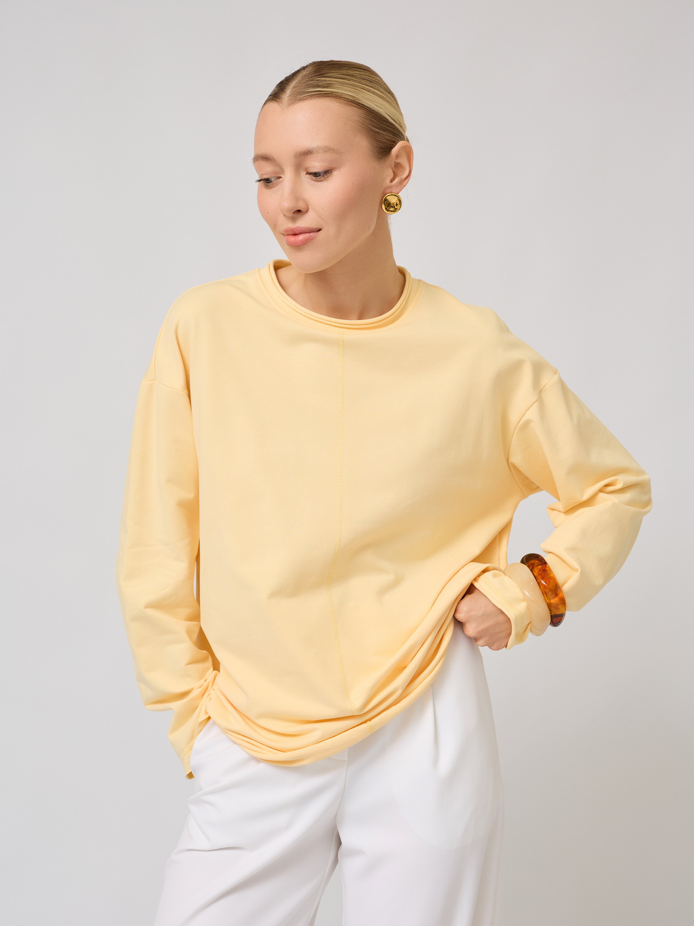 Стильный женский лонгслив в светло-желтом оттенке — идеальный выбор для тех, кто ценит комфорт и современные модные решения. Базовая модель с удлиненной формой и свободным кроем отлично подходит для повседневного ношения или создания стильных образов на вечер. Натуральный мягкий хлопок обеспечивает приятные ощущения на коже, а трикотажное полотно позволяет изделию "дышать", что делает его особенно комфортным даже в жаркие дни.