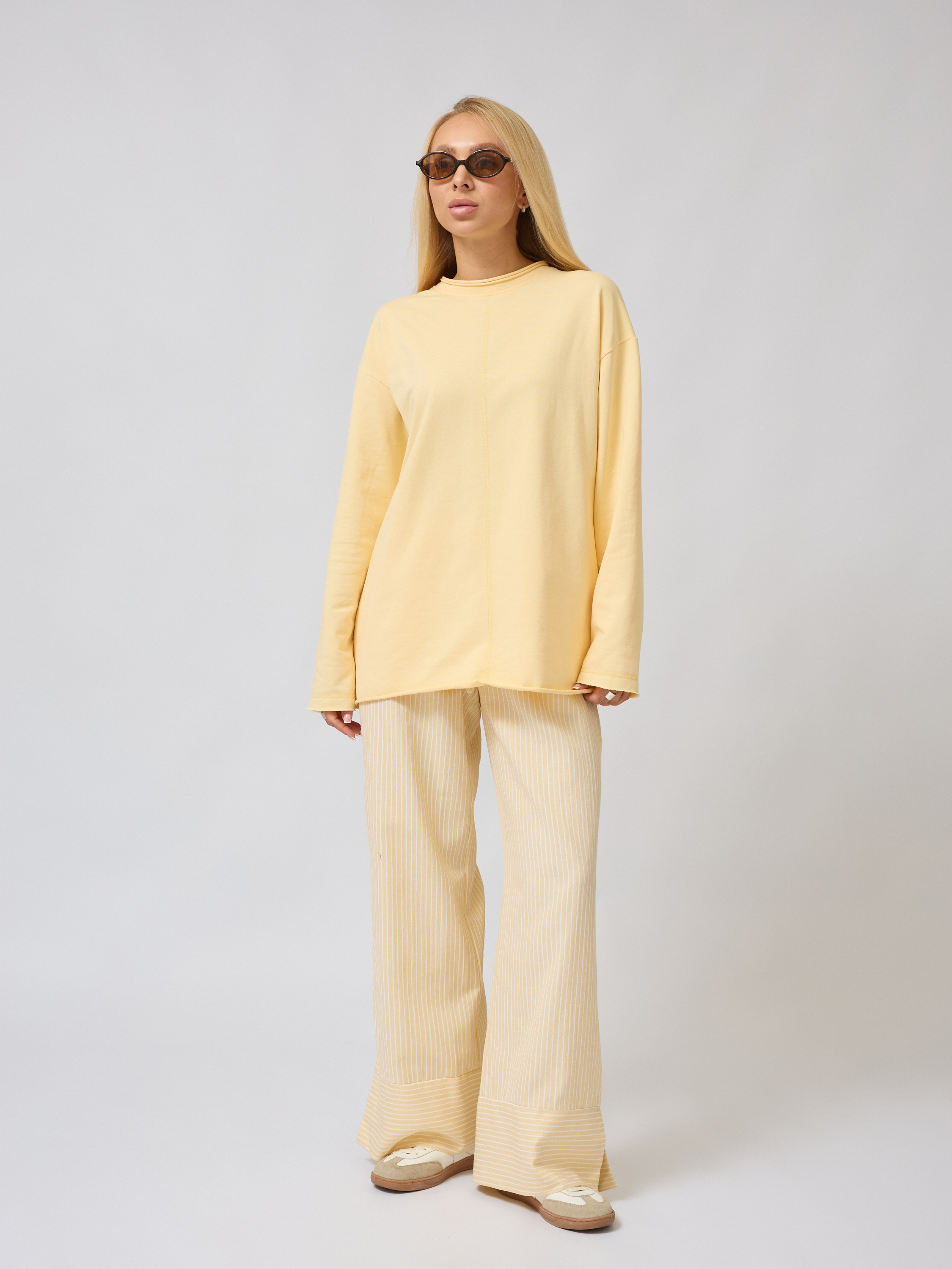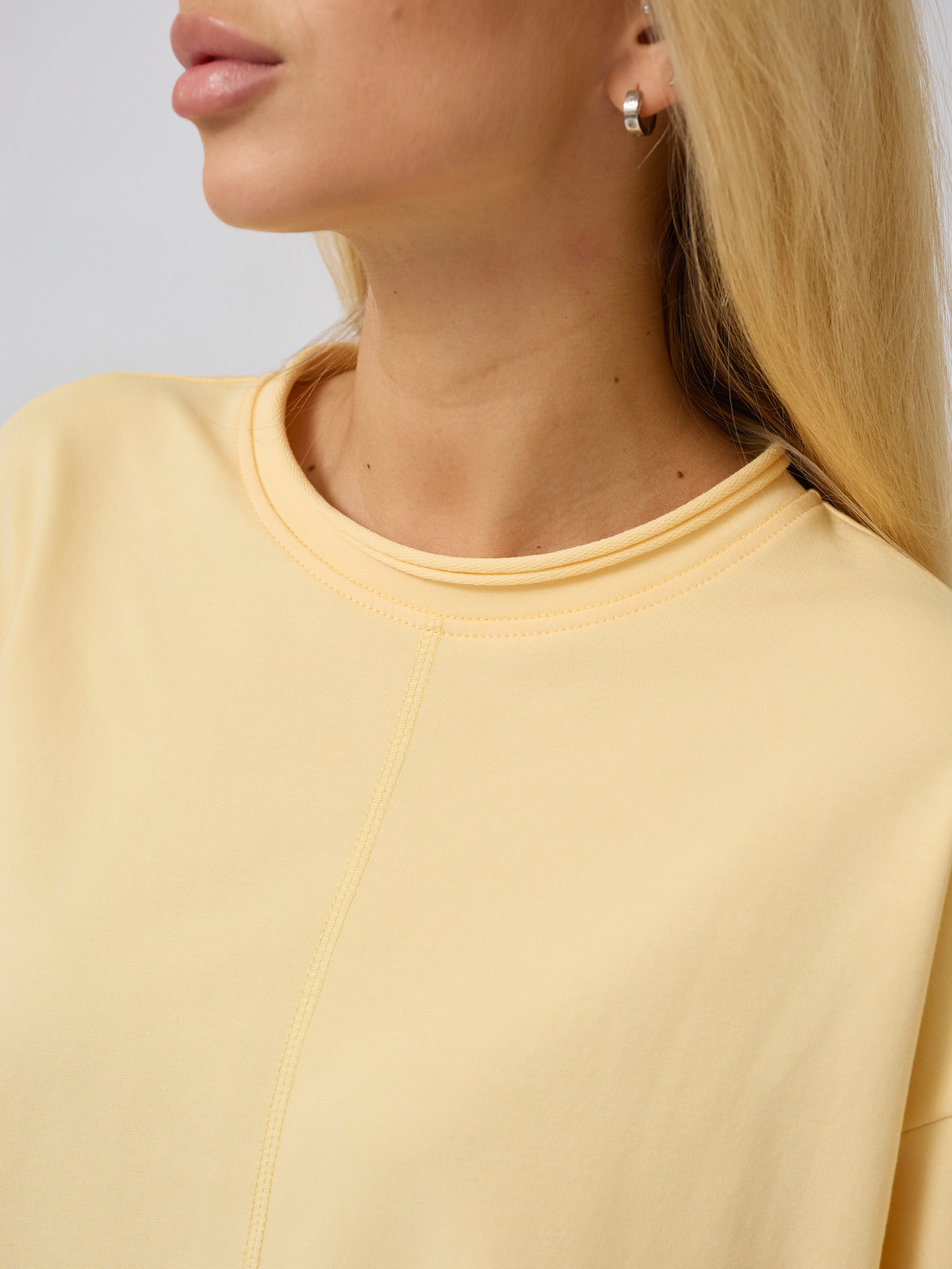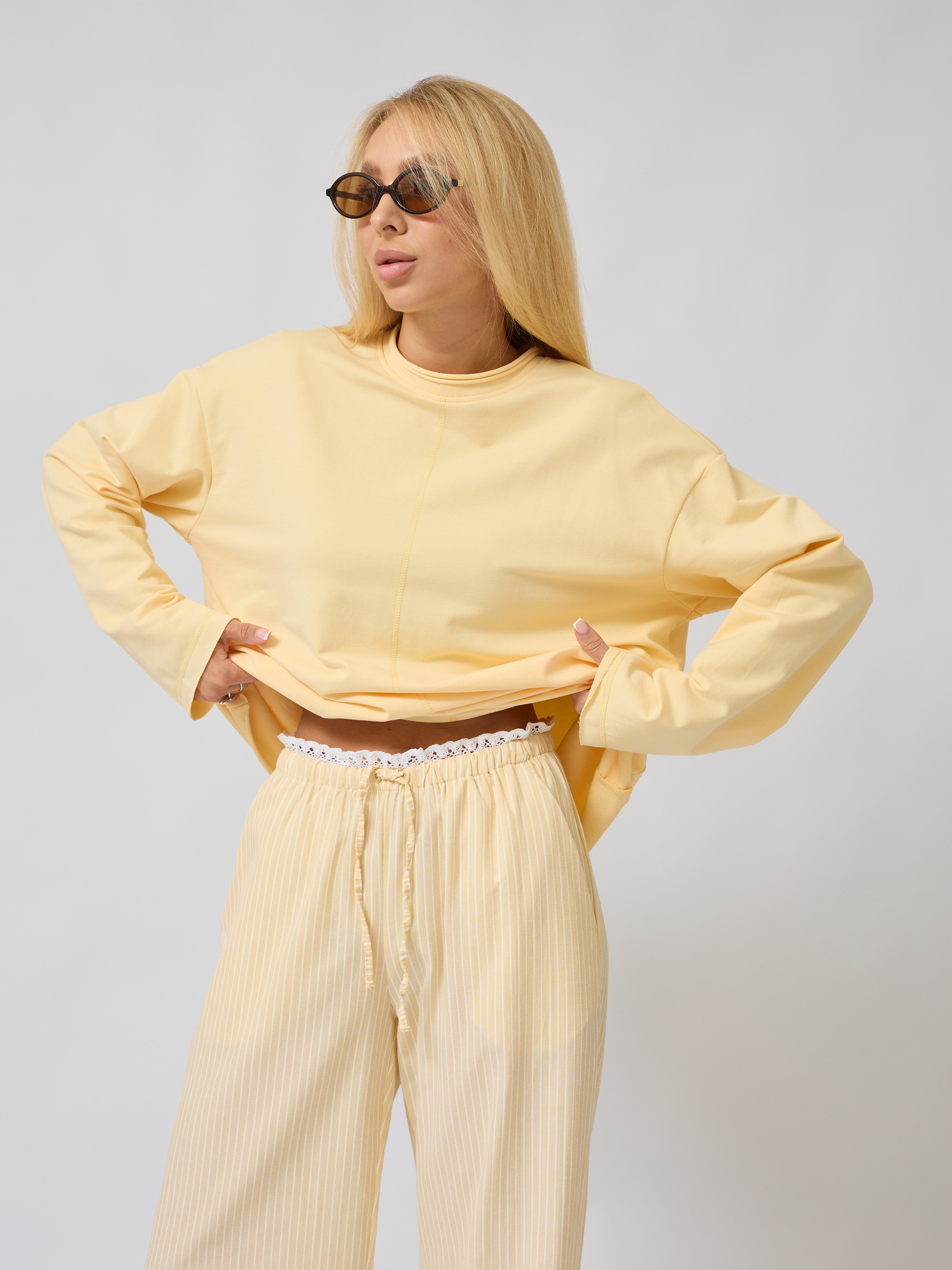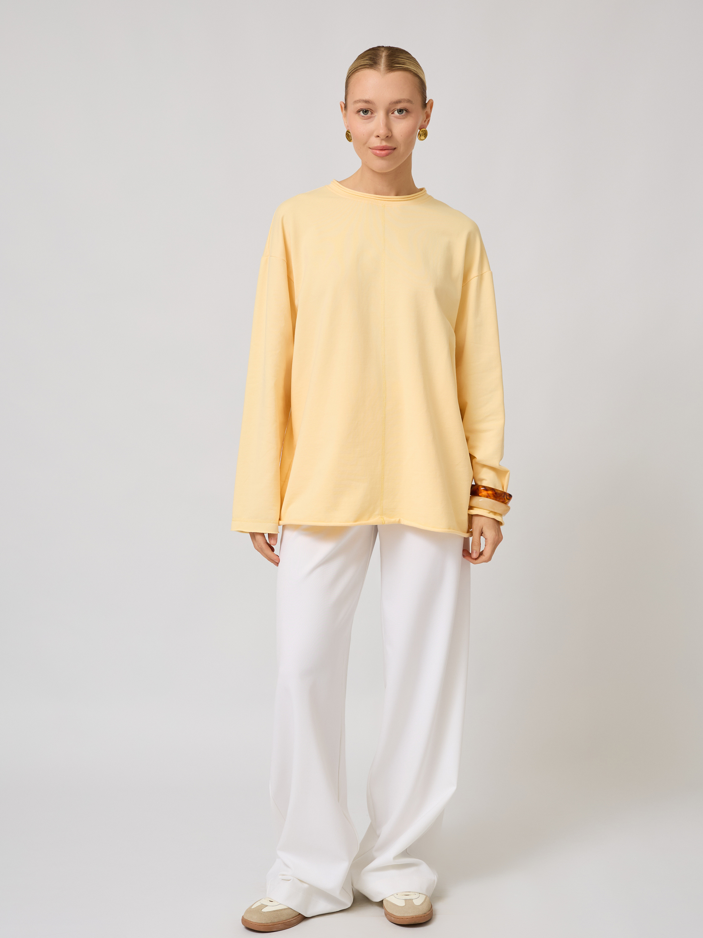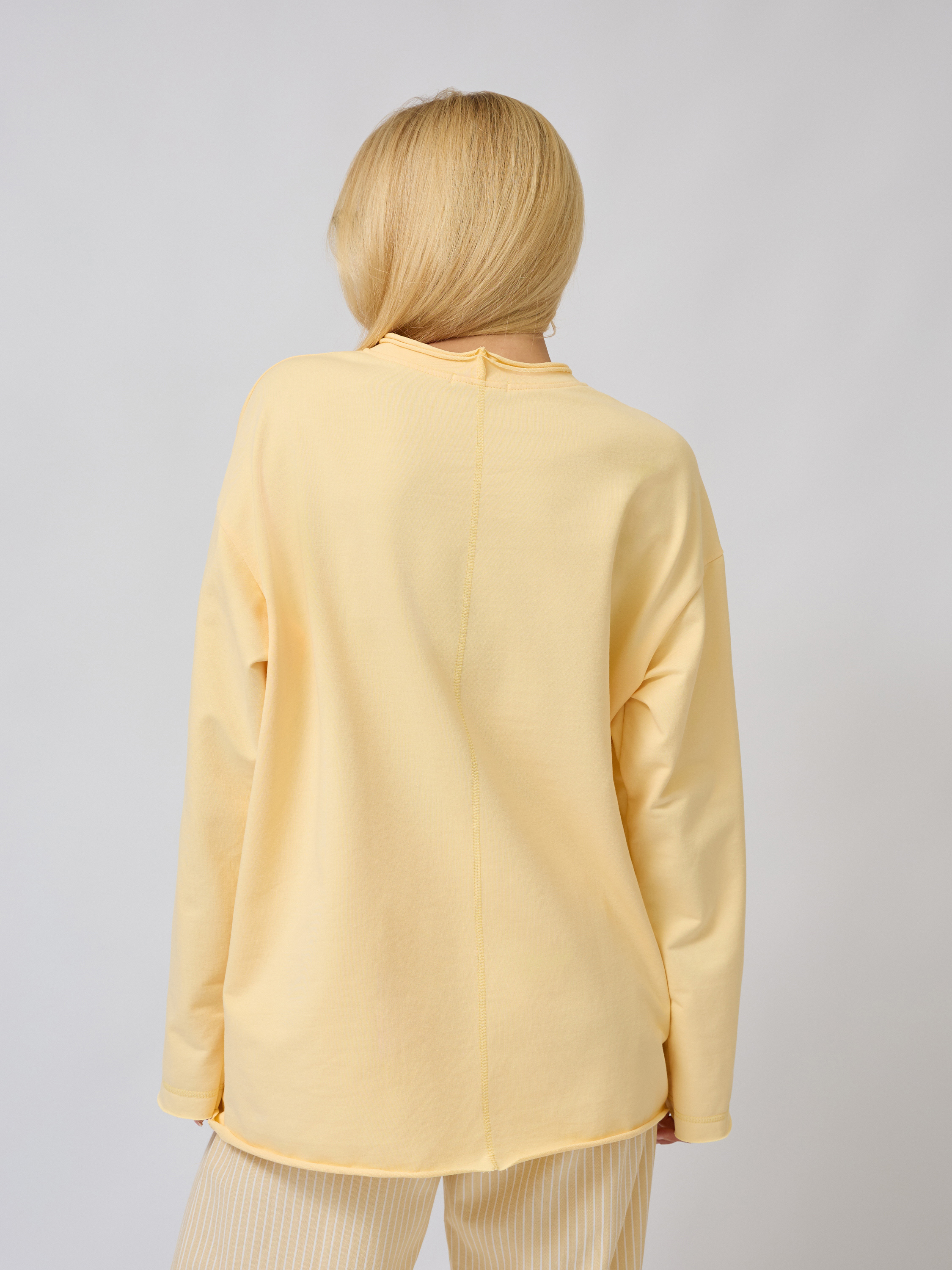 Стильный женский лонгслив в светло-желтом оттенке — идеальный выбор для тех, кто ценит комфорт и современные модные решения. Базовая модель с удлиненной формой и свободным кроем отлично подходит для повседневного ношения или создания стильных образов на вечер. Натуральный мягкий хлопок обеспечивает приятные ощущения на коже, а трикотажное полотно позволяет изделию "дышать", что делает его особенно комфортным даже в жаркие дни.