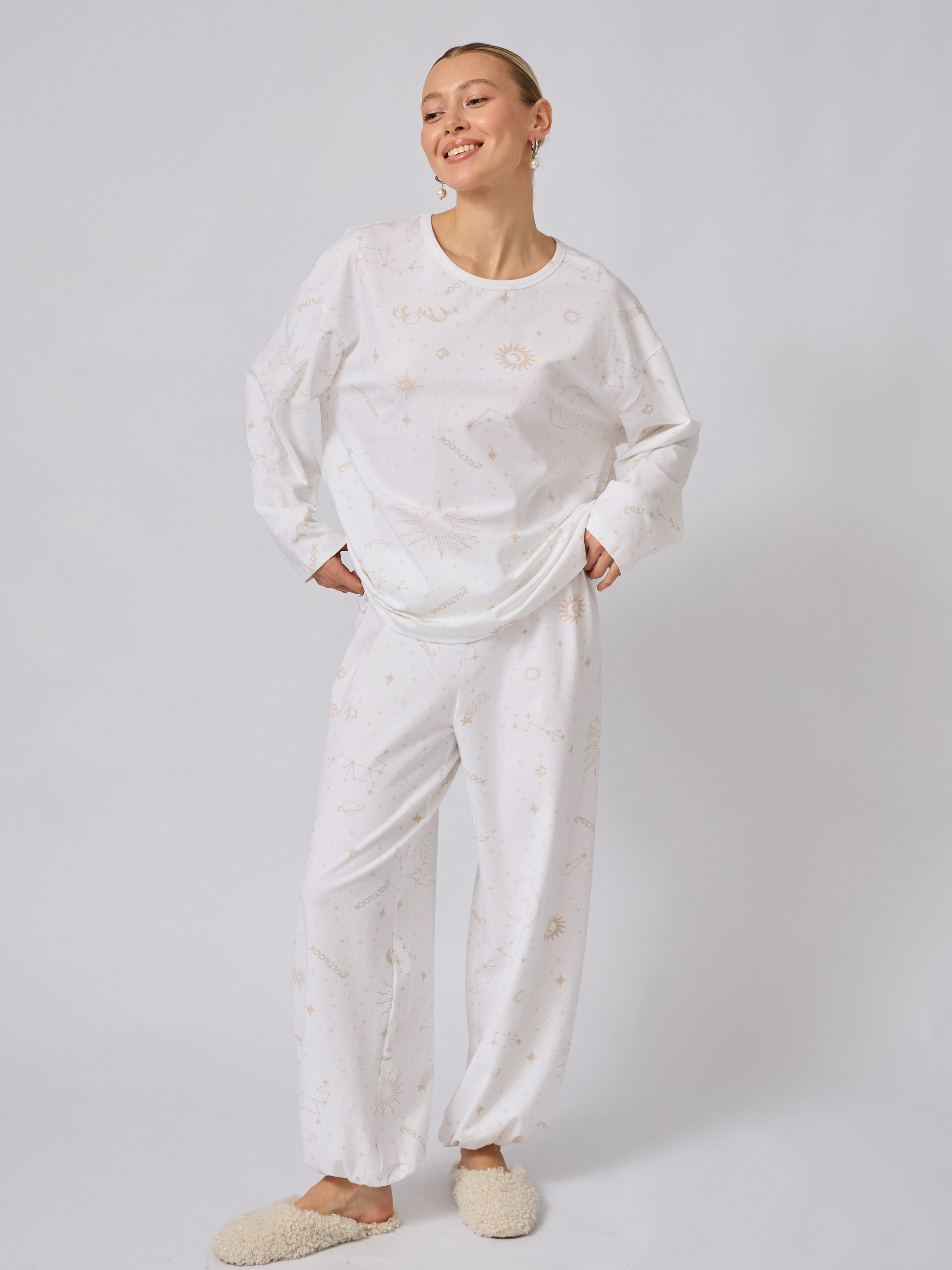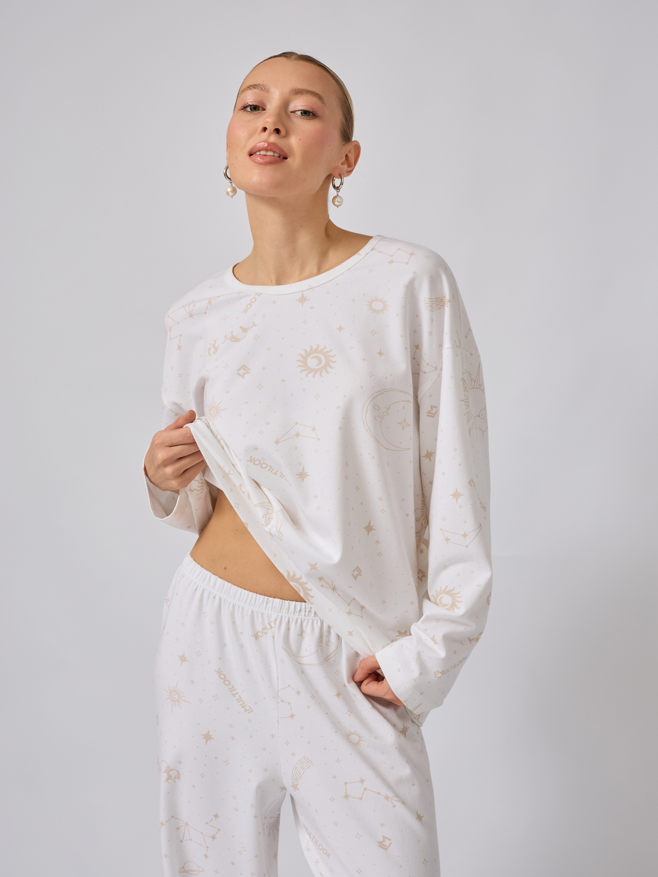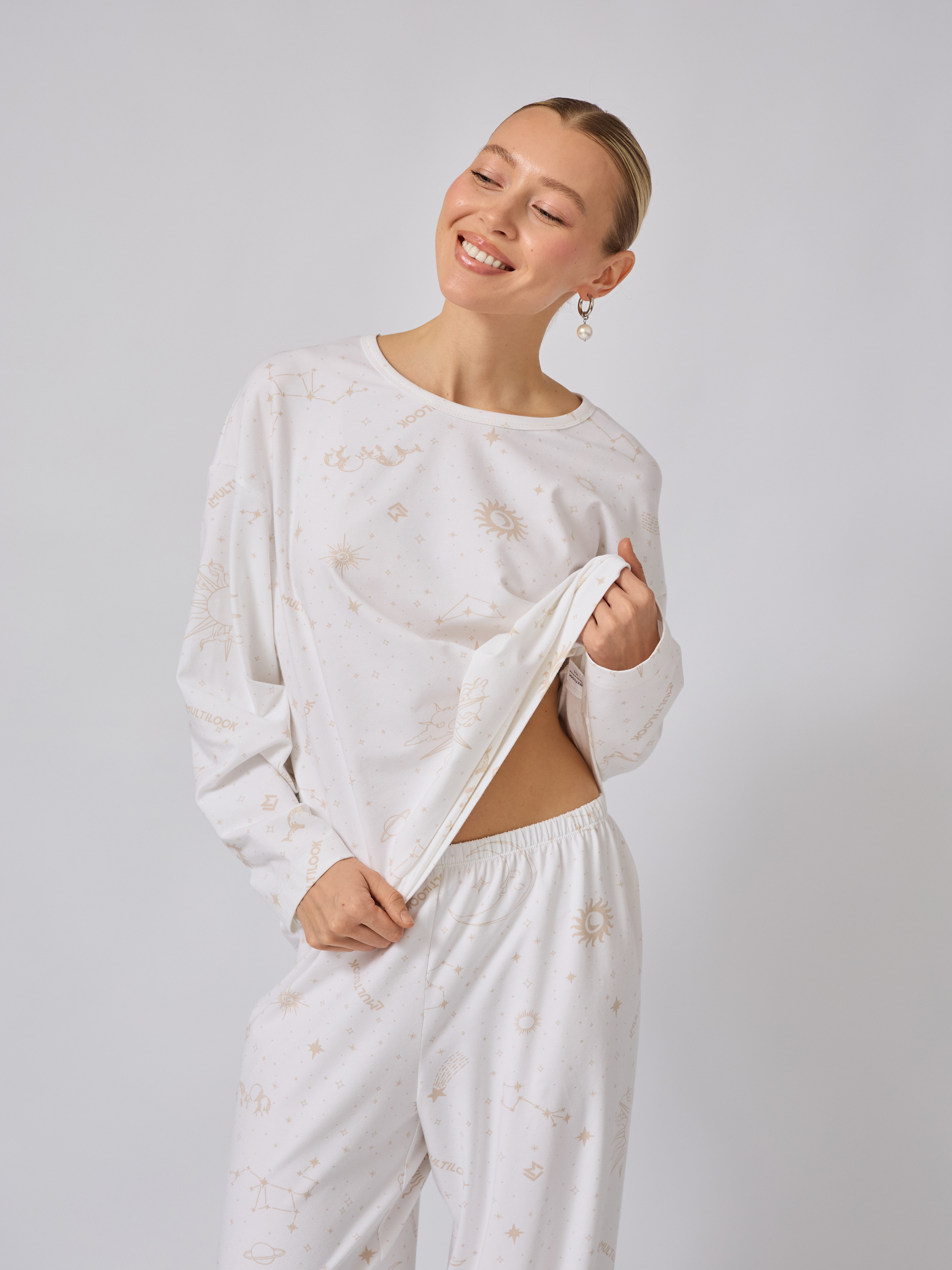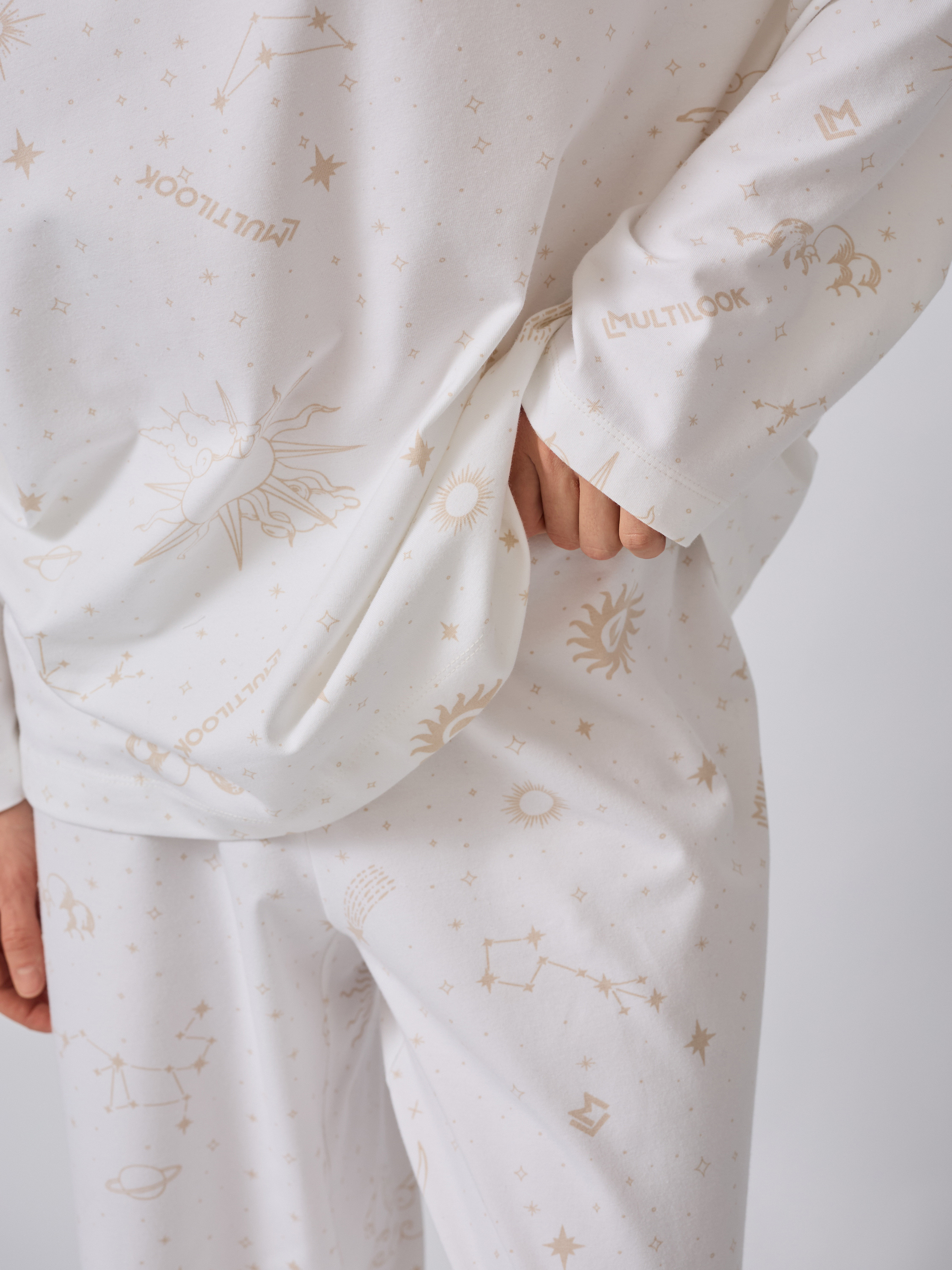 Этот женский комплект с лонгсливом и брюками — идеальный выбор для праздничного времени. Нарядный молочный цвет с дизайнерским принтом зодиак в стиле бренда Multilook вносит праздничное настроение, делая эту пижаму не только удобной, но и стильной. Выполнена из мягкого трикотажного хлопка с добавлением лайкры, что обеспечивает комфорт во время сна и отдыха. Мягкая ткань обладает тактильными ощущениями приятными для кожи, благодаря чему эта домашняя одежда становится незаменимой в преддверии Нового года.