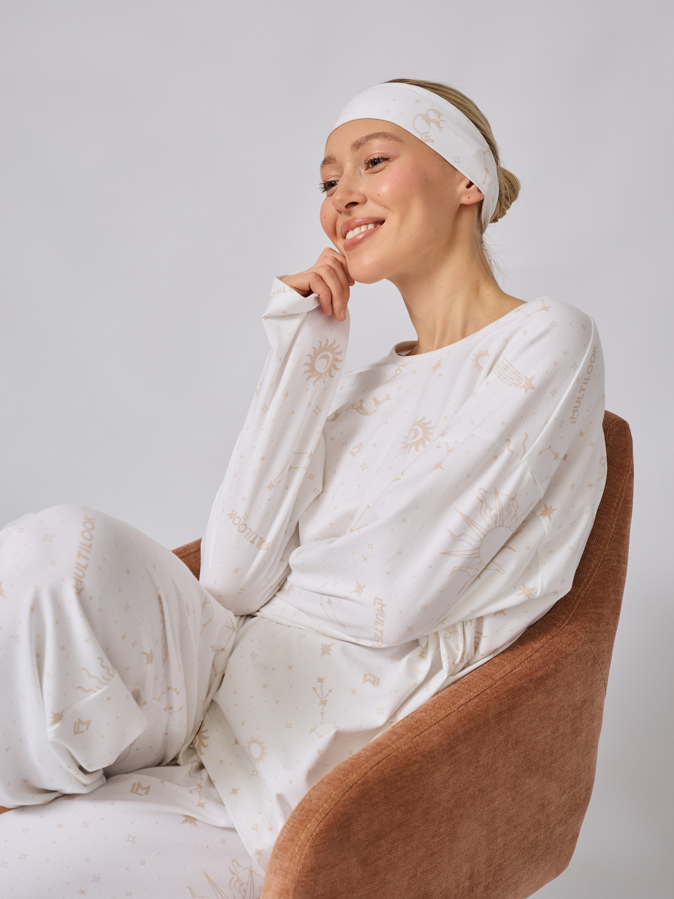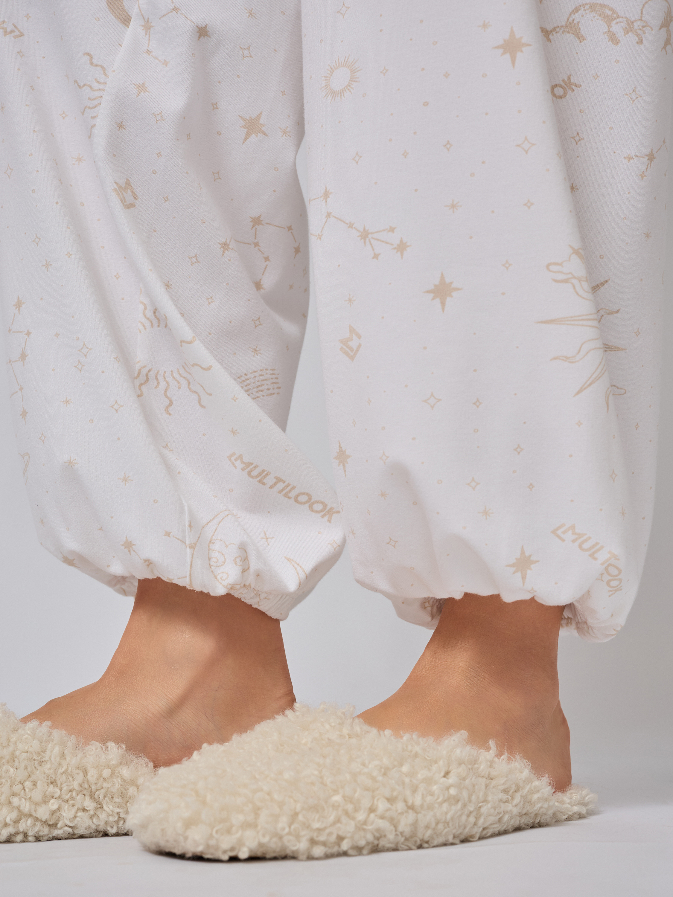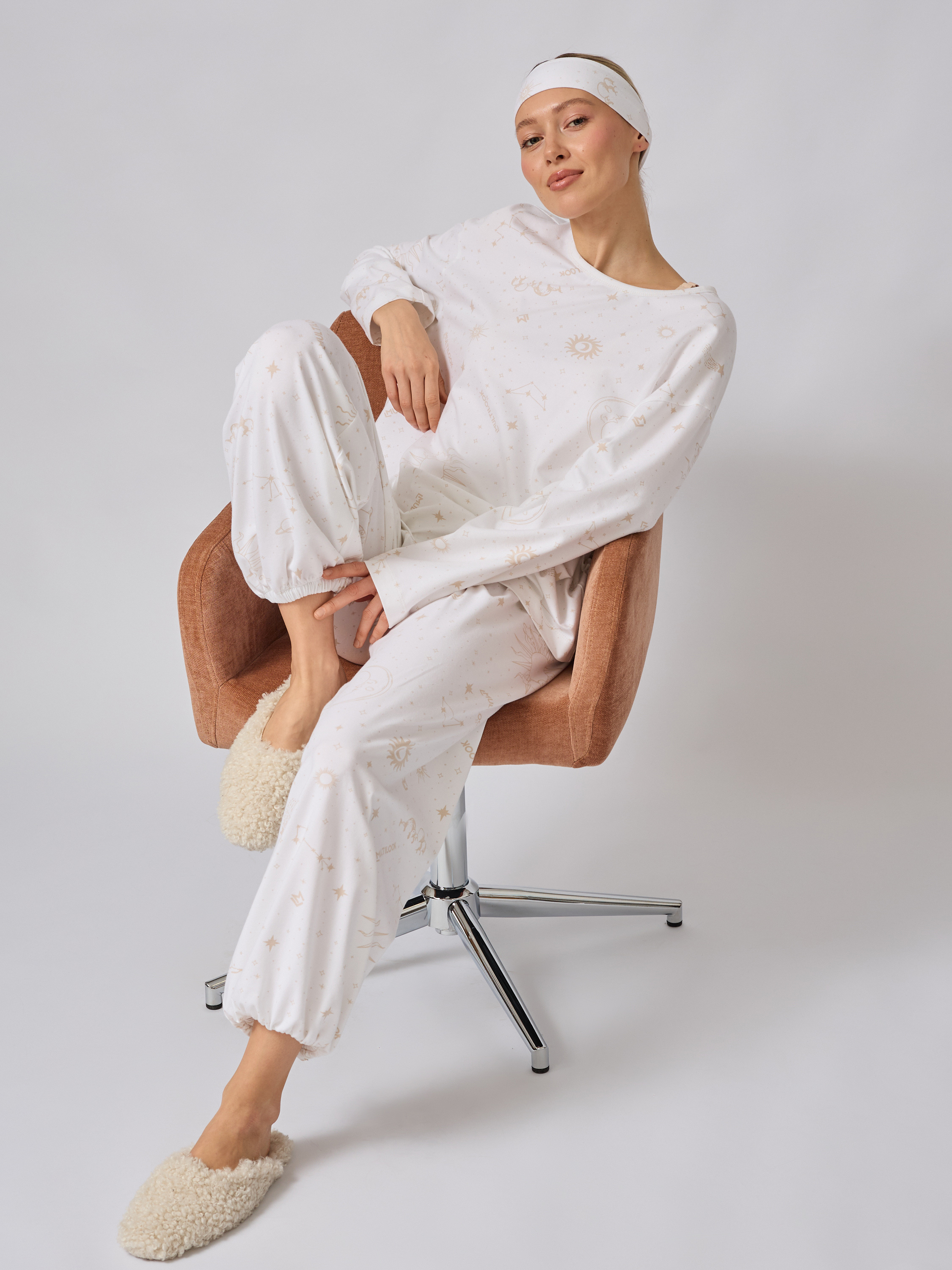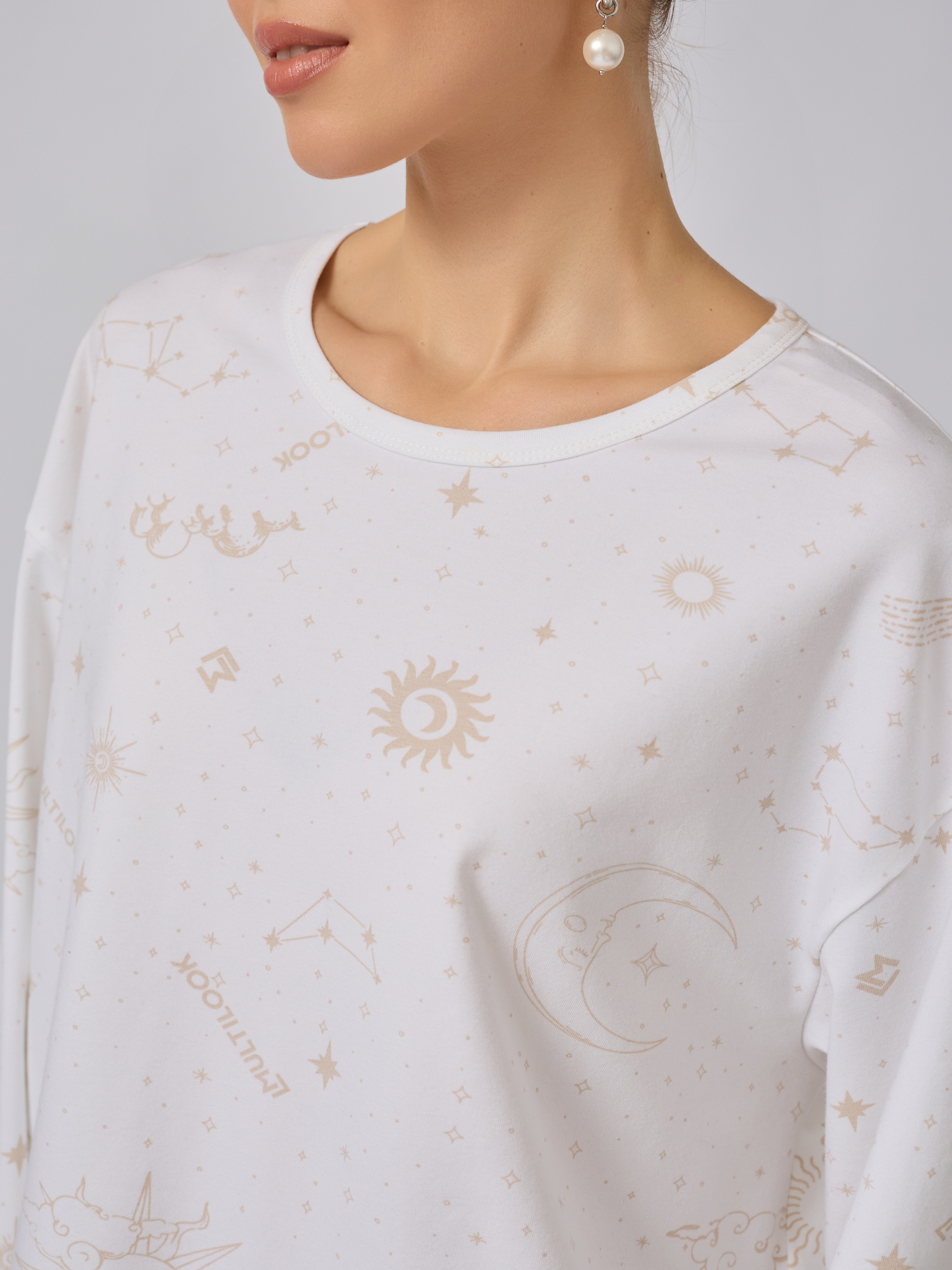 Этот женский комплект с лонгсливом и брюками — идеальный выбор для праздничного времени. Нарядный молочный цвет с дизайнерским принтом зодиак в стиле бренда Multilook вносит праздничное настроение, делая эту пижаму не только удобной, но и стильной. Выполнена из мягкого трикотажного хлопка с добавлением лайкры, что обеспечивает комфорт во время сна и отдыха. Мягкая ткань обладает тактильными ощущениями приятными для кожи, благодаря чему эта домашняя одежда становится незаменимой в преддверии Нового года.