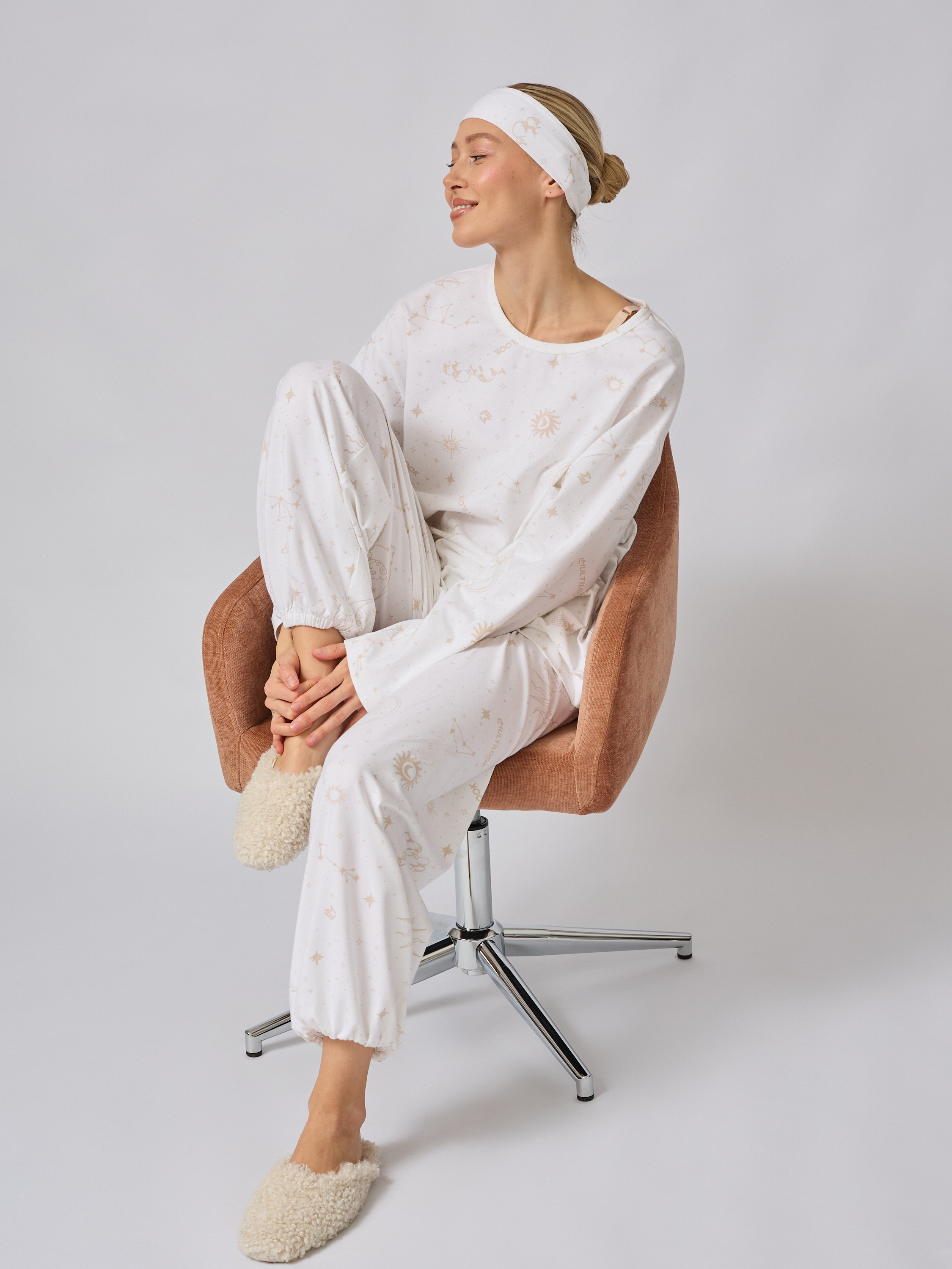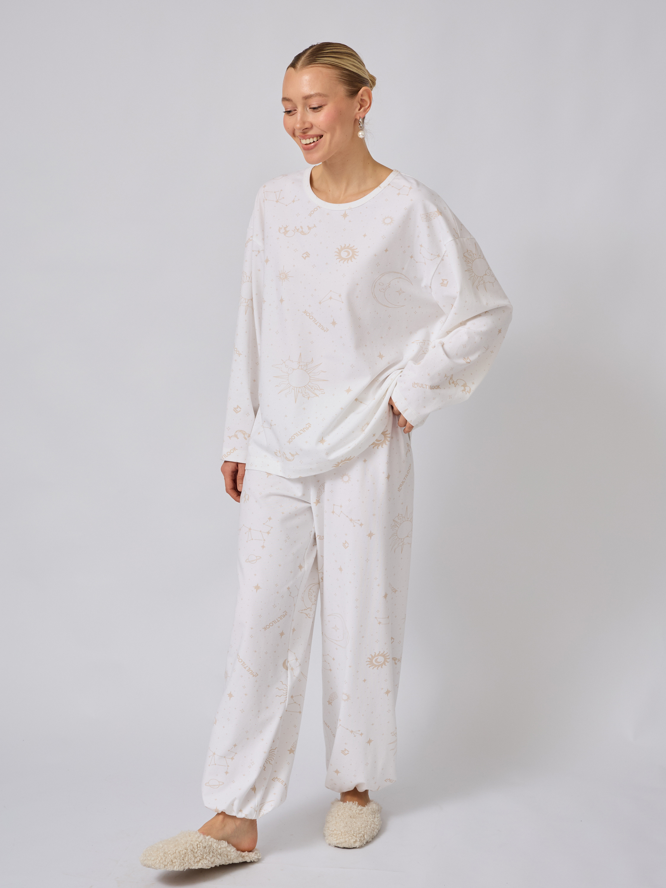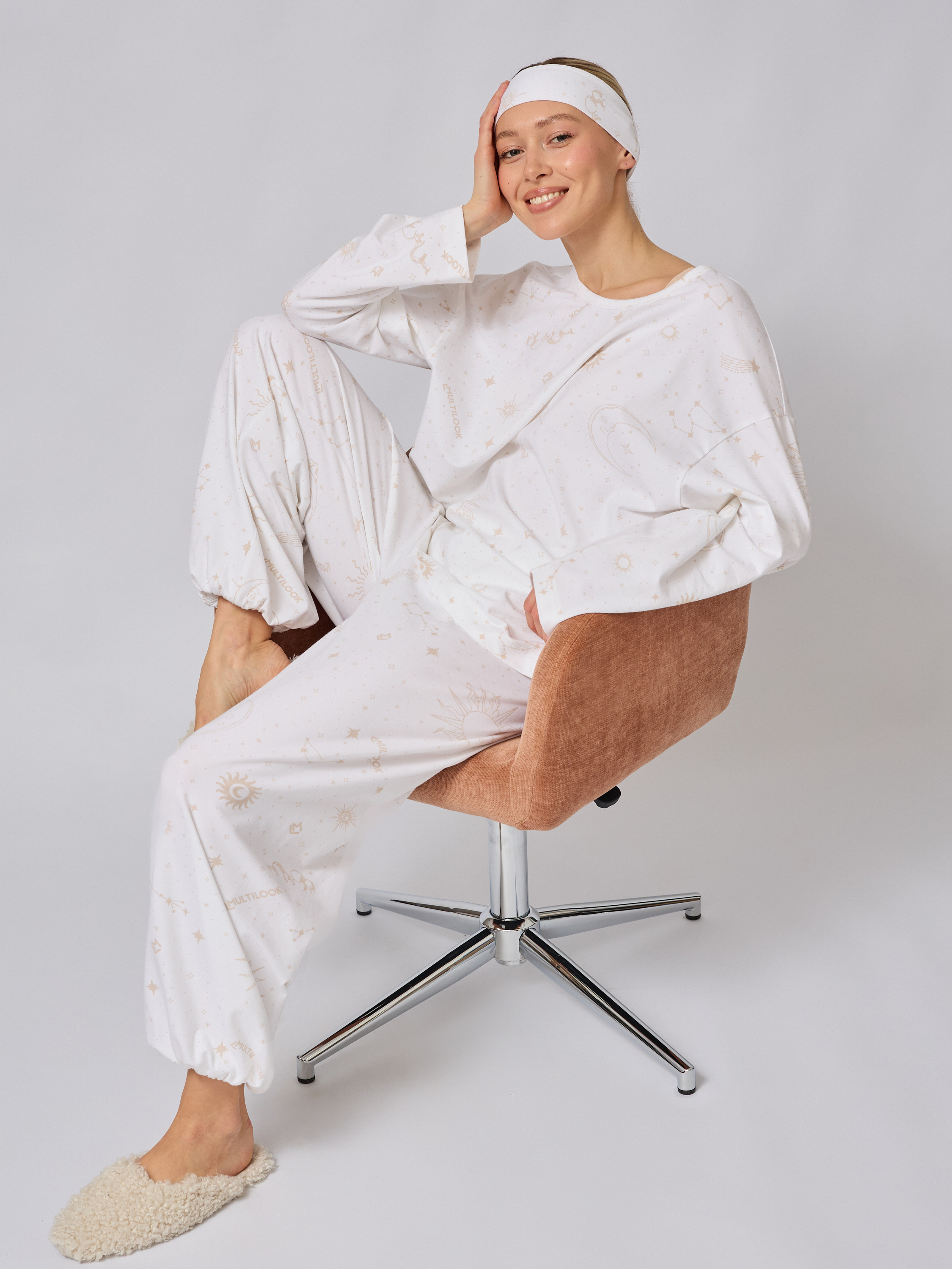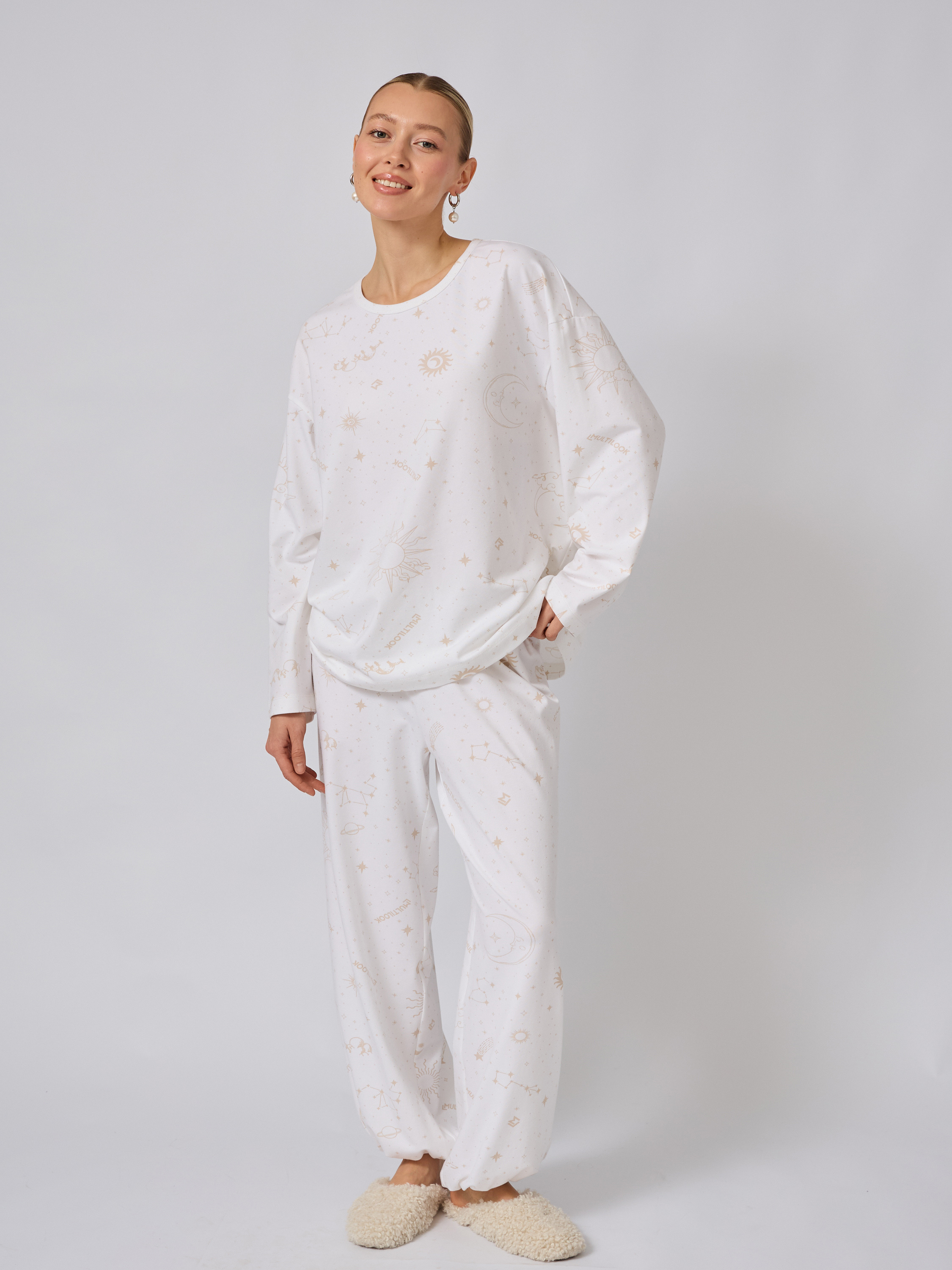 Этот женский комплект с лонгсливом и брюками — идеальный выбор для праздничного времени. Нарядный молочный цвет с дизайнерским принтом зодиак в стиле бренда Multilook вносит праздничное настроение, делая эту пижаму не только удобной, но и стильной. Выполнена из мягкого трикотажного хлопка с добавлением лайкры, что обеспечивает комфорт во время сна и отдыха. Мягкая ткань обладает тактильными ощущениями приятными для кожи, благодаря чему эта домашняя одежда становится незаменимой в преддверии Нового года.