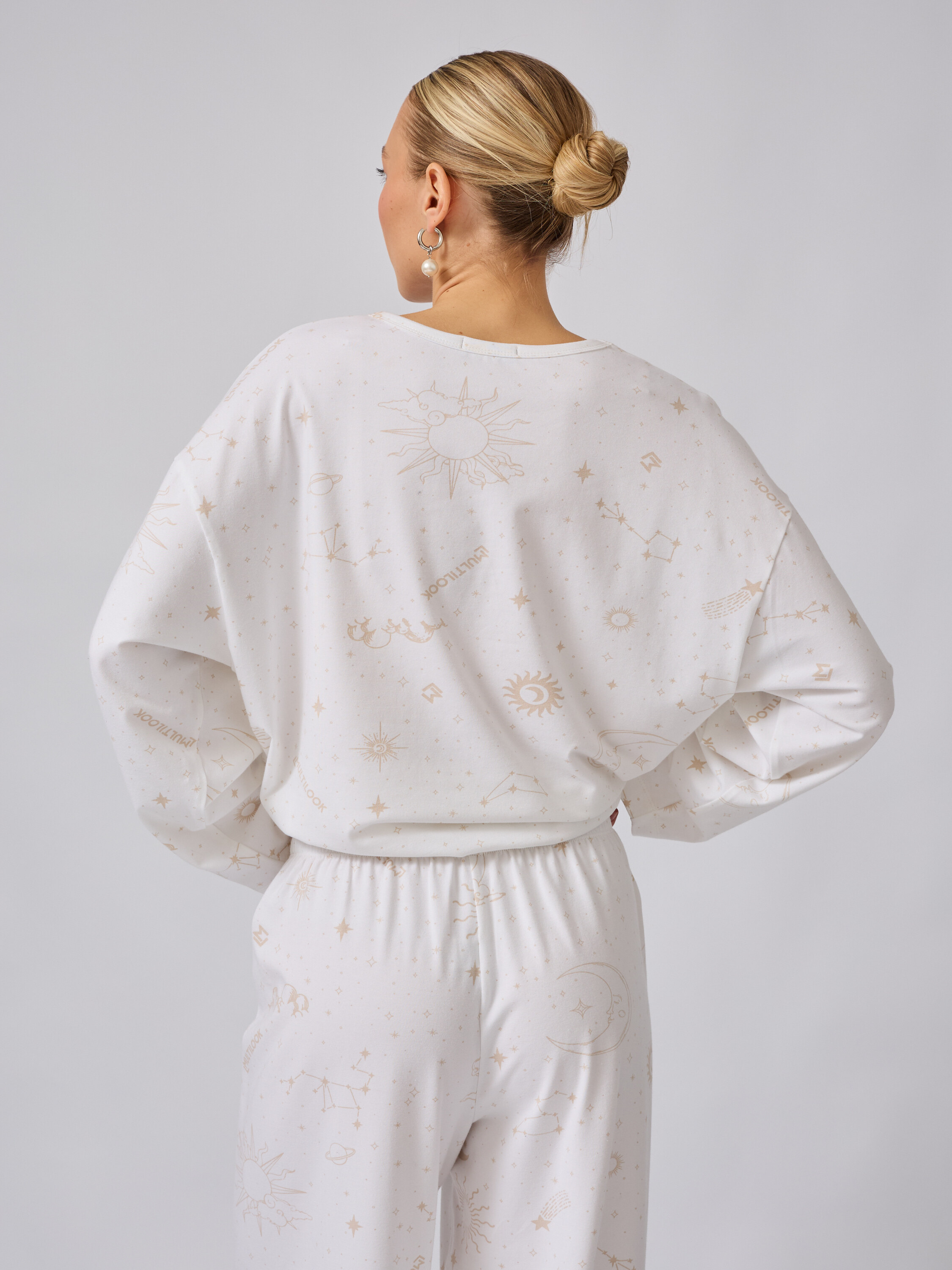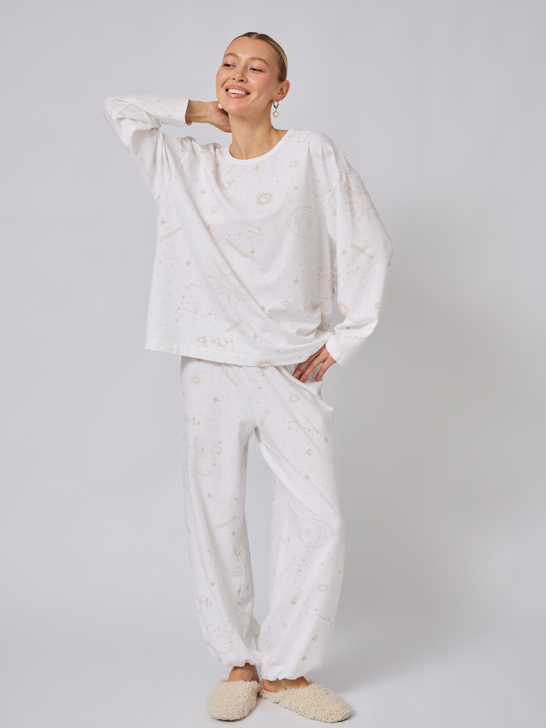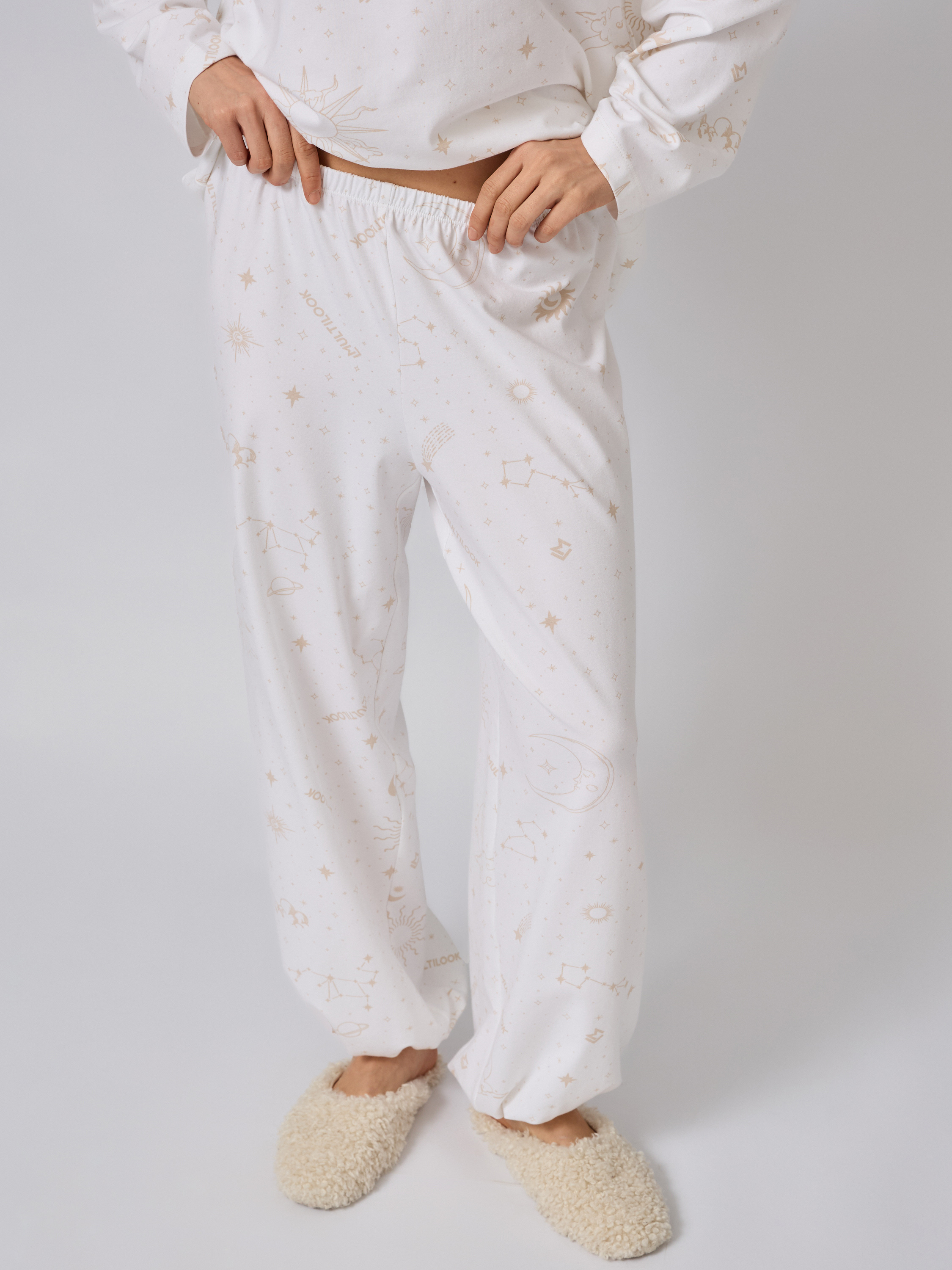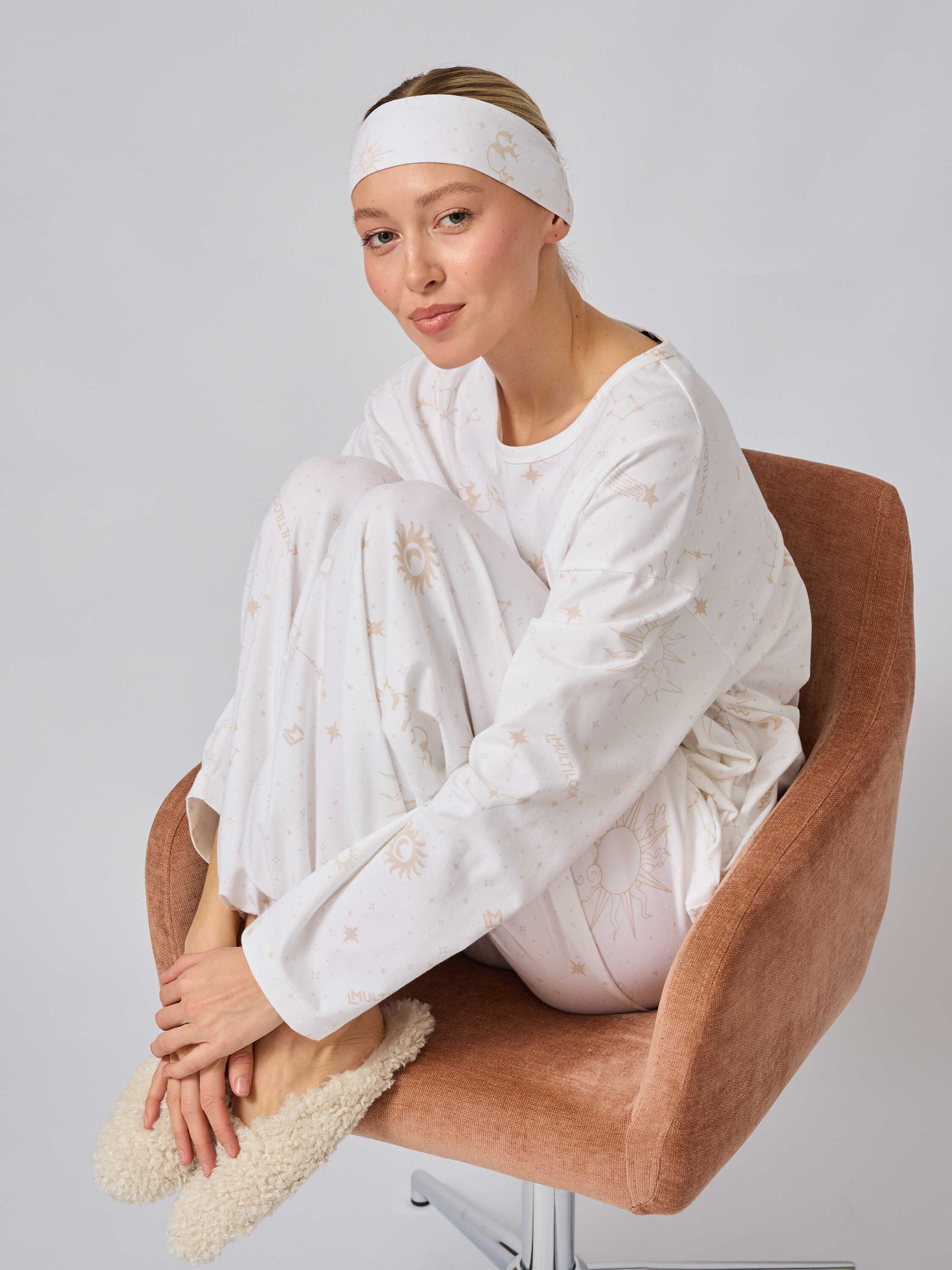 Этот женский комплект с лонгсливом и брюками — идеальный выбор для праздничного времени. Нарядный молочный цвет с дизайнерским принтом зодиак в стиле бренда Multilook вносит праздничное настроение, делая эту пижаму не только удобной, но и стильной. Выполнена из мягкого трикотажного хлопка с добавлением лайкры, что обеспечивает комфорт во время сна и отдыха. Мягкая ткань обладает тактильными ощущениями приятными для кожи, благодаря чему эта домашняя одежда становится незаменимой в преддверии Нового года.