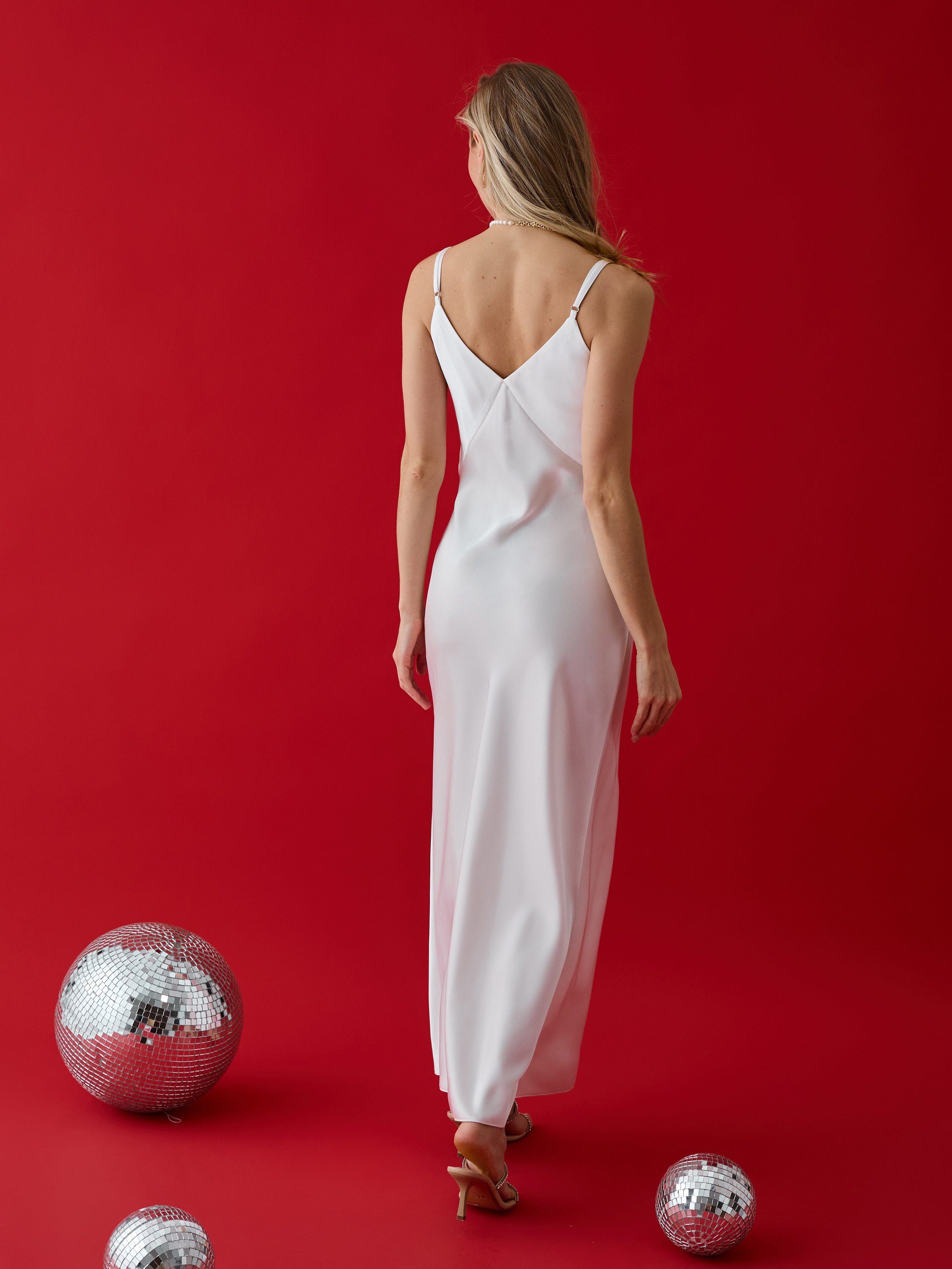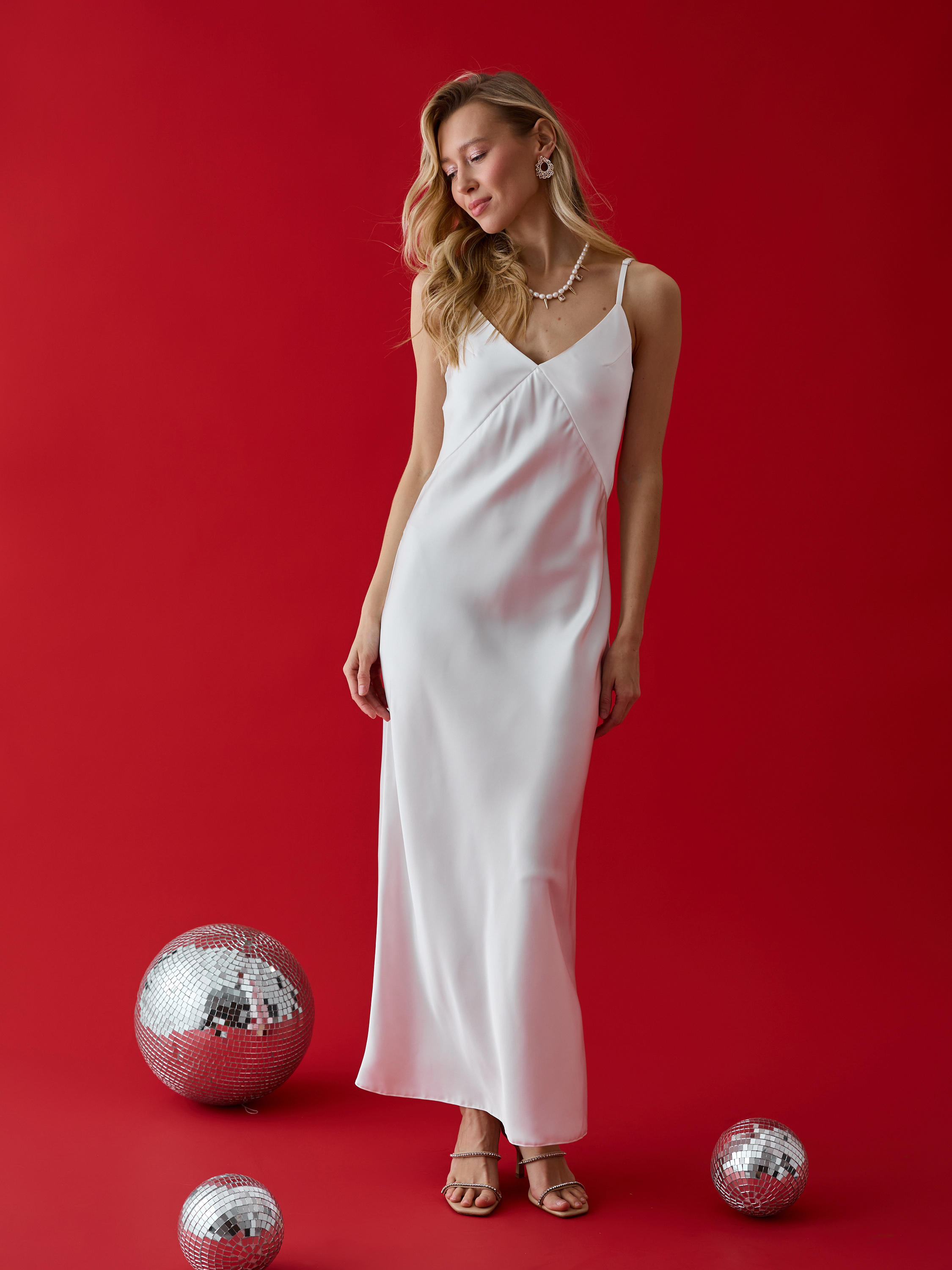 Платье-комбинация женское из атласа силуэтного кроя в длине макси. Изящный крой платья легко сочетается с любой обувью, а декольтированная спинка делает образ ещё более привлекательным и утонченным.