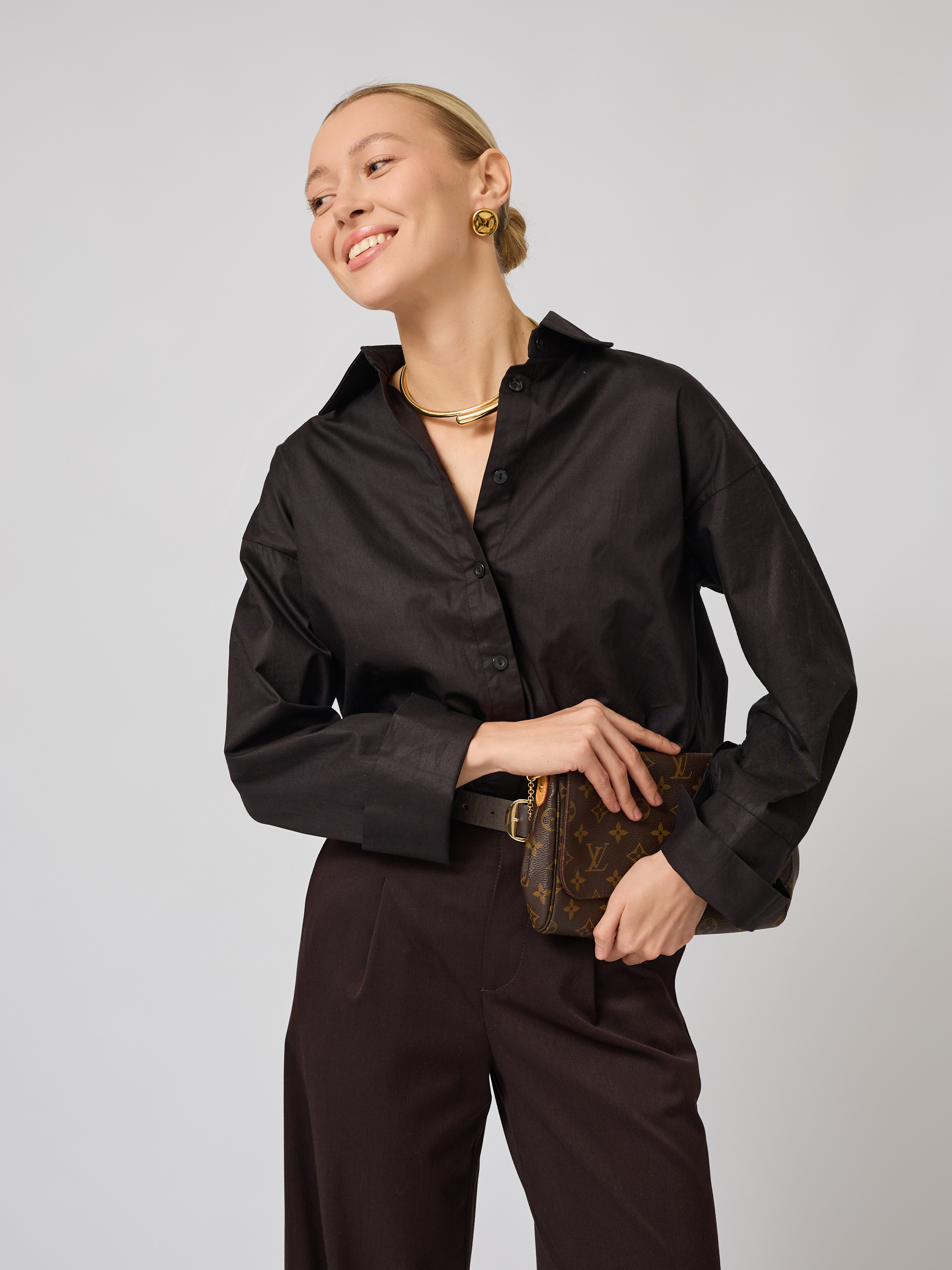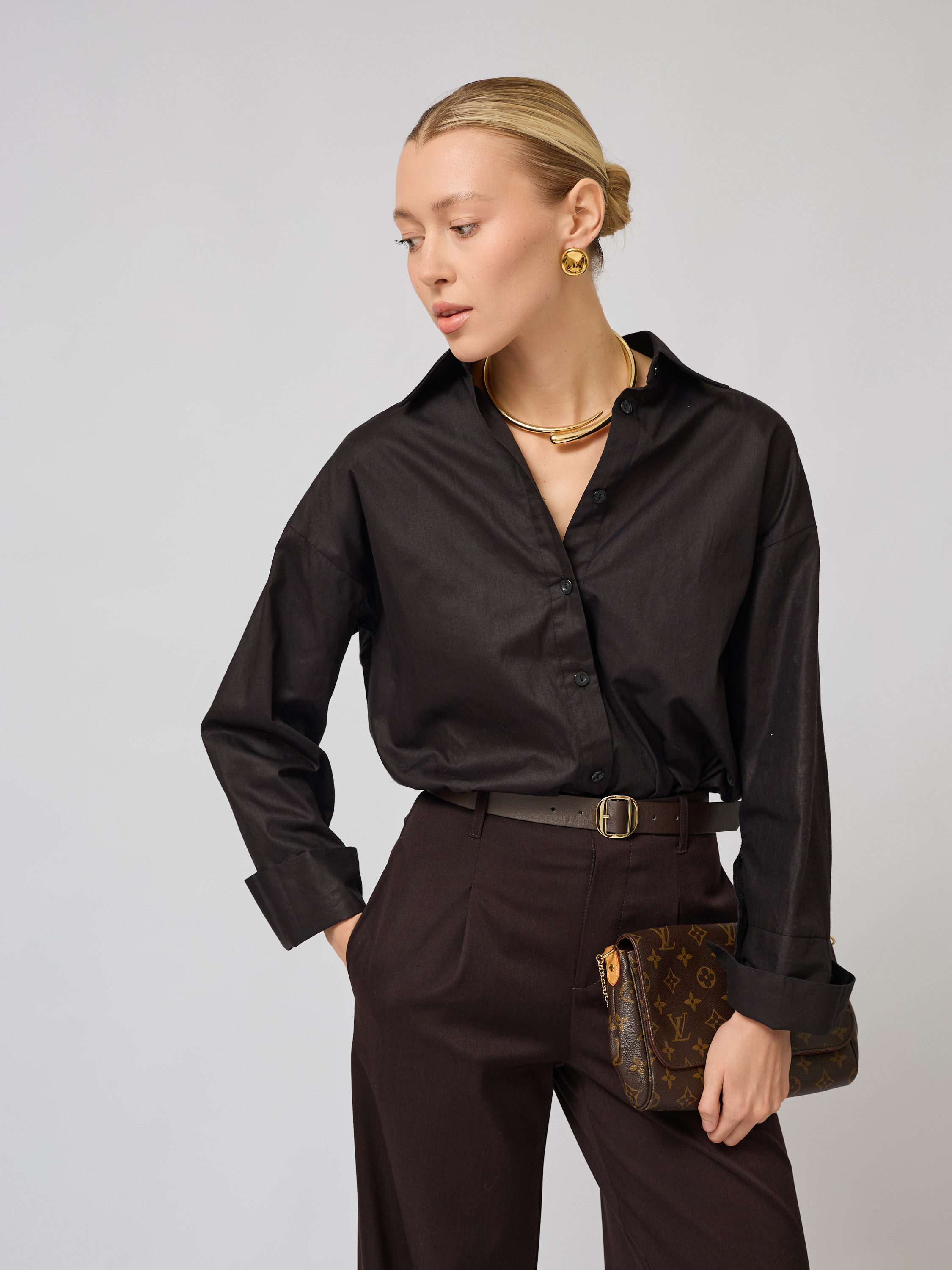 Черная рубашка свободного прямого силуэта легко стилизуется под любое настроение. Ее можно носить круглый год благодаря плотной ткани, которая сохраняет свою форму даже при длительной носке. Это решение подходит не только для девушек, но и для женщин любого возраста, стремящихся к удобству без ущерба стилю.