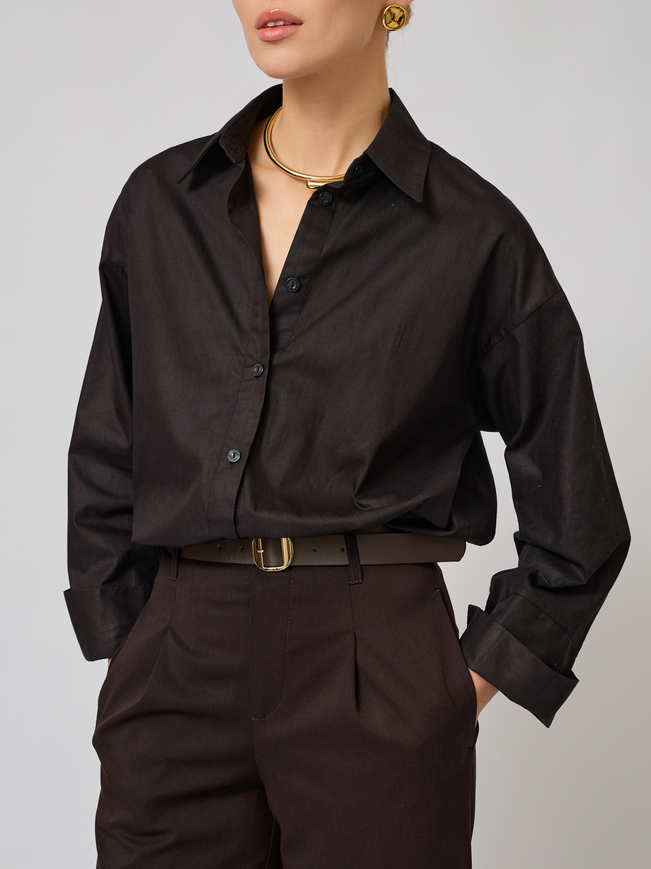 Хлопковая рубашка оверсайз в черном цвете — стильный и универсальный выбор для вашего гардероба. Простая и лаконичная, она идеально подходит для теплого сезона и станет трендом лета 2025 года. Выполнена из натуральной хлопковой ткани с мягким блеском, приятной на ощупь, дышащей и пластичной текстурой, эта модель обеспечит комфорт даже в жаркую погоду.