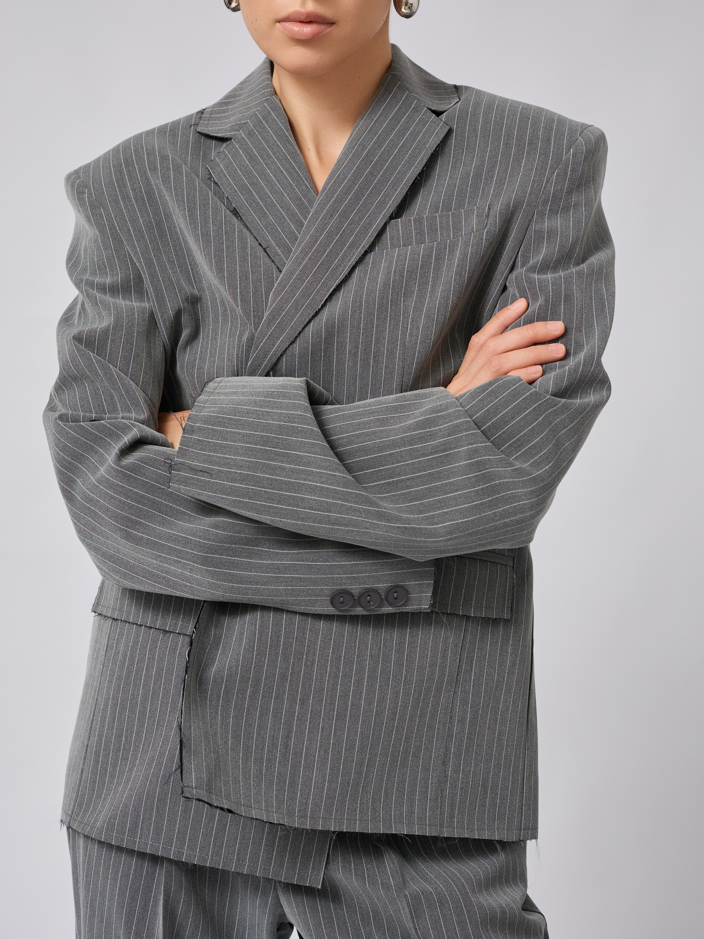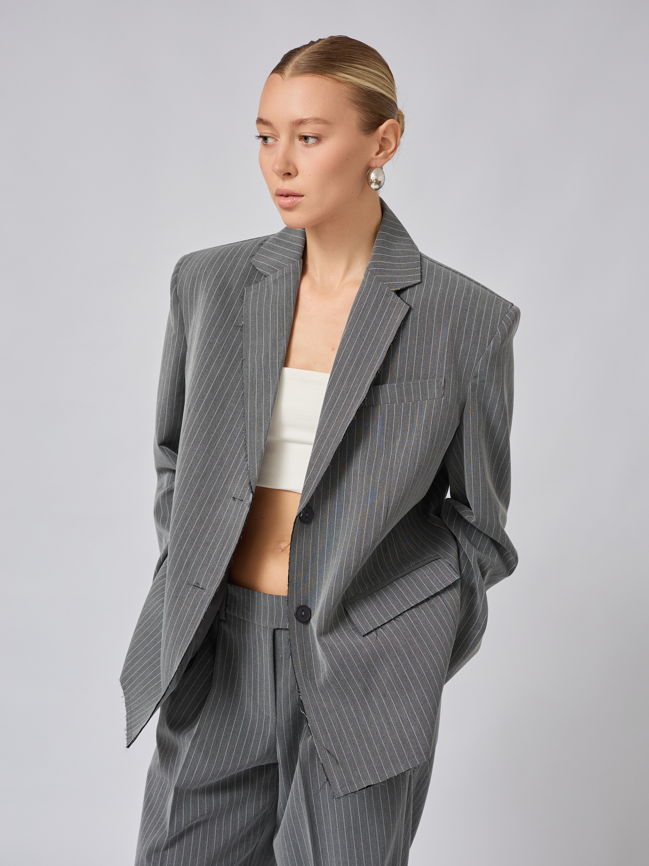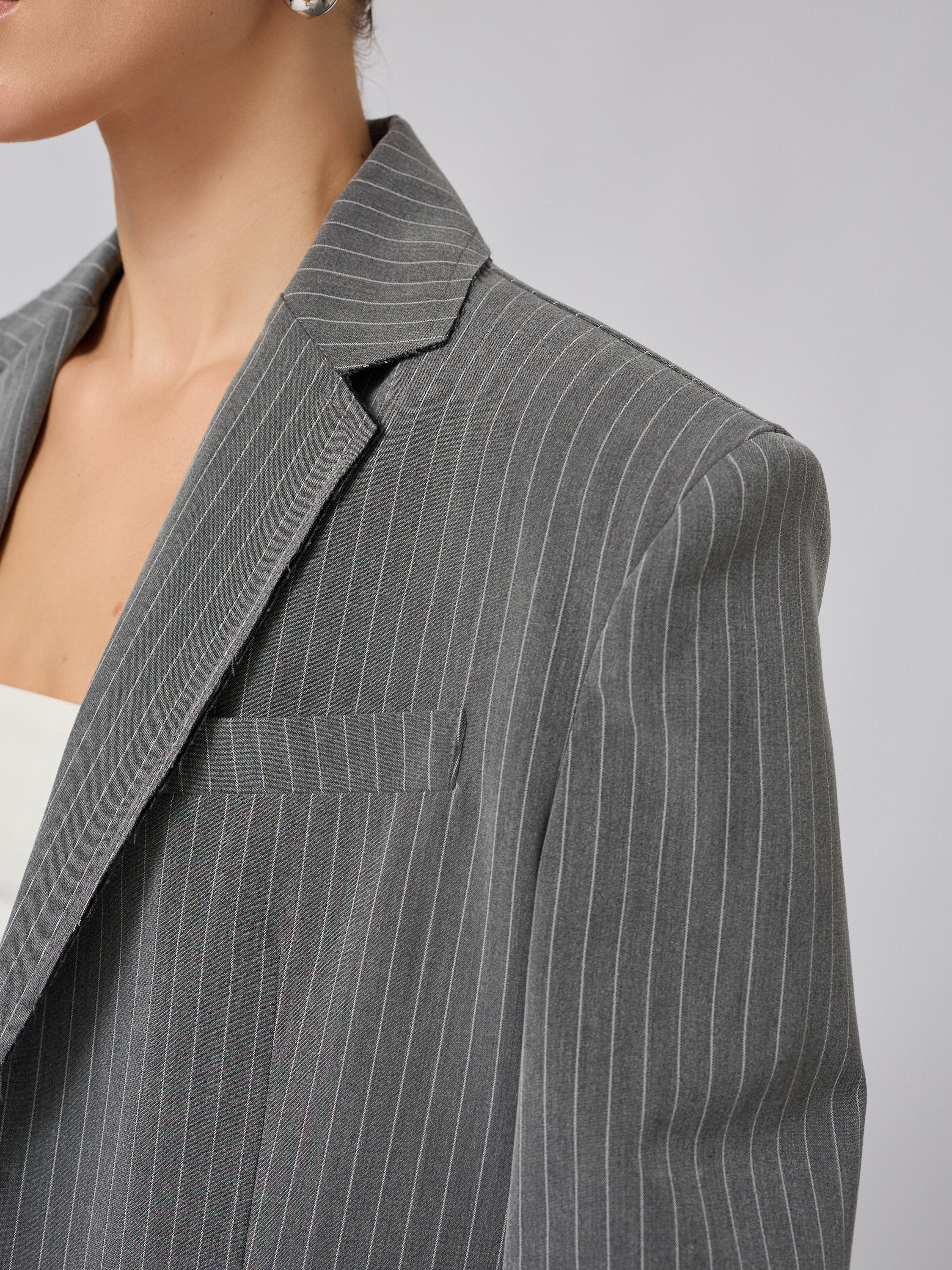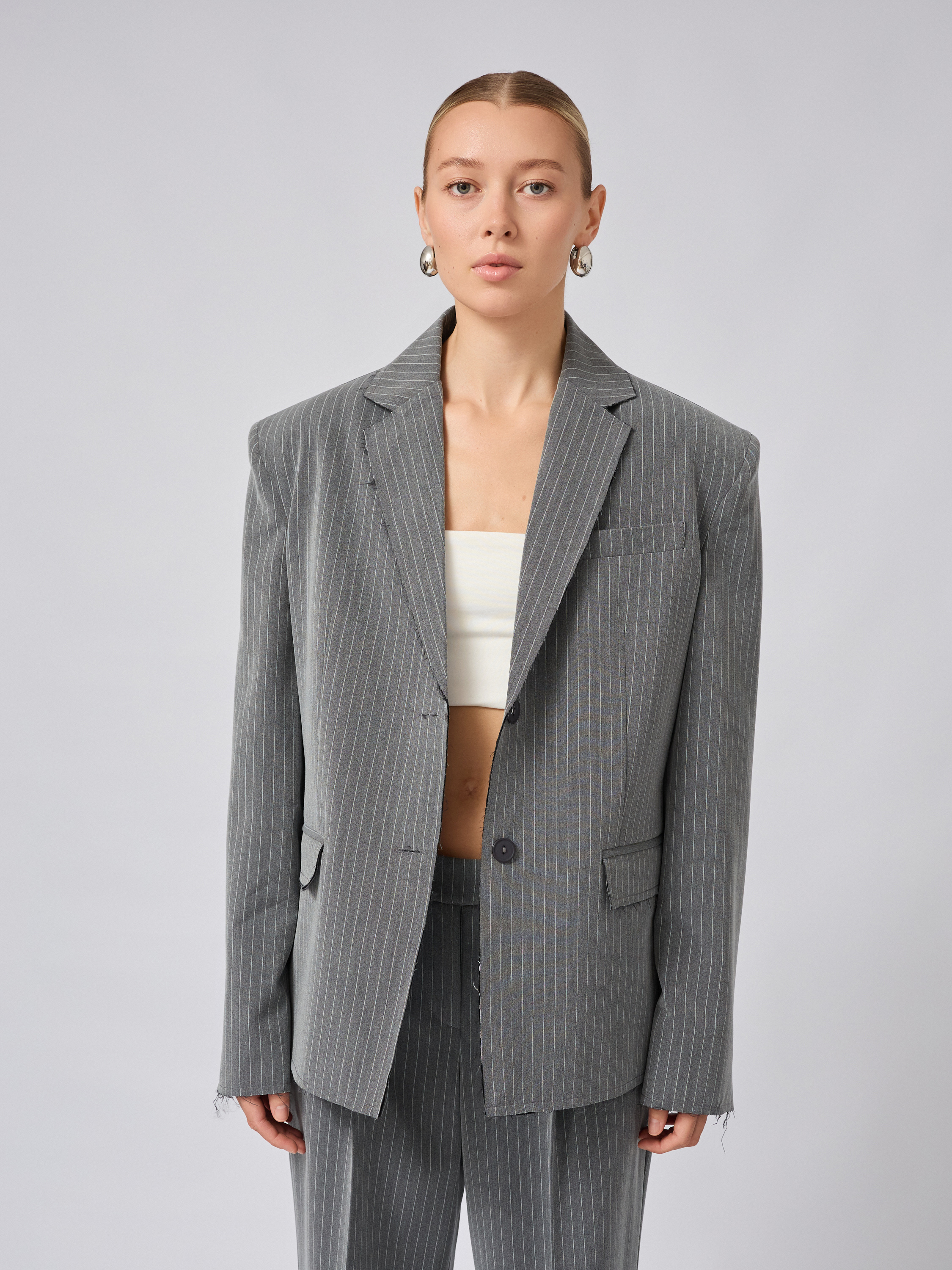 Изделие изготовлено из плотной ткани с подкладкой, что делает жакет универсальным для осеннего, весеннего и даже зимнего сезонов. Необработанный низ добавляет оригинальности и характерности образу, выделяя его среди однообразных вариантов деловой одежды. Свободный крой прекрасно сочетается с разными предметами гардероба, создавая возможность комбинировать этот пиджак как с классическим низом, так и с более смелыми элементами повседневного или торжественного наряда.