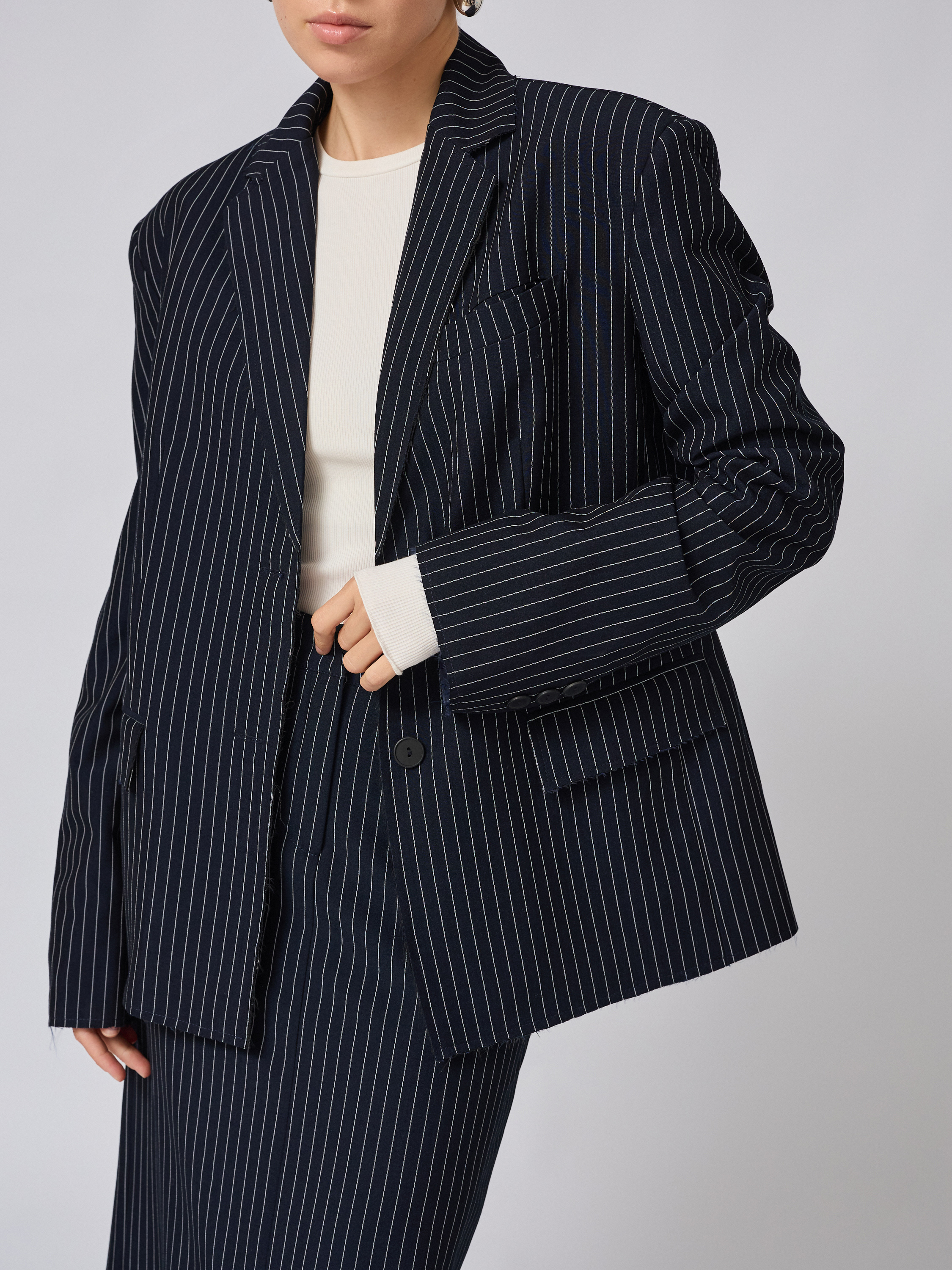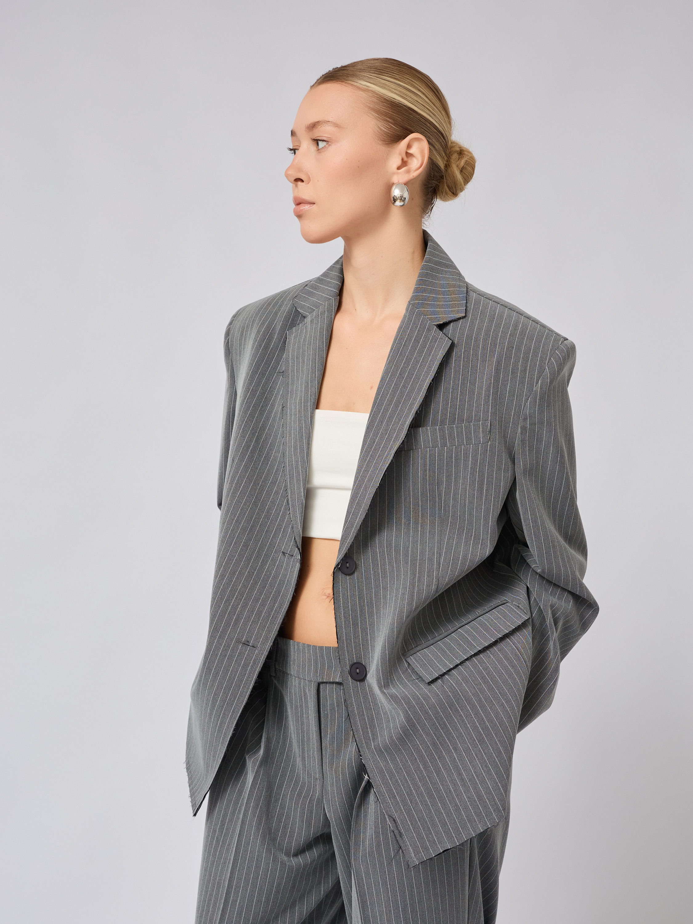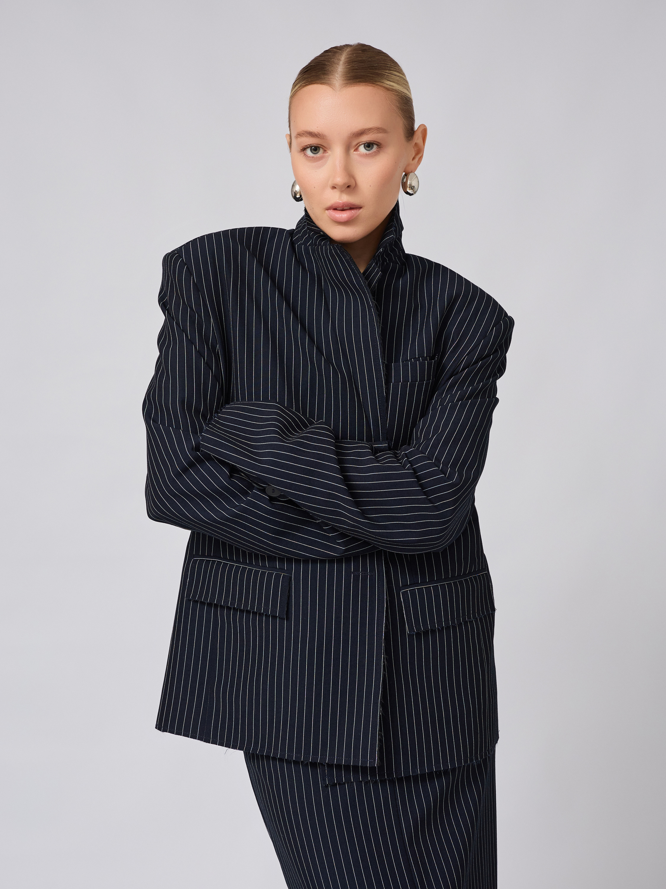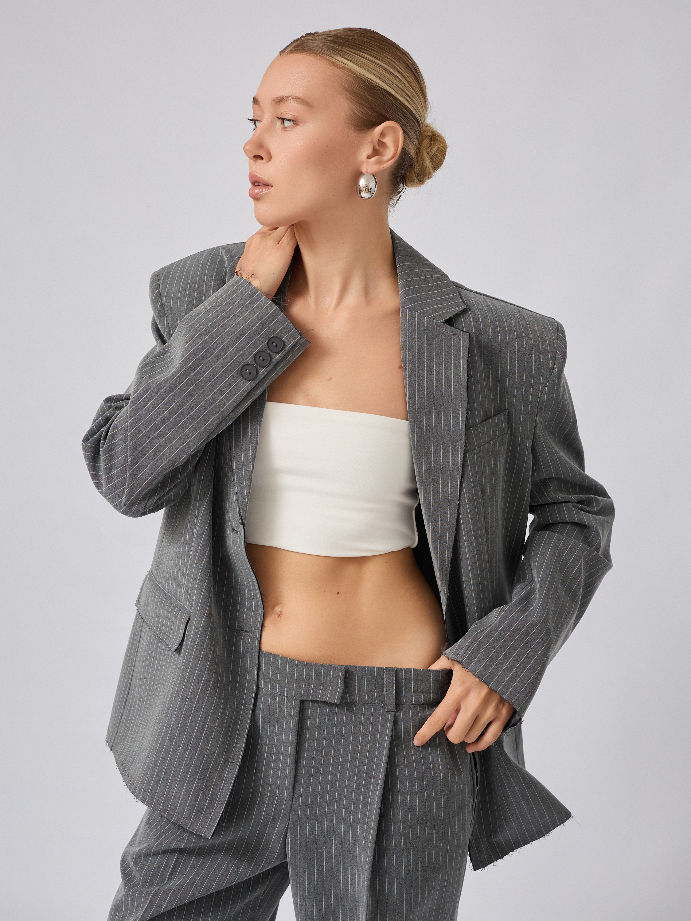 Изделие изготовлено из плотной ткани с подкладкой, что делает жакет универсальным для осеннего, весеннего и даже зимнего сезонов. Необработанный низ добавляет оригинальности и характерности образу, выделяя его среди однообразных вариантов деловой одежды. Свободный крой прекрасно сочетается с разными предметами гардероба, создавая возможность комбинировать этот пиджак как с классическим низом, так и с более смелыми элементами повседневного или торжественного наряда.