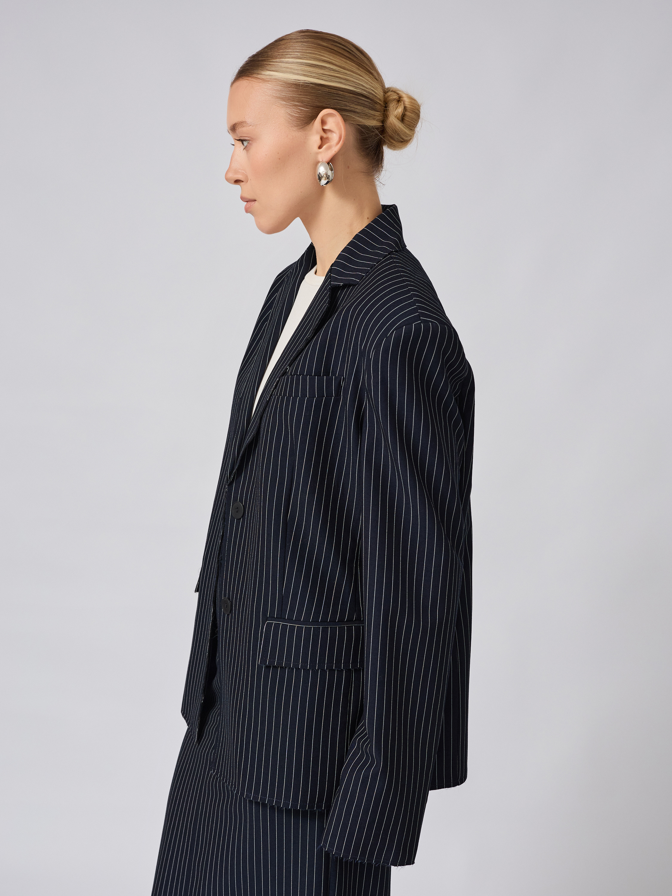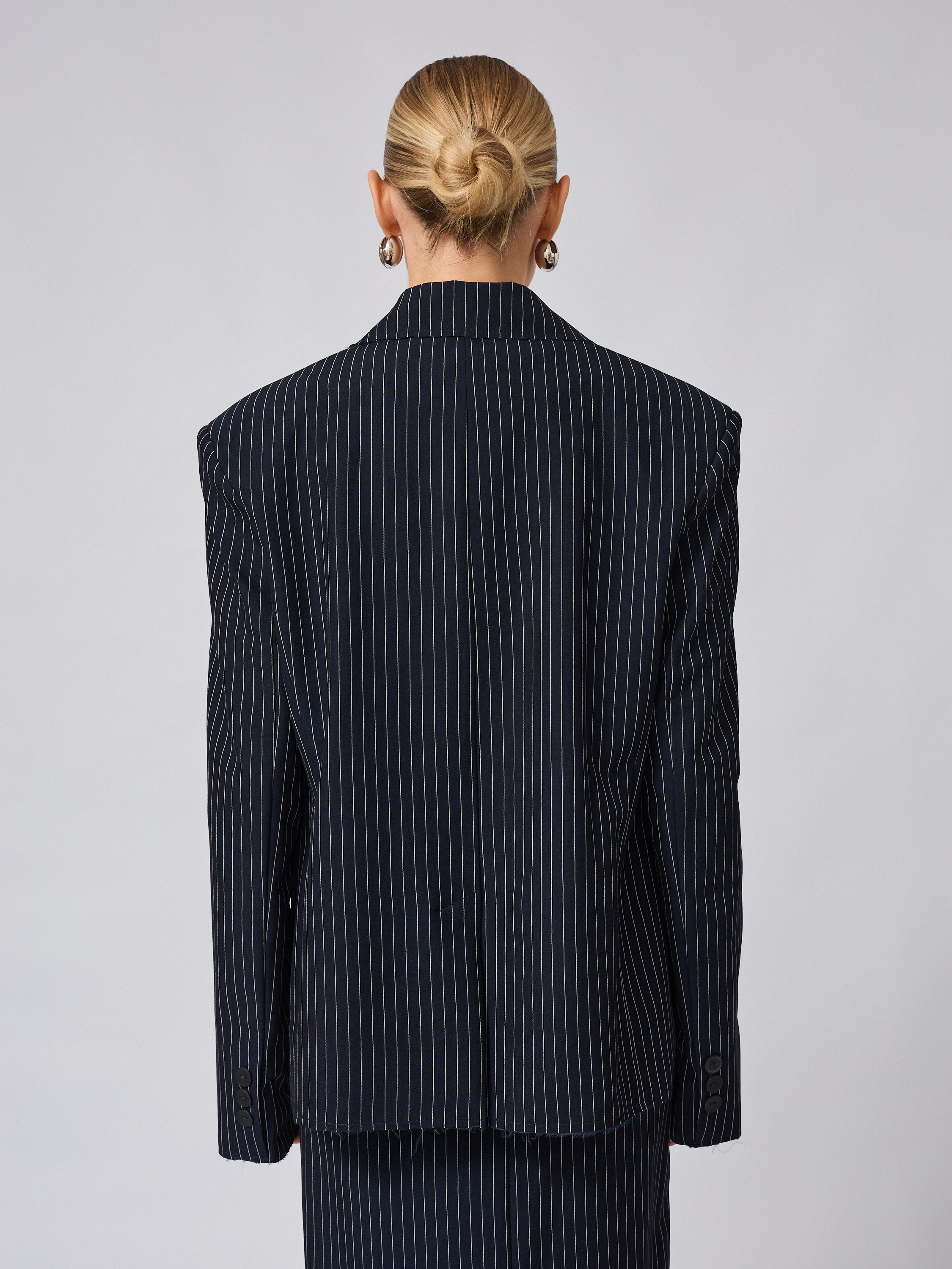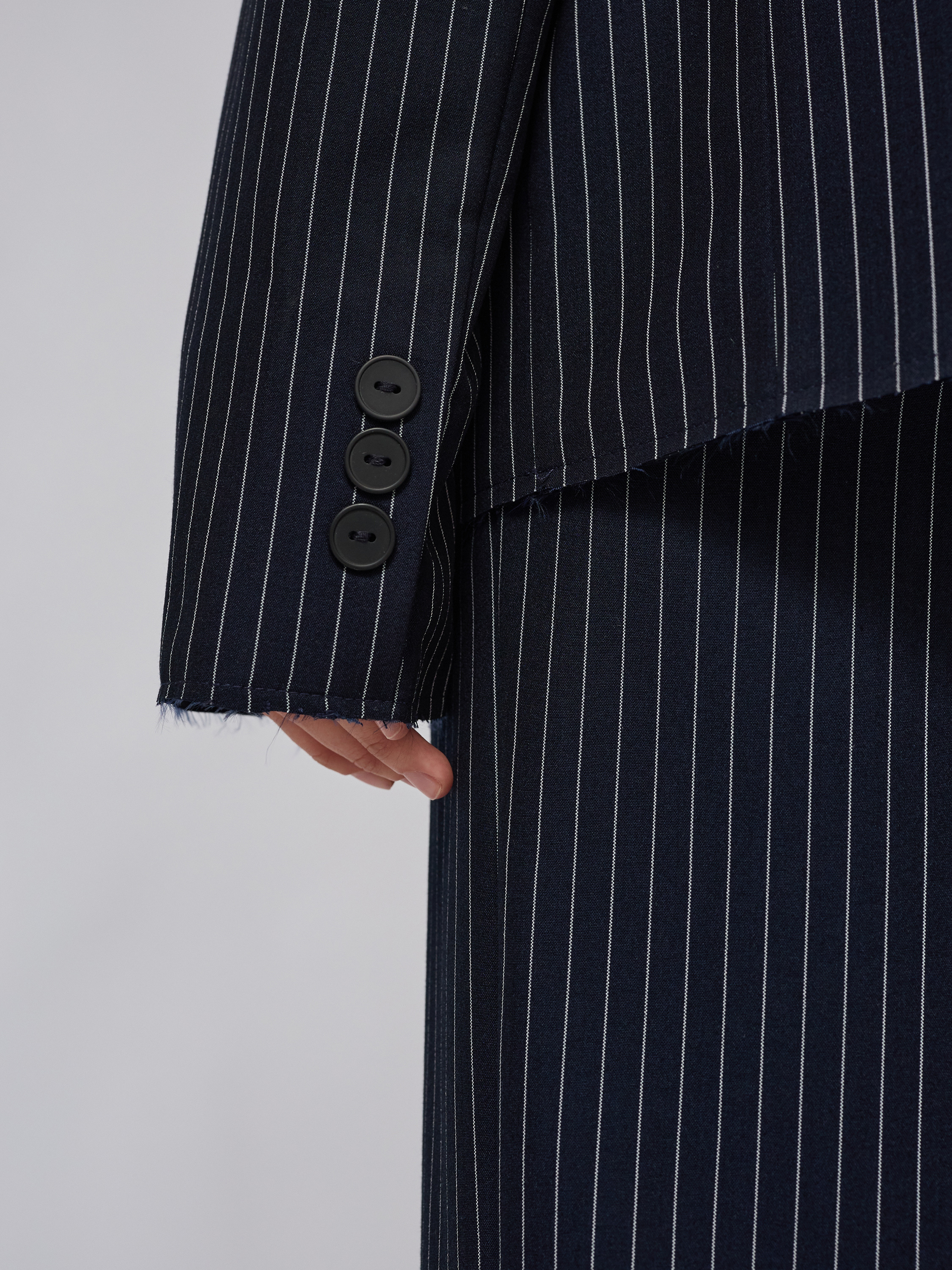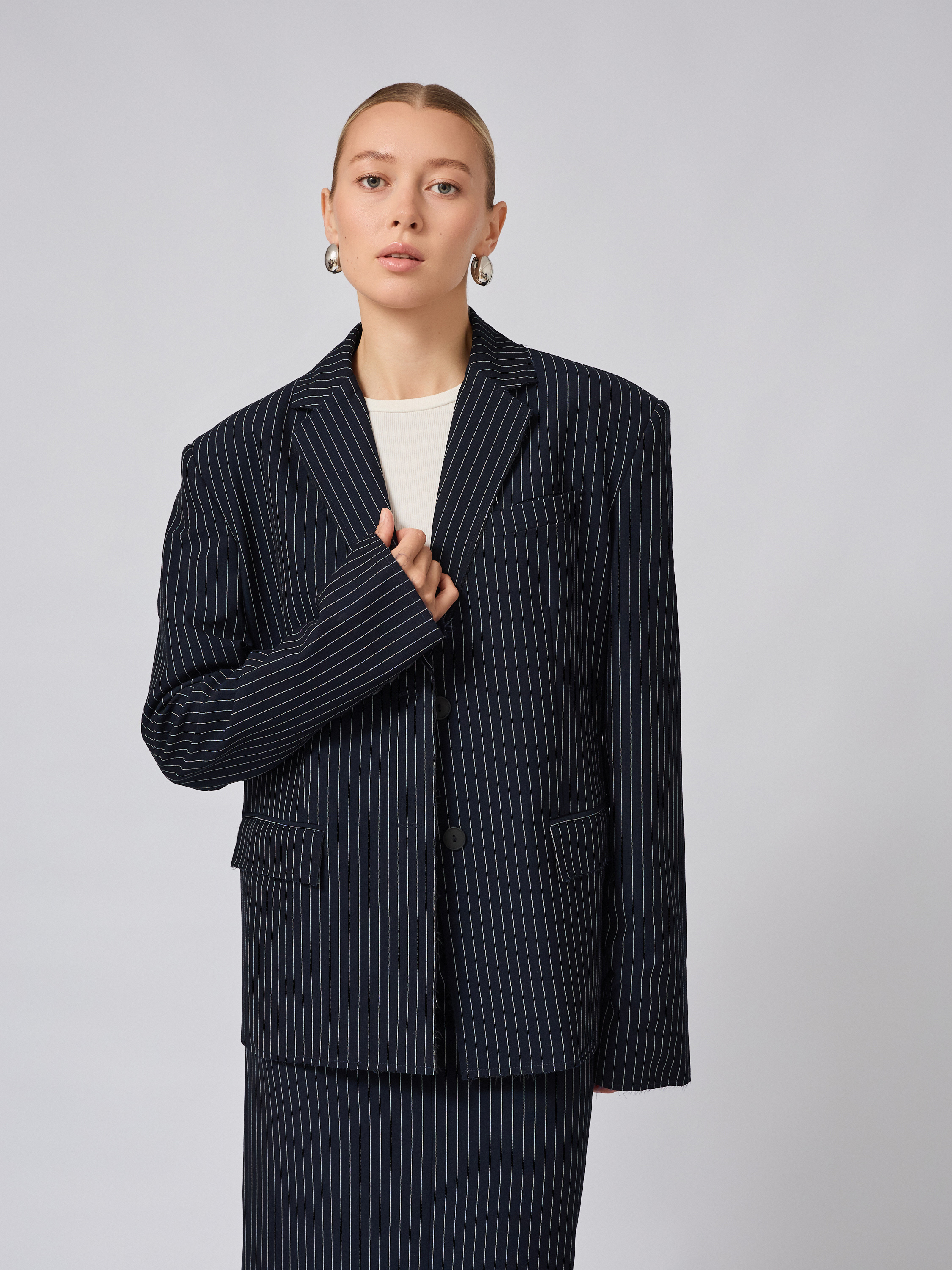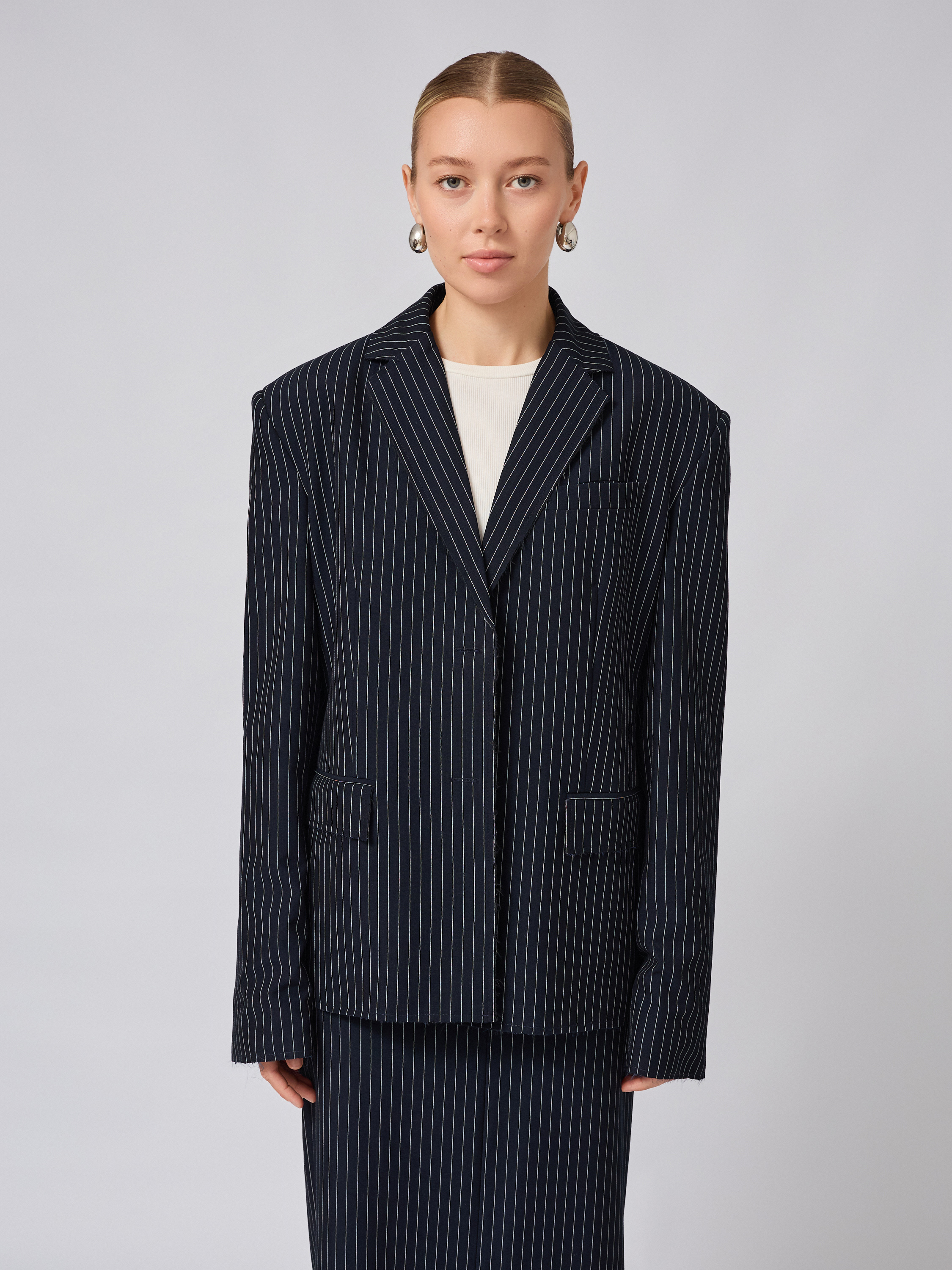 Изделие изготовлено из плотной ткани с подкладкой, что делает жакет универсальным для осеннего, весеннего и даже зимнего сезонов. Необработанный низ добавляет оригинальности и характерности образу, выделяя его среди однообразных вариантов деловой одежды. Свободный крой прекрасно сочетается с разными предметами гардероба, создавая возможность комбинировать этот пиджак как с классическим низом, так и с более смелыми элементами повседневного или торжественного наряда.