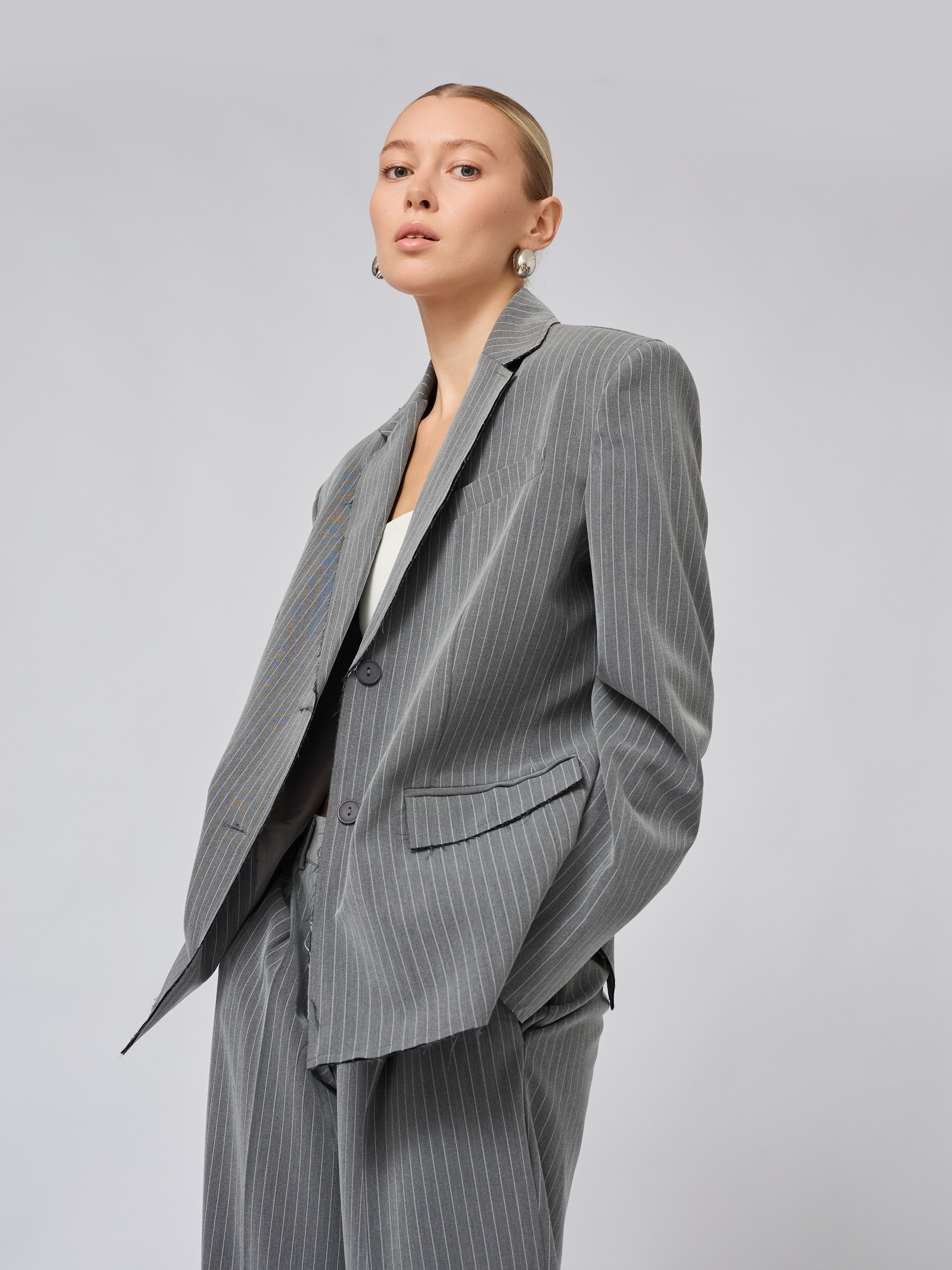 В основе дизайна лежит классика кроя: однобортный фасон с лацканом и подплечниками поддерживают форму изделия на протяжении всего дня. Такой жакет станет незаменимым в деловом стиле, а также отлично подойдет для праздничных мероприятий или прогулок в непринужденной обстановке. Серый оттенок — универсальное решение, которое легко впишется в любой образ и позволит создавать эффектные сочетания как с яркими акцентами, так и со спокойными цветами.