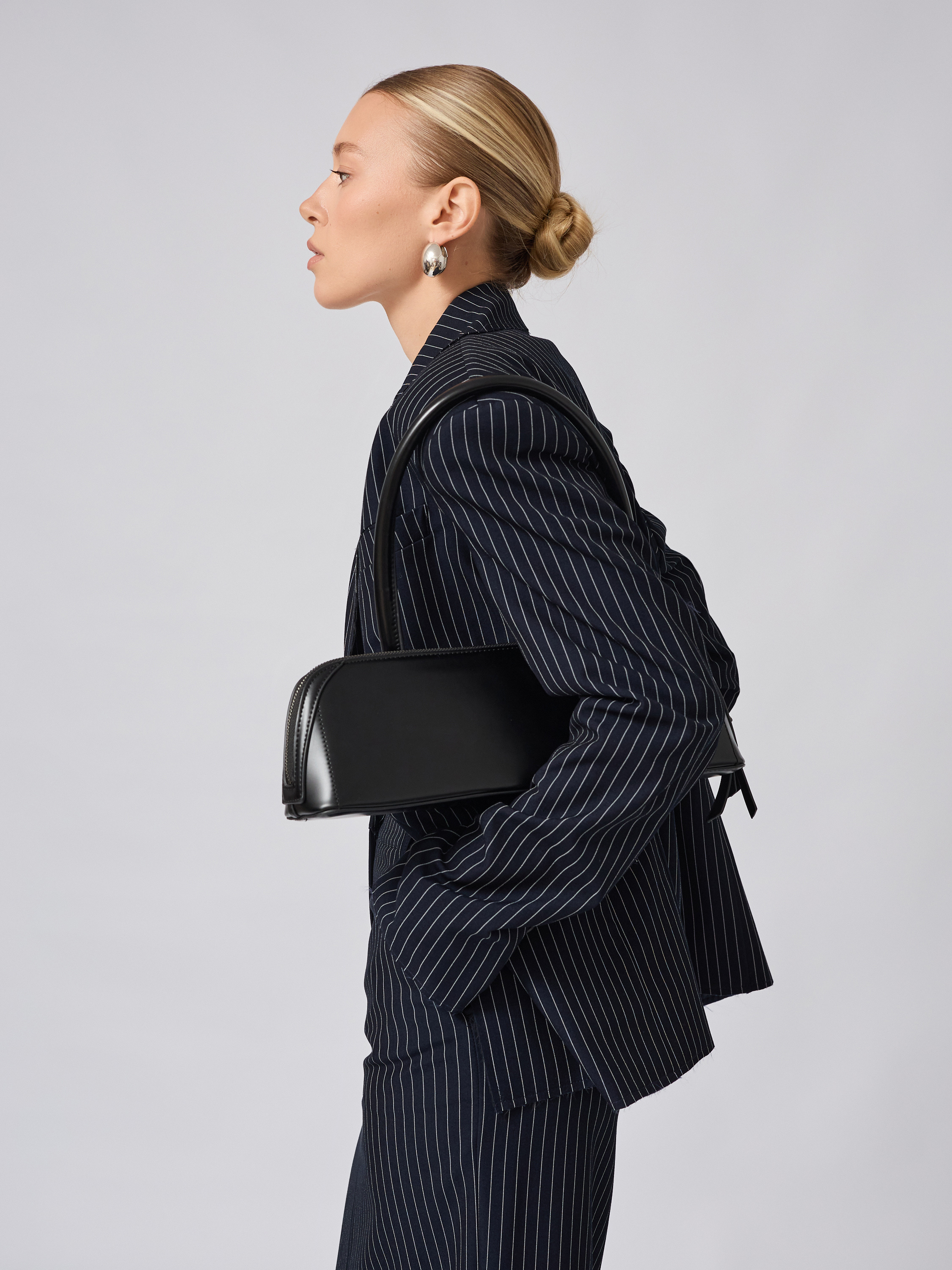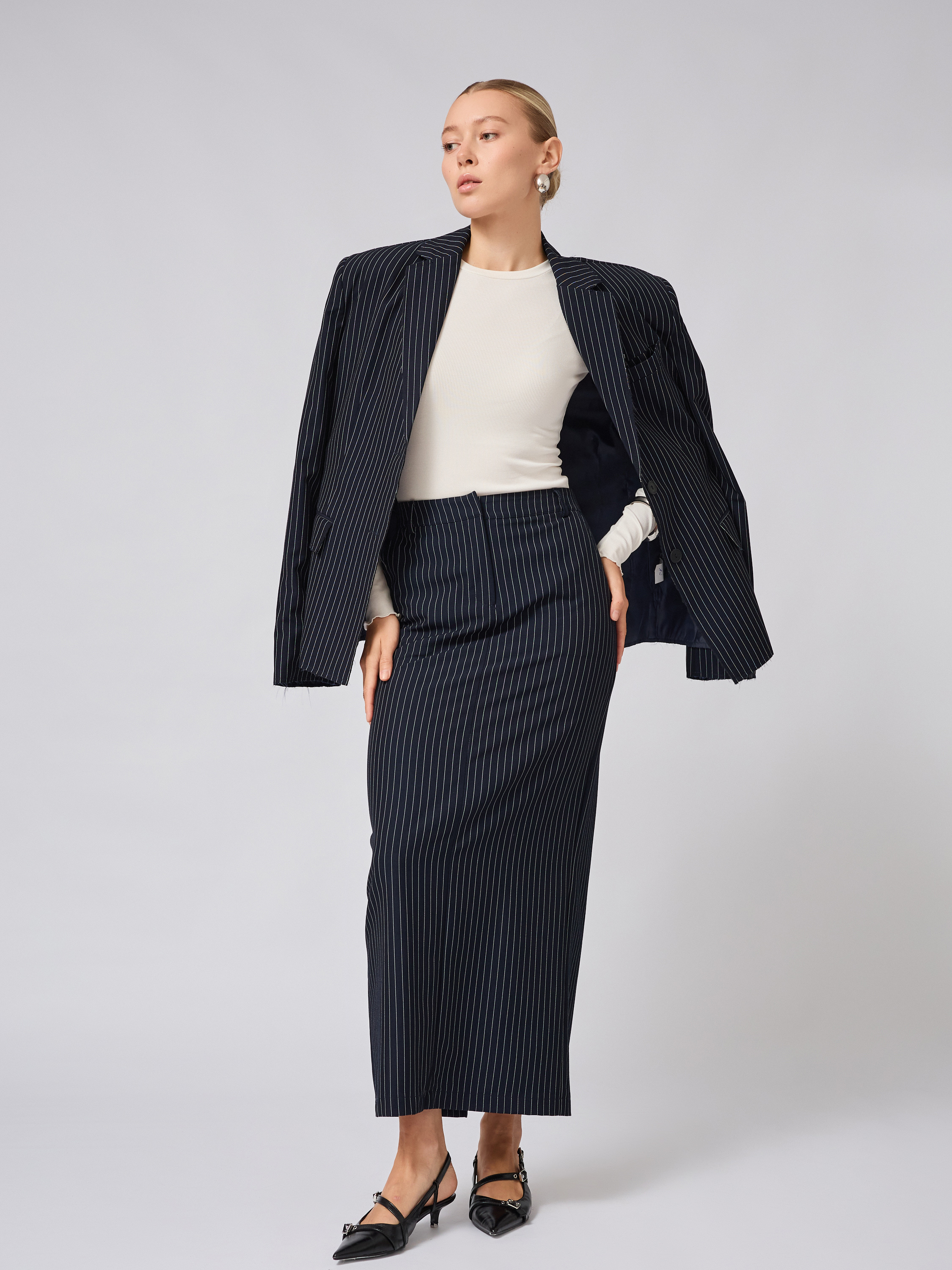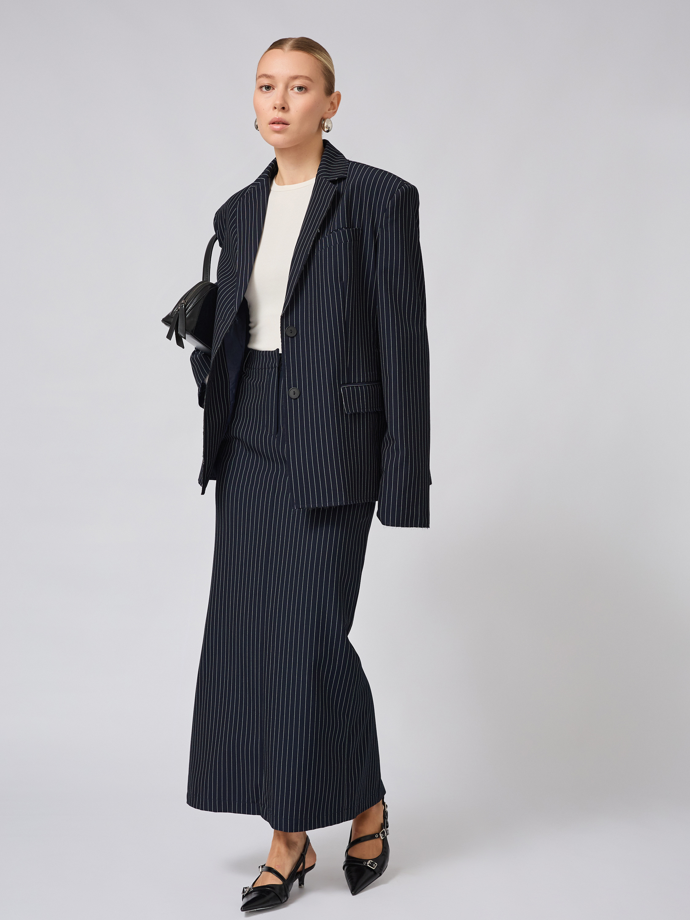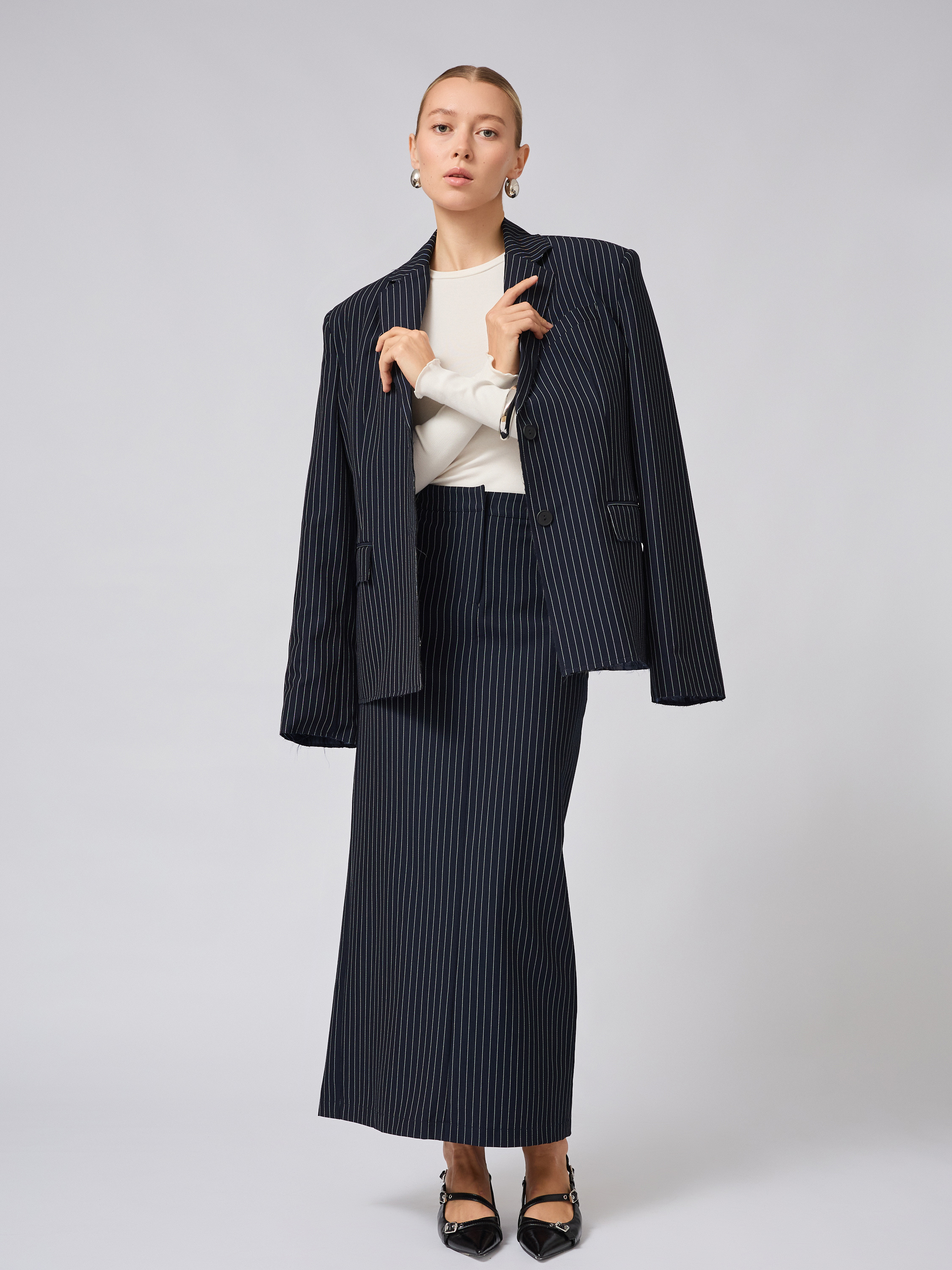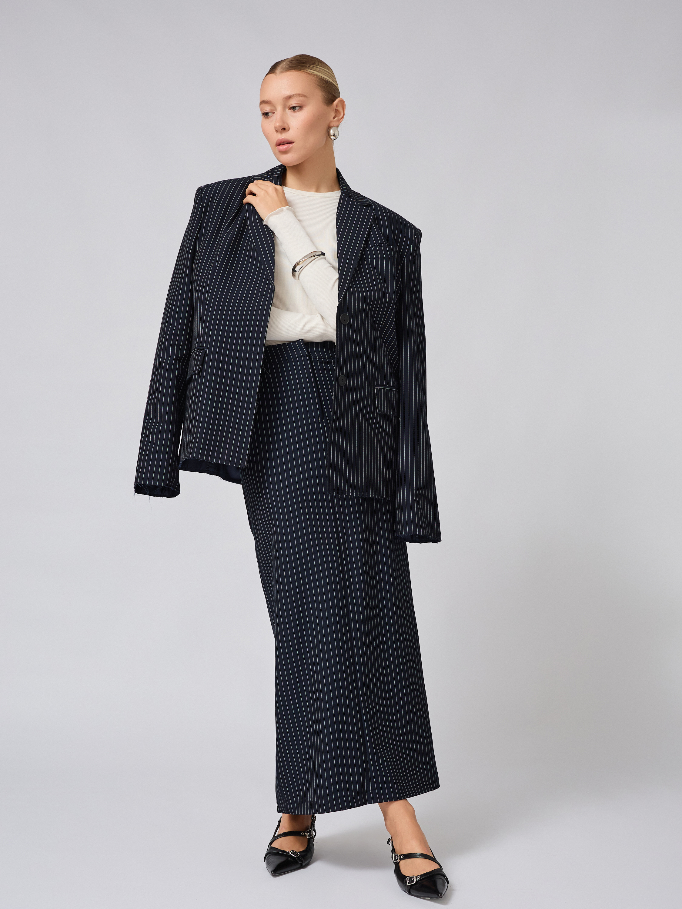 Этот базовый синий жакет с объемными плечами — идеальный элемент для нового гардероба 2025 года. Удлиненный крой с расширенной линией плеча создает модный силуэт оверсайз, который подчеркнет индивидуальность и стиль каждой женщины. Центральная застежка на две пуговицы и V-образный вырез лацкана придают классический вид, сохраняя актуальность тренда и молодежной динамики.
