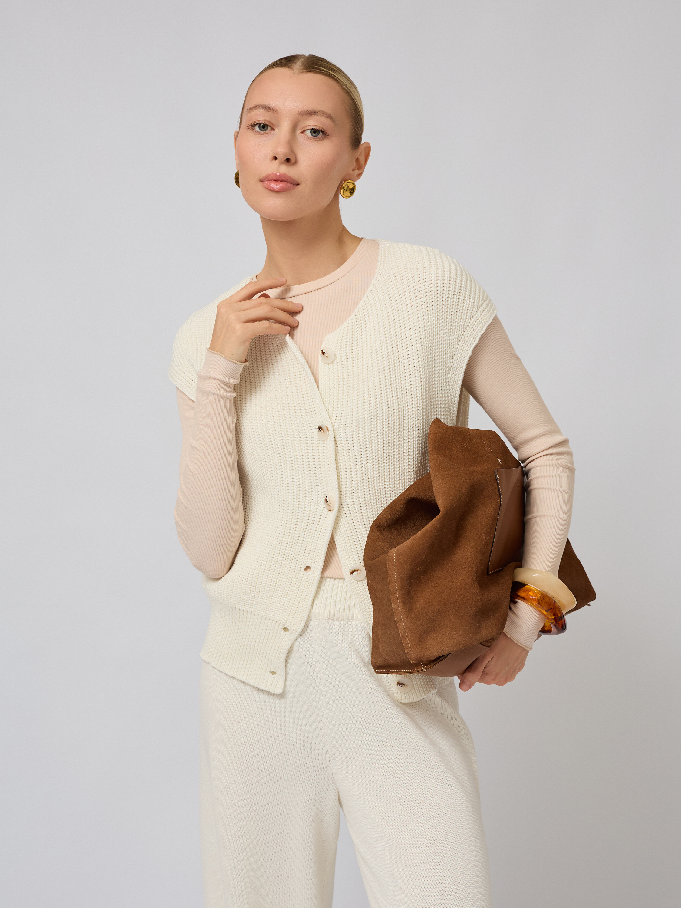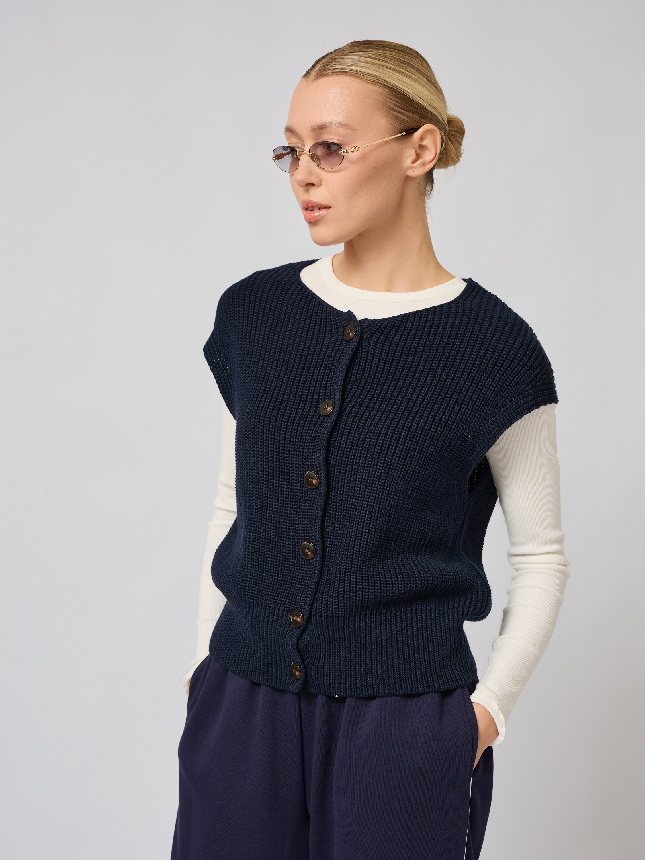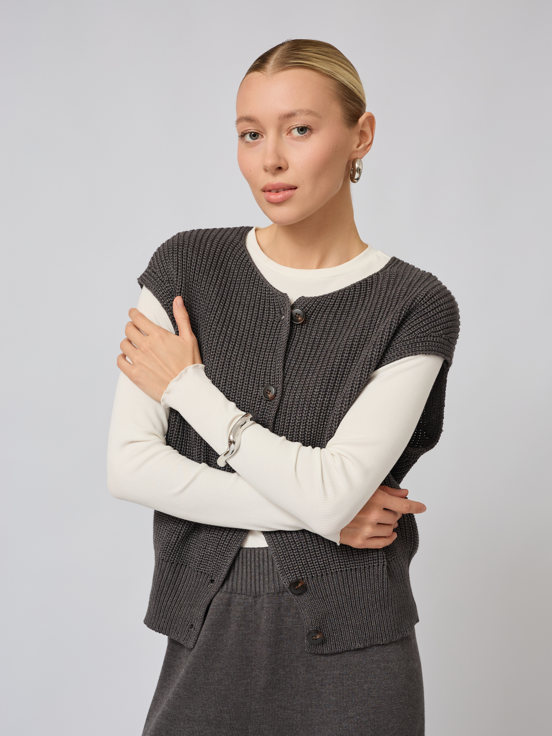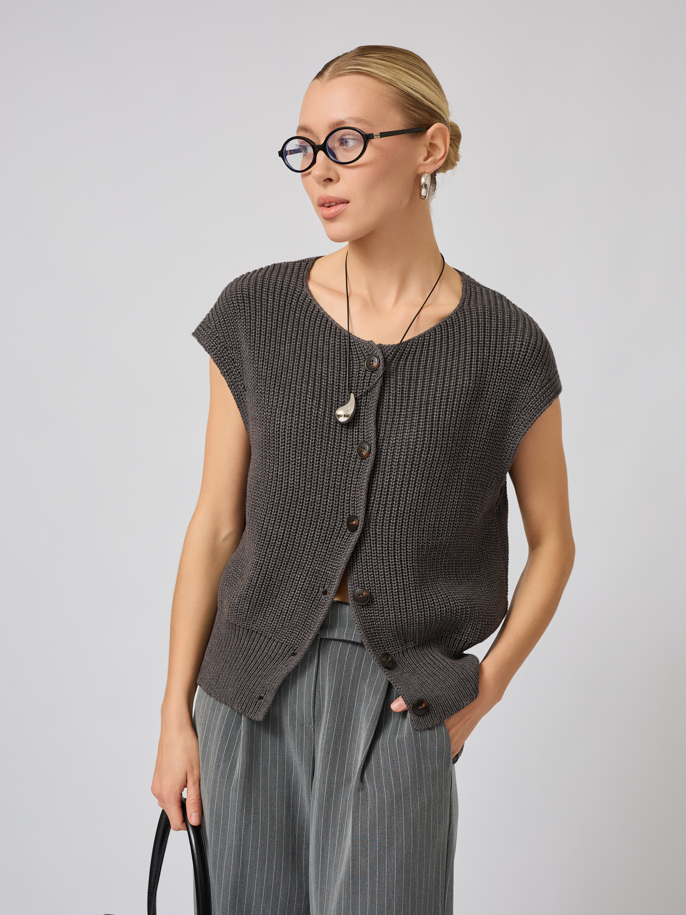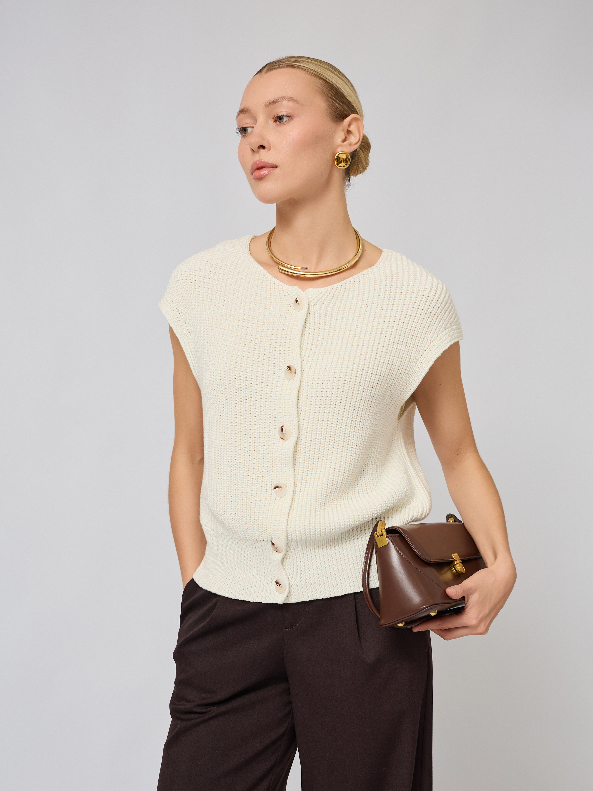 Стильный женский жилет вязаный на пуговицах — это тот элемент гардероба, который не стоит упускать при выборе вещей для прохладных дней. Этот жилет выполнен из высококачественных материалов, где основа — хлопка и акрила, что делает его отличным выбором для женщин, ценящих комфорт, универсальность и стиль. Молочный цвет придает особую элегантность и гладкость образу, позволяя вписываться как в офисный дресс-код, так и в повседневные наряды. Благодаря своей простотой и уникальным особенностям дизайна с круглым вырезом и прямым силуэтом, этот трикотажный жилет отличается безупречным исполнением. Жилетка превосходно держит форму за счет плотного трикотажа высокого качества. Хлопковая пряжа в составе позволяет изделию дышит при носке, а акрил добавляет мягкости и прочности. Вязаного рисунка нет — здесь ставка сделана на лаконичность линий и минимализм стиля. Не колется благодаря качественной обработке трикотажа: носите ее поверх водолазки или лонгслива — никакой лишней заботы о дискомфорте! Такой вариант согреет вас осенне-весенняя прохлада или холодные дни любого времени года. Этот удлиненный жилет свободного кроя подходит для женщин разных ростовки и легко адаптируется под особенности вашей фигуры за счет оверсайз силуэта. Он является универсальной основой коллекцию модных образов: сочетайте с базовый вещами или комбинируйте с различными элементами одежды для создания стильных нарядов любого назначения. Простой дизайн без декоративных элементов отлично впишется как в классические офисные стили, так и в более расслабленные повседневного направления. Не упустите возможность пополнить свой гардероб этим стильным вариантом: молочный оттенок прекрасно сочетается практически с любым цветом одежды; вырез круглый делает жилет идеальным дополнением к лонгсливам или водолазкам; застежка на пуговицах облегчает надевание при необходимости создать дополнительный слой тепла поверх рубашки либо футболки.