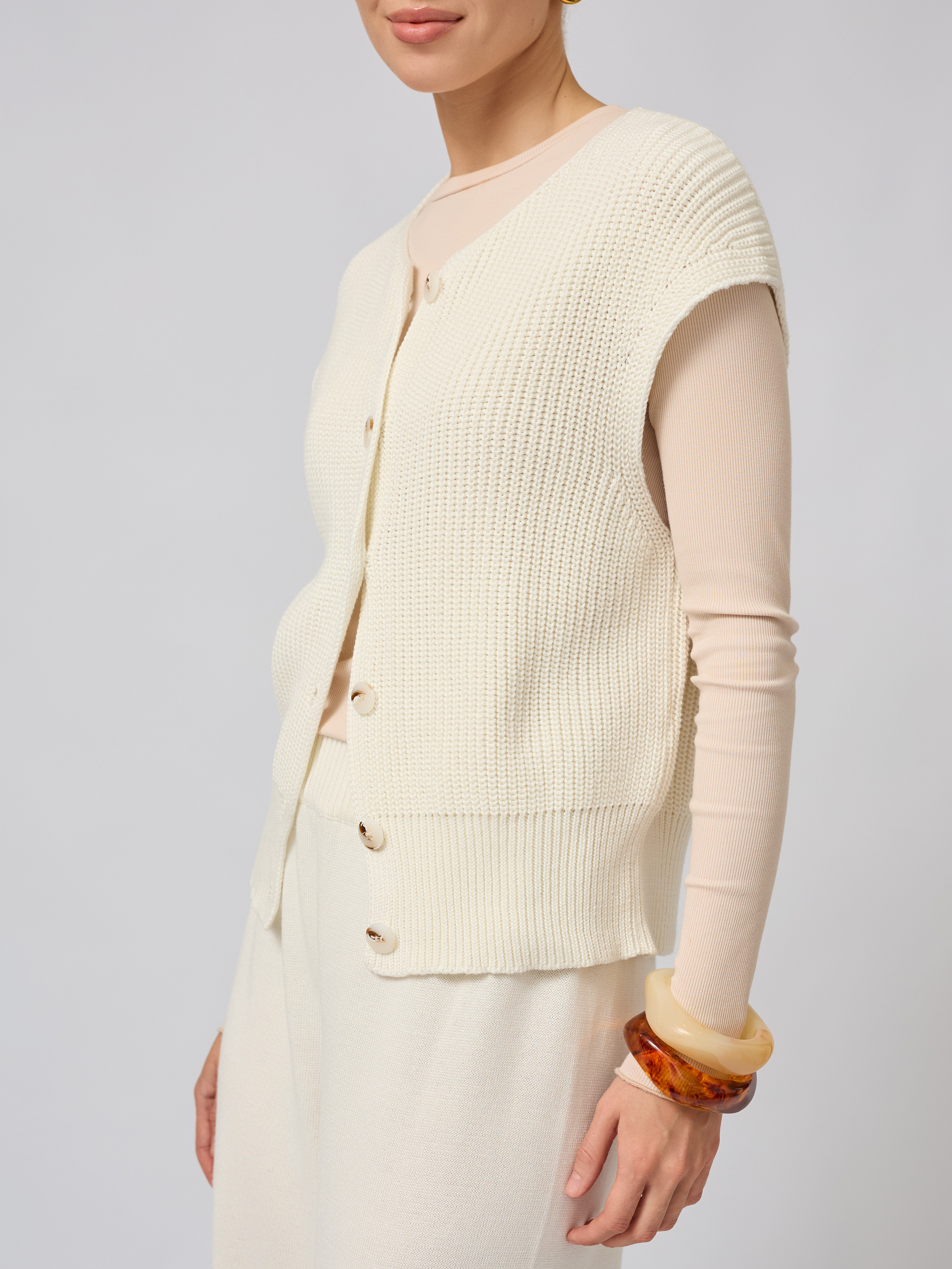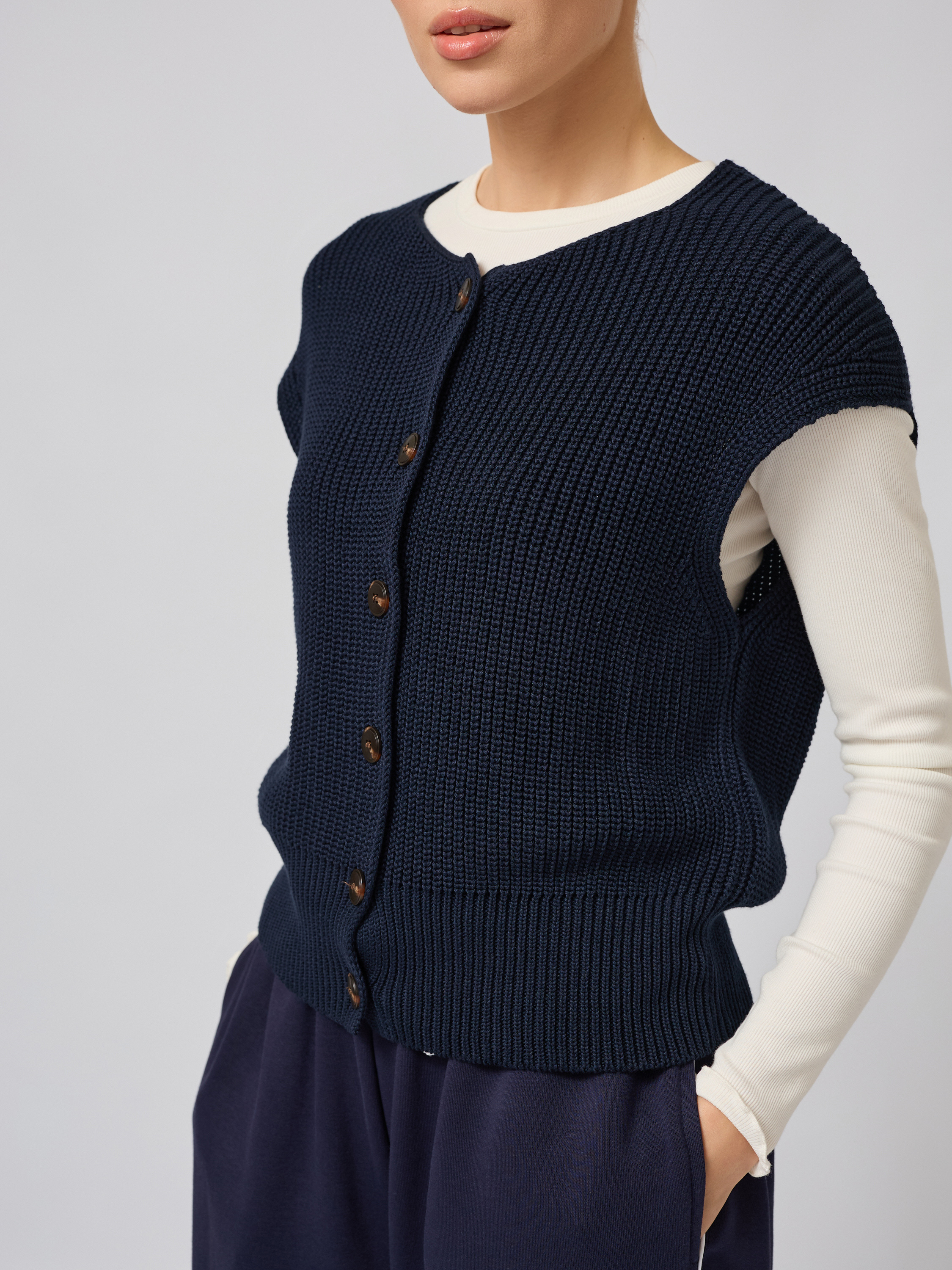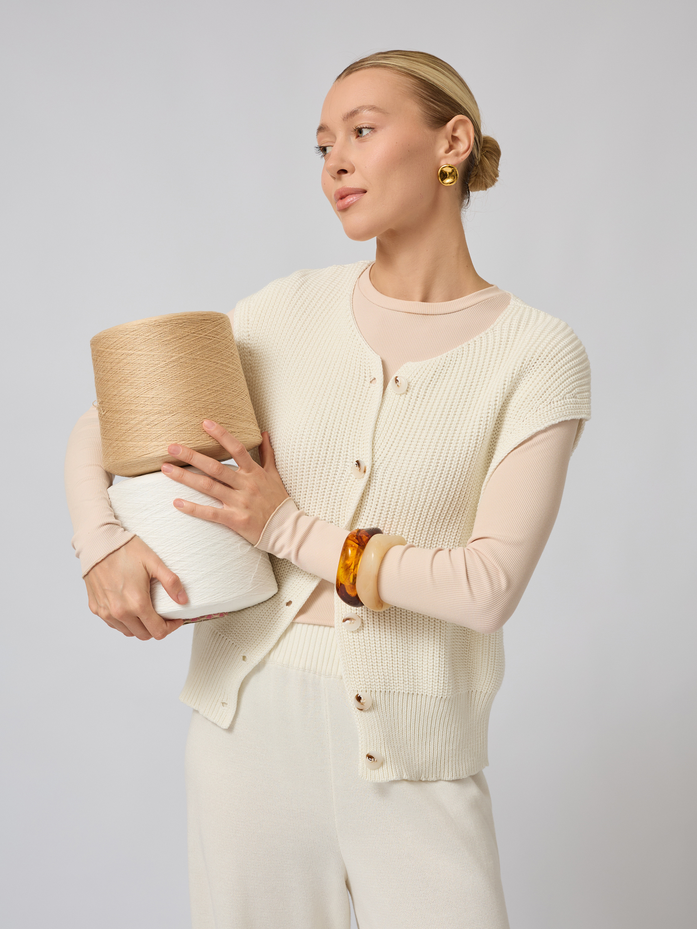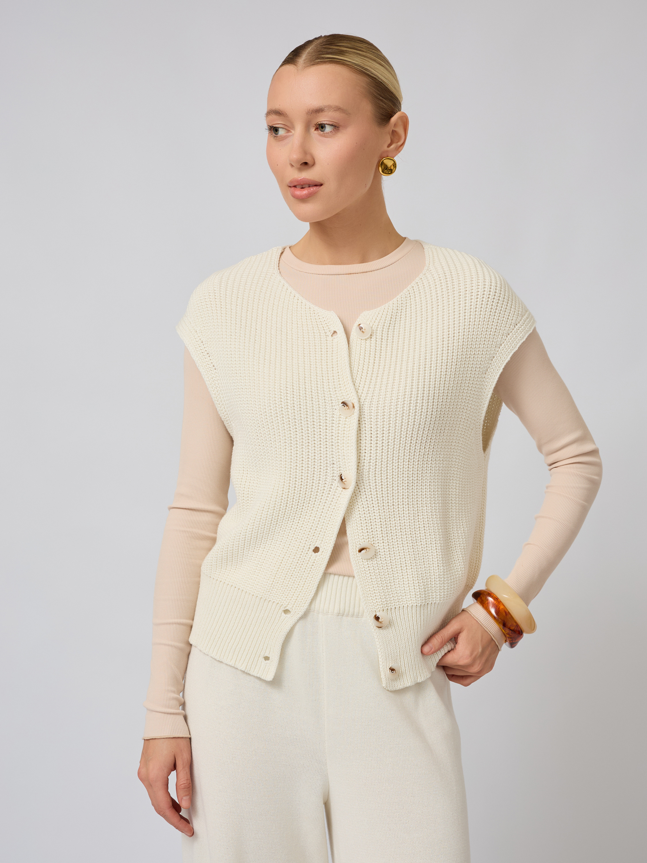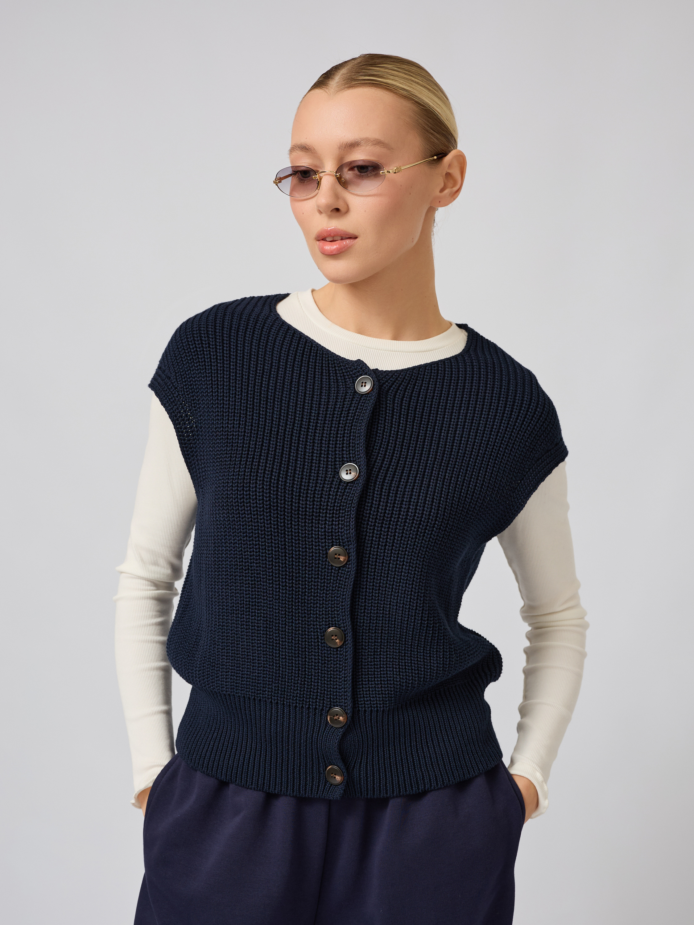 Стильный женский жилет вязаный на пуговицах — это тот элемент гардероба, который не стоит упускать при выборе вещей для прохладных дней. Этот жилет выполнен из высококачественных материалов, где основа — хлопка и акрила, что делает его отличным выбором для женщин, ценящих комфорт, универсальность и стиль. Молочный цвет придает особую элегантность и гладкость образу, позволяя вписываться как в офисный дресс-код, так и в повседневные наряды. Благодаря своей простотой и уникальным особенностям дизайна с круглым вырезом и прямым силуэтом, этот трикотажный жилет отличается безупречным исполнением. Жилетка превосходно держит форму за счет плотного трикотажа высокого качества. Хлопковая пряжа в составе позволяет изделию дышит при носке, а акрил добавляет мягкости и прочности. Вязаного рисунка нет — здесь ставка сделана на лаконичность линий и минимализм стиля. Не колется благодаря качественной обработке трикотажа: носите ее поверх водолазки или лонгслива — никакой лишней заботы о дискомфорте! Такой вариант согреет вас осенне-весенняя прохлада или холодные дни любого времени года. Этот удлиненный жилет свободного кроя подходит для женщин разных ростовки и легко адаптируется под особенности вашей фигуры за счет оверсайз силуэта. Он является универсальной основой коллекцию модных образов: сочетайте с базовый вещами или комбинируйте с различными элементами одежды для создания стильных нарядов любого назначения. Простой дизайн без декоративных элементов отлично впишется как в классические офисные стили, так и в более расслабленные повседневного направления. Не упустите возможность пополнить свой гардероб этим стильным вариантом: молочный оттенок прекрасно сочетается практически с любым цветом одежды; вырез круглый делает жилет идеальным дополнением к лонгсливам или водолазкам; застежка на пуговицах облегчает надевание при необходимости создать дополнительный слой тепла поверх рубашки либо футболки.