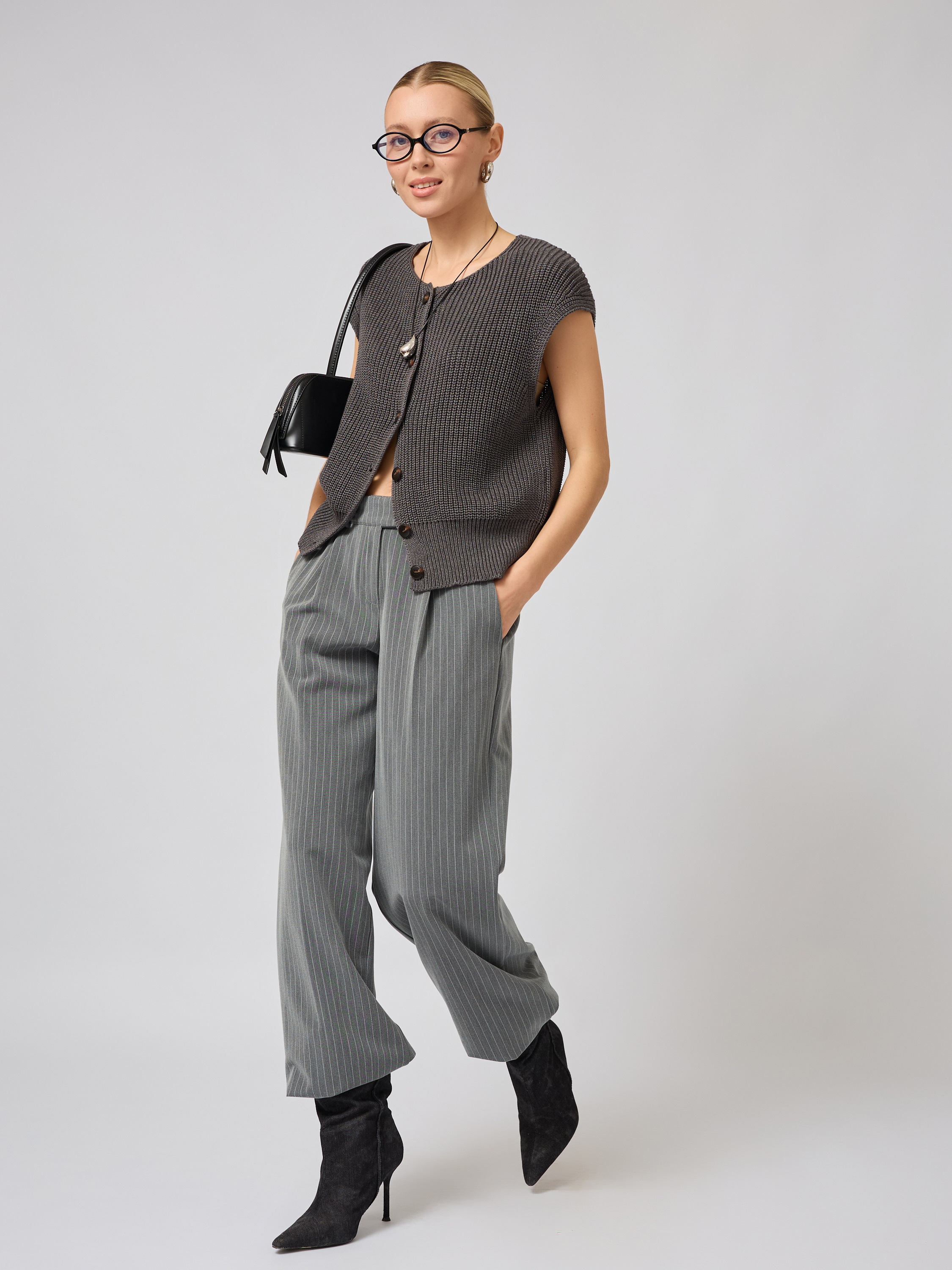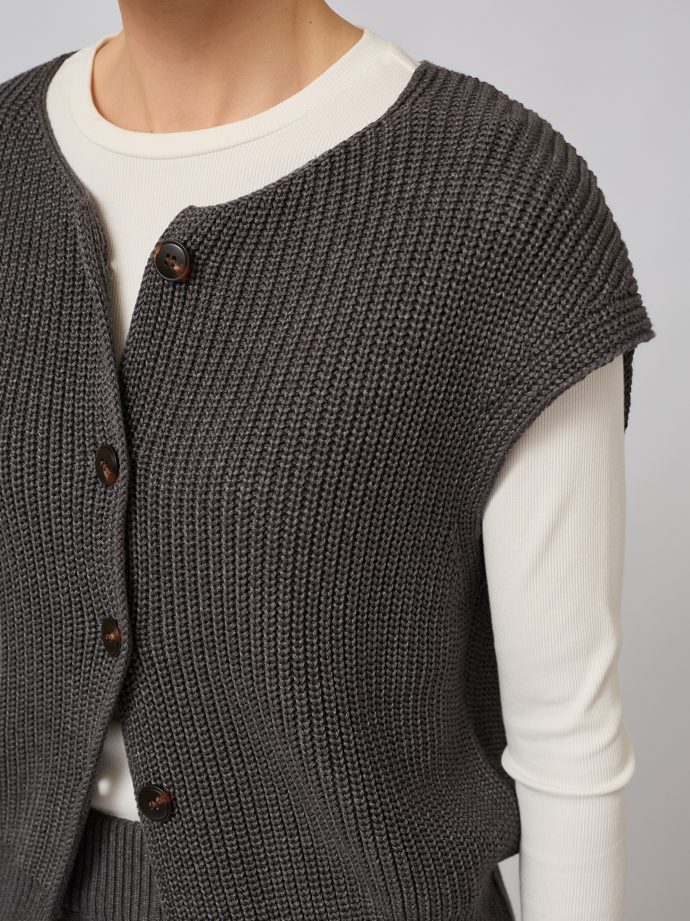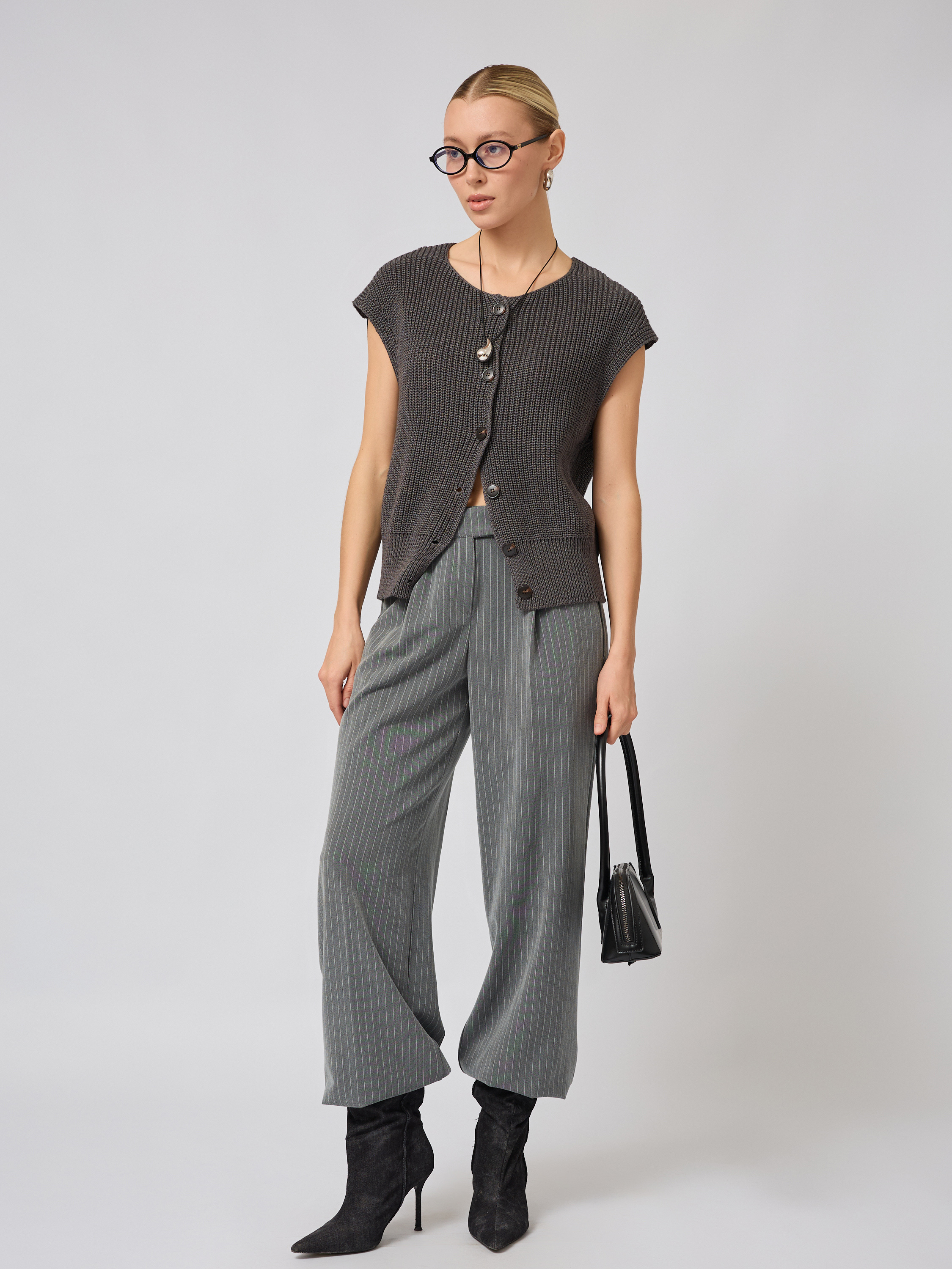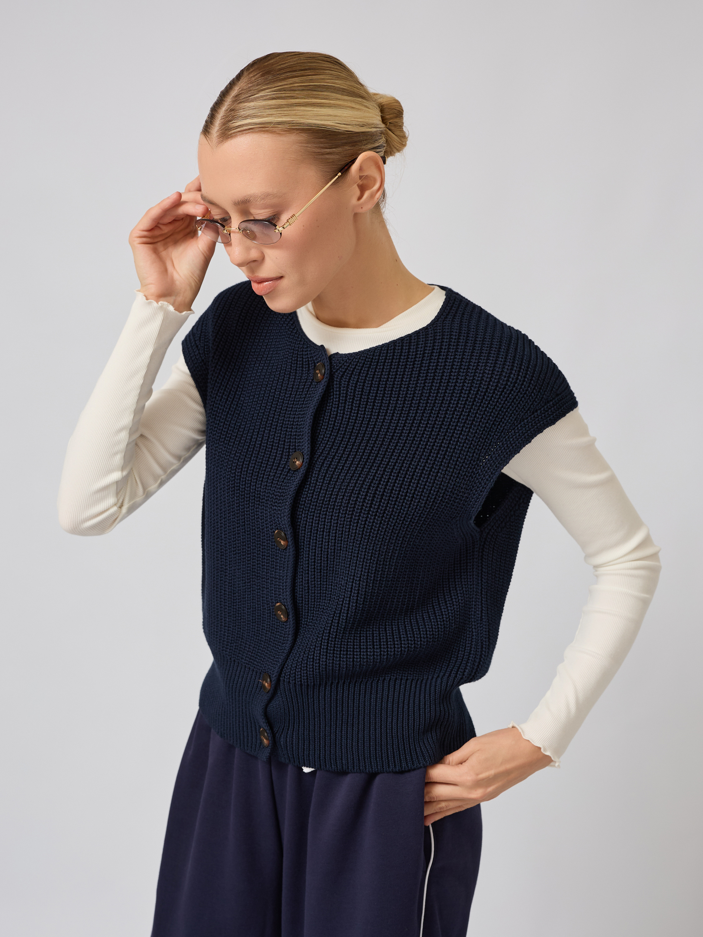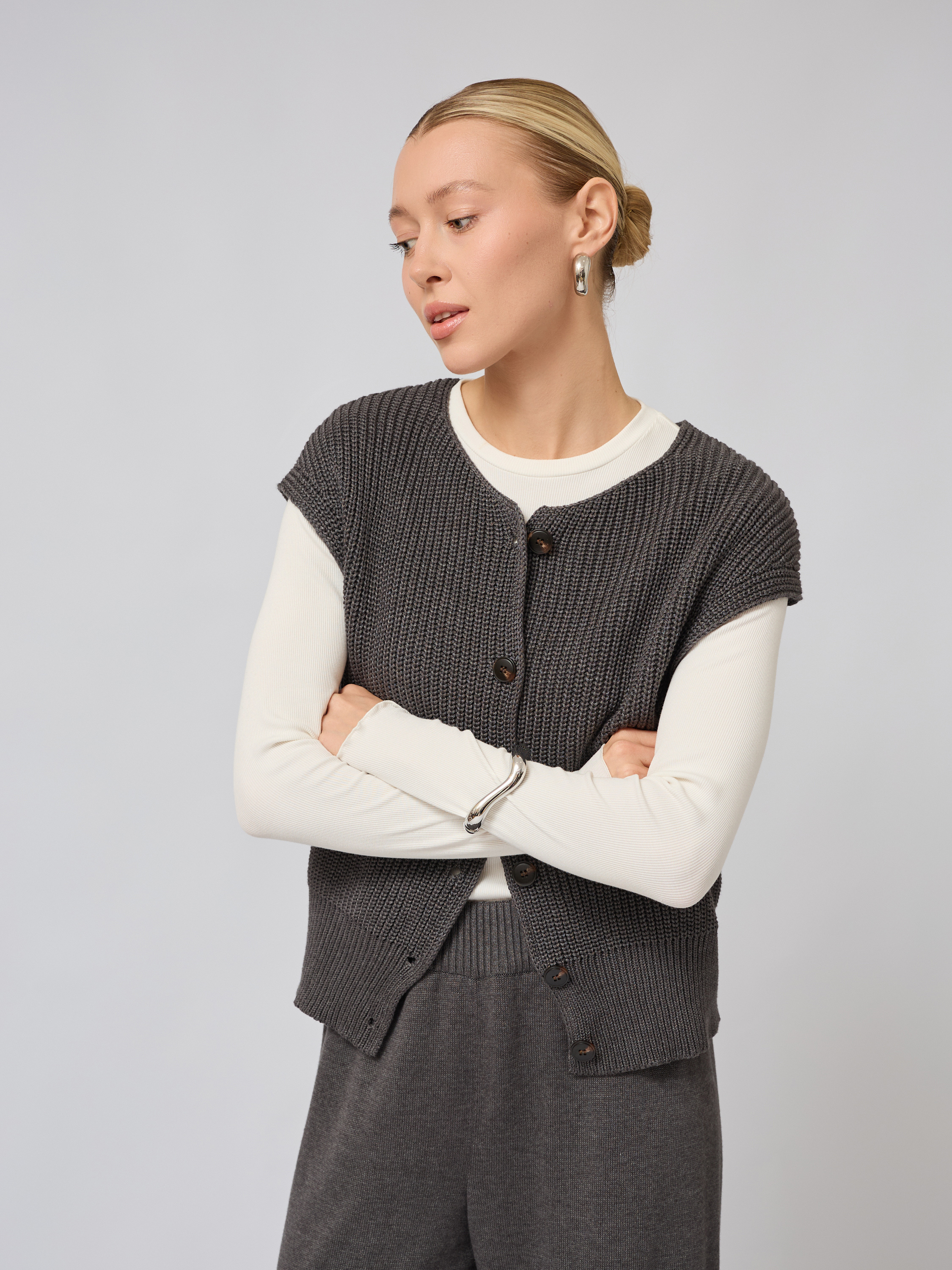 Стильный женский жилет вязаный на пуговицах — это тот элемент гардероба, который не стоит упускать при выборе вещей для прохладных дней. Этот жилет выполнен из высококачественных материалов, где основа — хлопка и акрила, что делает его отличным выбором для женщин, ценящих комфорт, универсальность и стиль. Молочный цвет придает особую элегантность и гладкость образу, позволяя вписываться как в офисный дресс-код, так и в повседневные наряды. Благодаря своей простотой и уникальным особенностям дизайна с круглым вырезом и прямым силуэтом, этот трикотажный жилет отличается безупречным исполнением. Жилетка превосходно держит форму за счет плотного трикотажа высокого качества. Хлопковая пряжа в составе позволяет изделию дышит при носке, а акрил добавляет мягкости и прочности. Вязаного рисунка нет — здесь ставка сделана на лаконичность линий и минимализм стиля. Не колется благодаря качественной обработке трикотажа: носите ее поверх водолазки или лонгслива — никакой лишней заботы о дискомфорте! Такой вариант согреет вас осенне-весенняя прохлада или холодные дни любого времени года. Этот удлиненный жилет свободного кроя подходит для женщин разных ростовки и легко адаптируется под особенности вашей фигуры за счет оверсайз силуэта. Он является универсальной основой коллекцию модных образов: сочетайте с базовый вещами или комбинируйте с различными элементами одежды для создания стильных нарядов любого назначения. Простой дизайн без декоративных элементов отлично впишется как в классические офисные стили, так и в более расслабленные повседневного направления. Не упустите возможность пополнить свой гардероб этим стильным вариантом: молочный оттенок прекрасно сочетается практически с любым цветом одежды; вырез круглый делает жилет идеальным дополнением к лонгсливам или водолазкам; застежка на пуговицах облегчает надевание при необходимости создать дополнительный слой тепла поверх рубашки либо футболки.