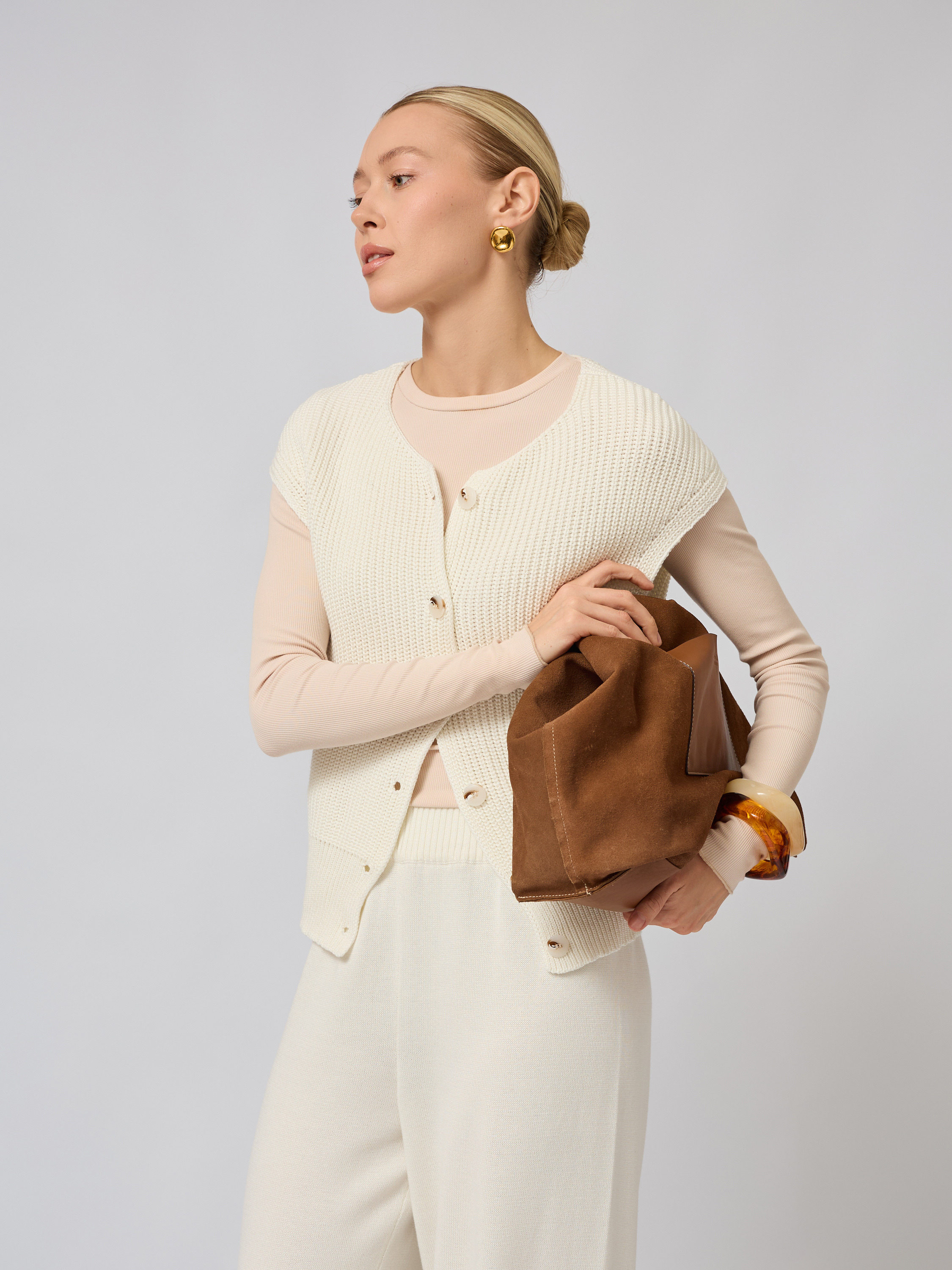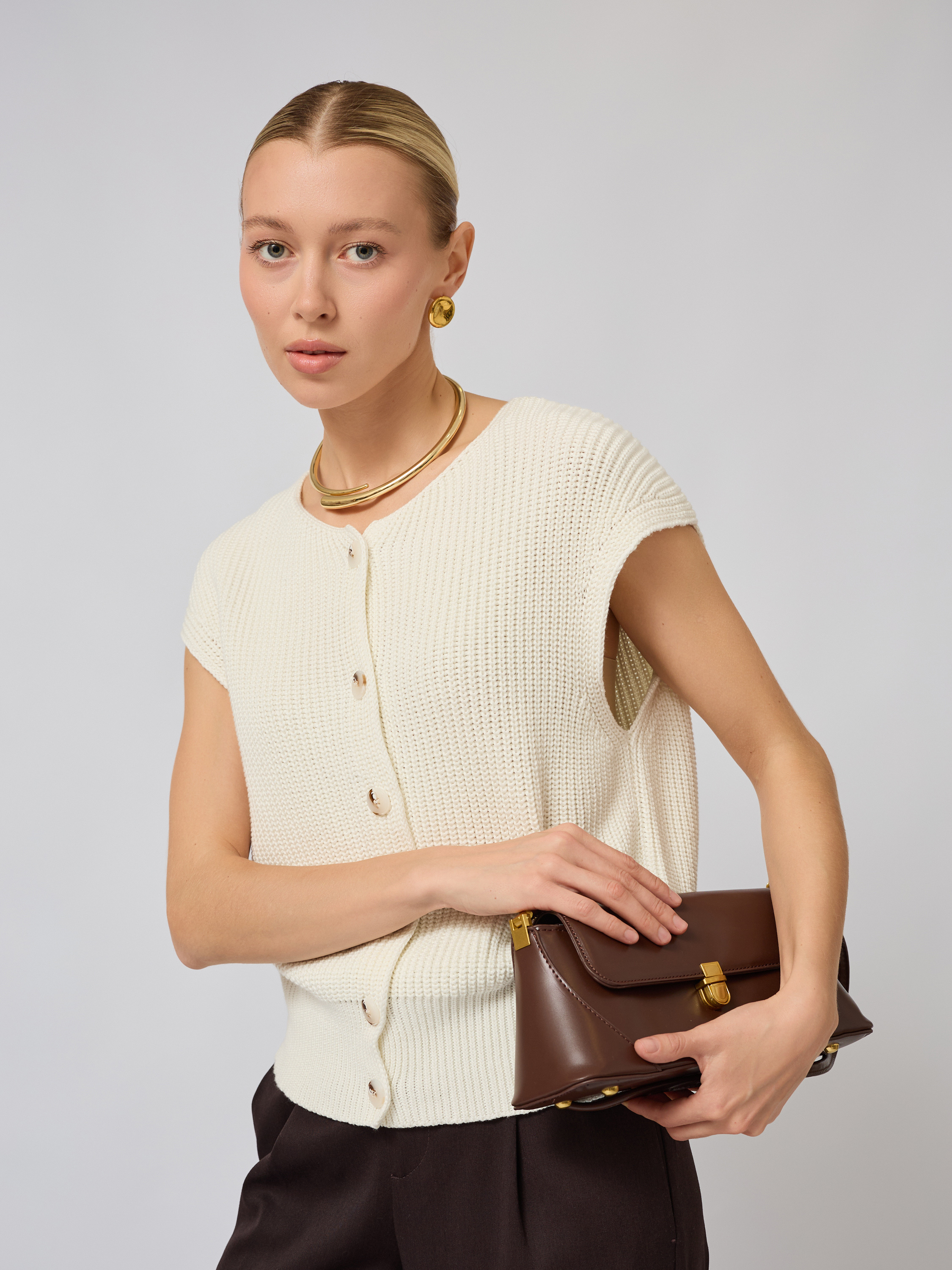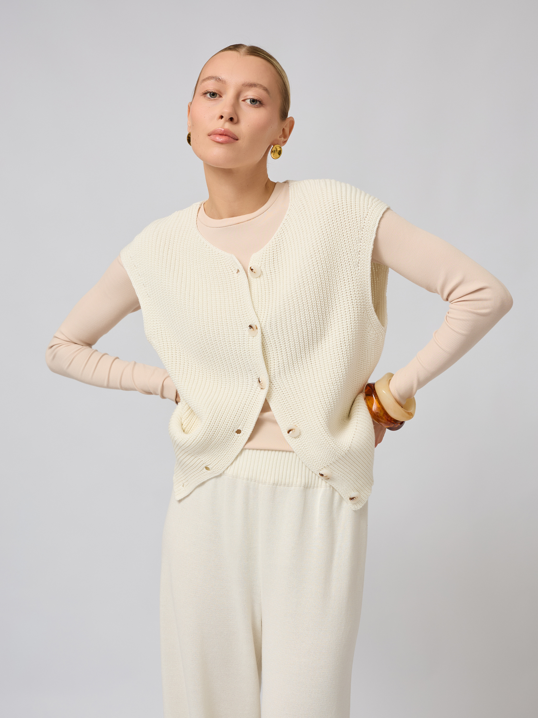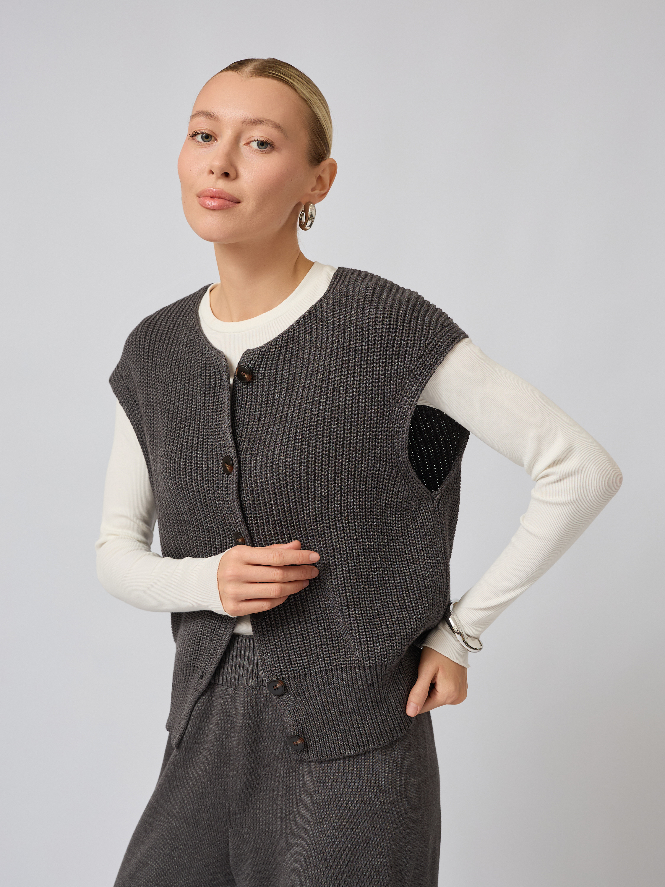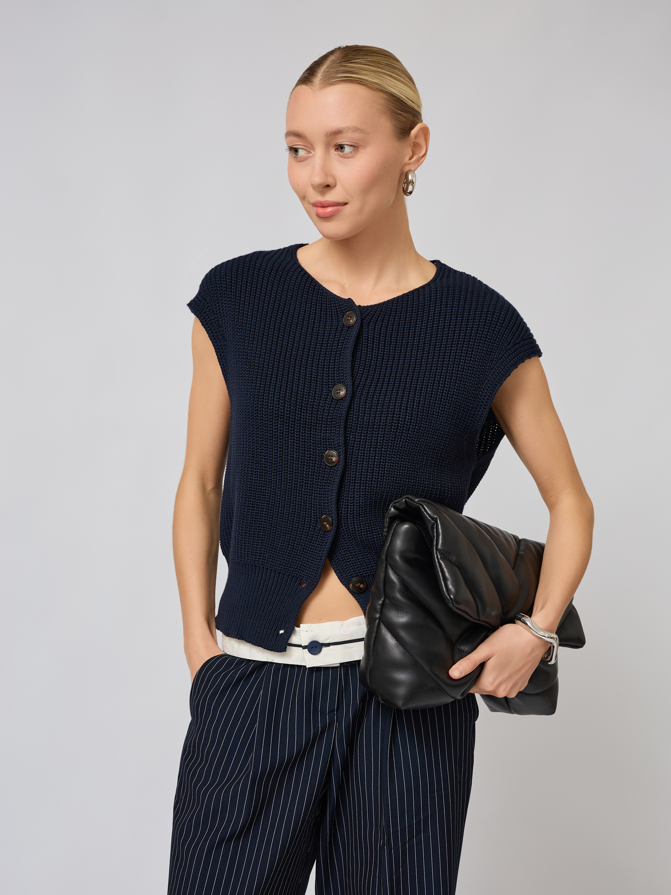 Стильный женский жилет вязаный на пуговицах — это тот элемент гардероба, который не стоит упускать при выборе вещей для прохладных дней. Этот жилет выполнен из высококачественных материалов, где основа — хлопка и акрила, что делает его отличным выбором для женщин, ценящих комфорт, универсальность и стиль. Молочный цвет придает особую элегантность и гладкость образу, позволяя вписываться как в офисный дресс-код, так и в повседневные наряды. Благодаря своей простотой и уникальным особенностям дизайна с круглым вырезом и прямым силуэтом, этот трикотажный жилет отличается безупречным исполнением. Жилетка превосходно держит форму за счет плотного трикотажа высокого качества. Хлопковая пряжа в составе позволяет изделию дышит при носке, а акрил добавляет мягкости и прочности. Вязаного рисунка нет — здесь ставка сделана на лаконичность линий и минимализм стиля. Не колется благодаря качественной обработке трикотажа: носите ее поверх водолазки или лонгслива — никакой лишней заботы о дискомфорте! Такой вариант согреет вас осенне-весенняя прохлада или холодные дни любого времени года. Этот удлиненный жилет свободного кроя подходит для женщин разных ростовки и легко адаптируется под особенности вашей фигуры за счет оверсайз силуэта. Он является универсальной основой коллекцию модных образов: сочетайте с базовый вещами или комбинируйте с различными элементами одежды для создания стильных нарядов любого назначения. Простой дизайн без декоративных элементов отлично впишется как в классические офисные стили, так и в более расслабленные повседневного направления. Не упустите возможность пополнить свой гардероб этим стильным вариантом: молочный оттенок прекрасно сочетается практически с любым цветом одежды; вырез круглый делает жилет идеальным дополнением к лонгсливам или водолазкам; застежка на пуговицах облегчает надевание при необходимости создать дополнительный слой тепла поверх рубашки либо футболки.