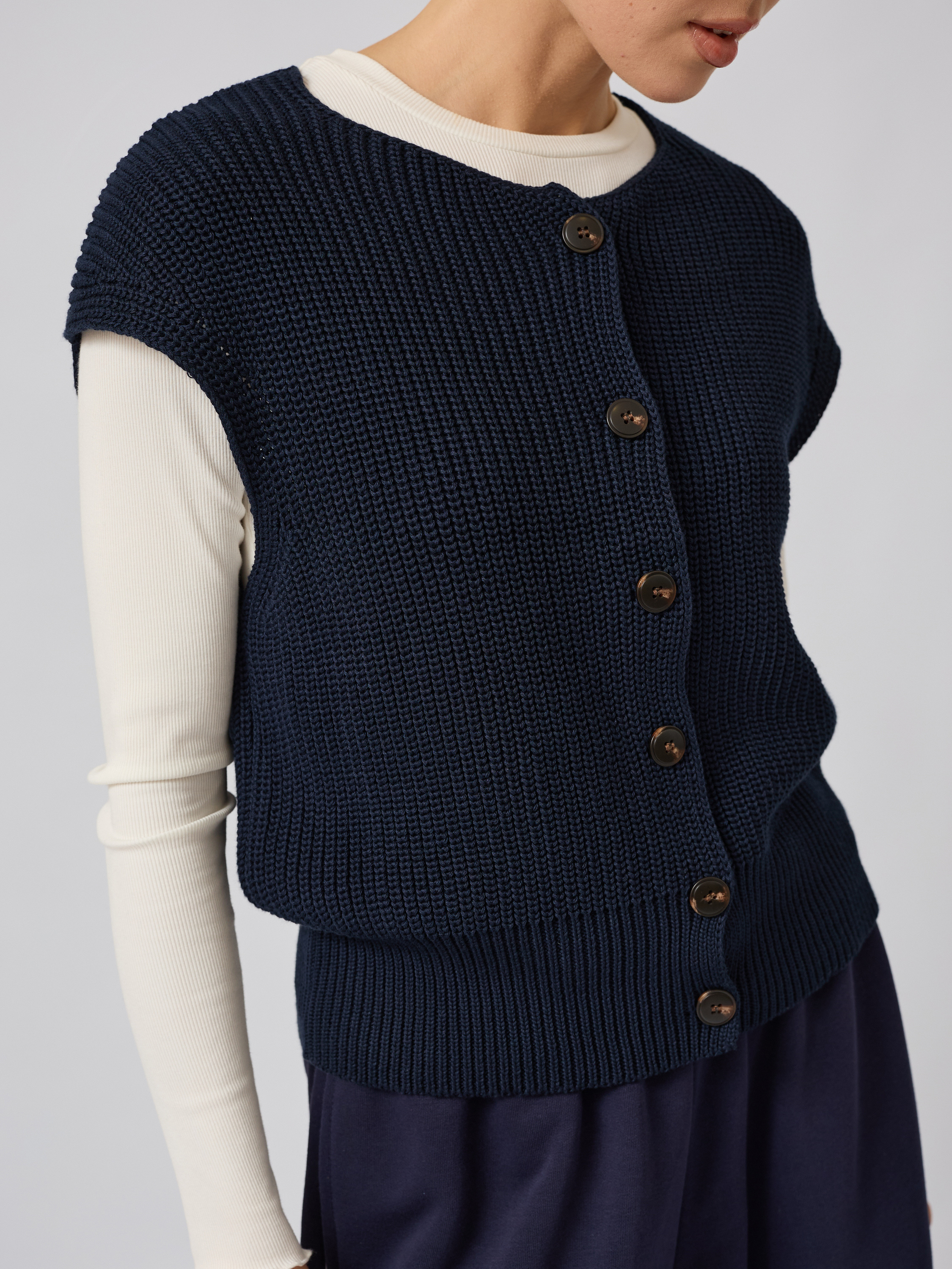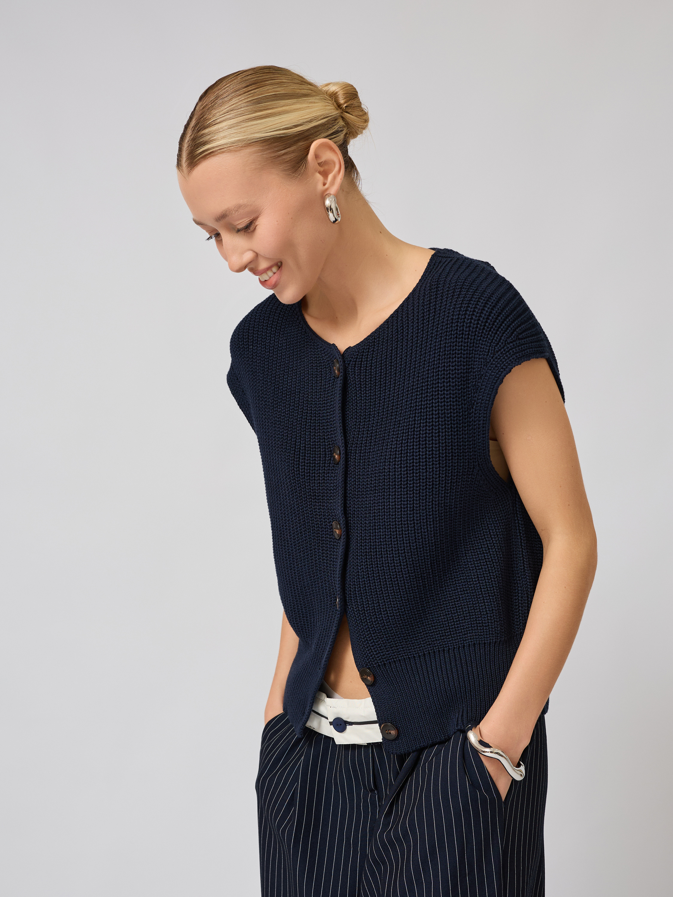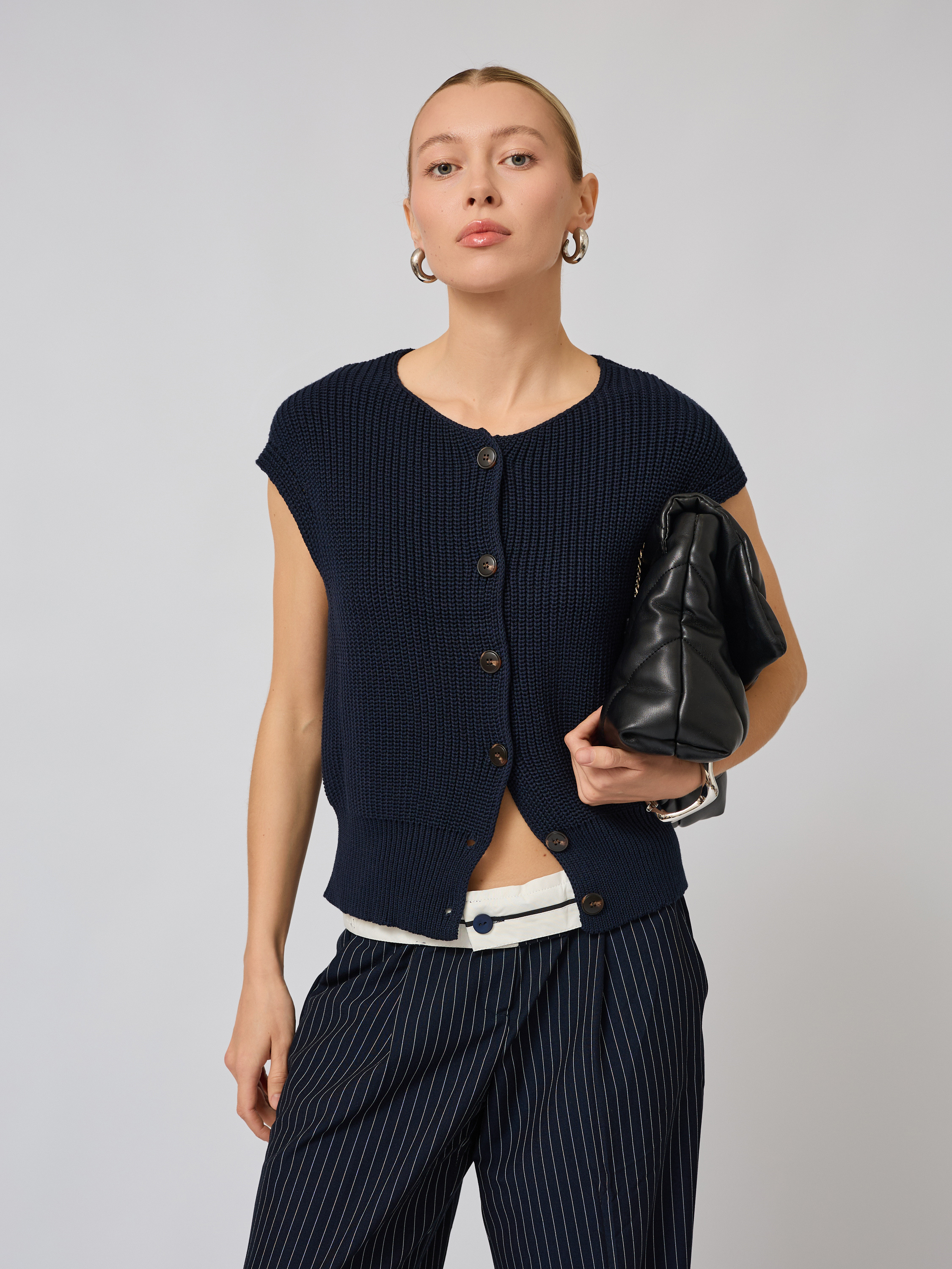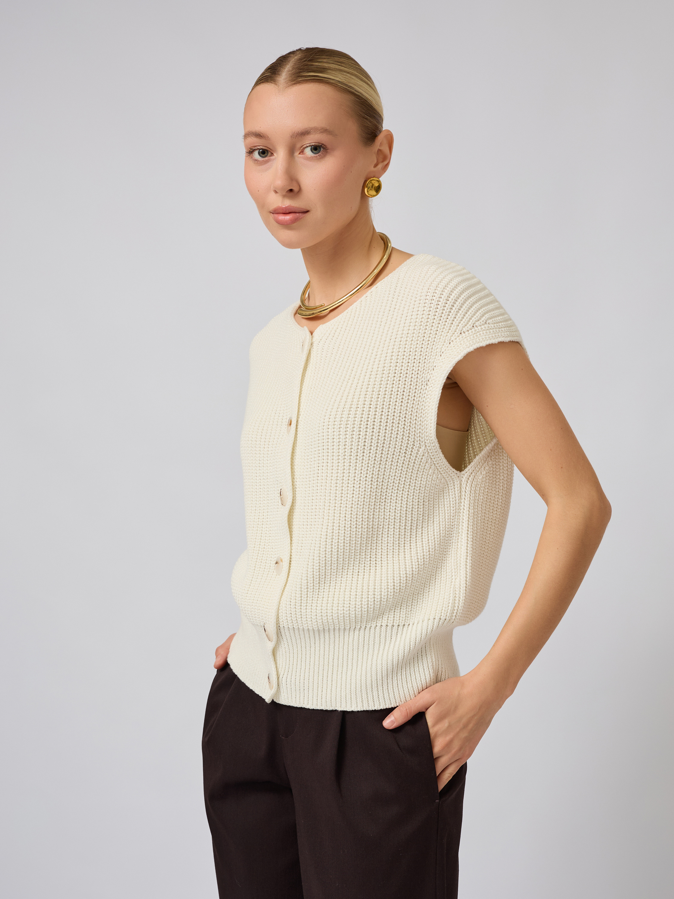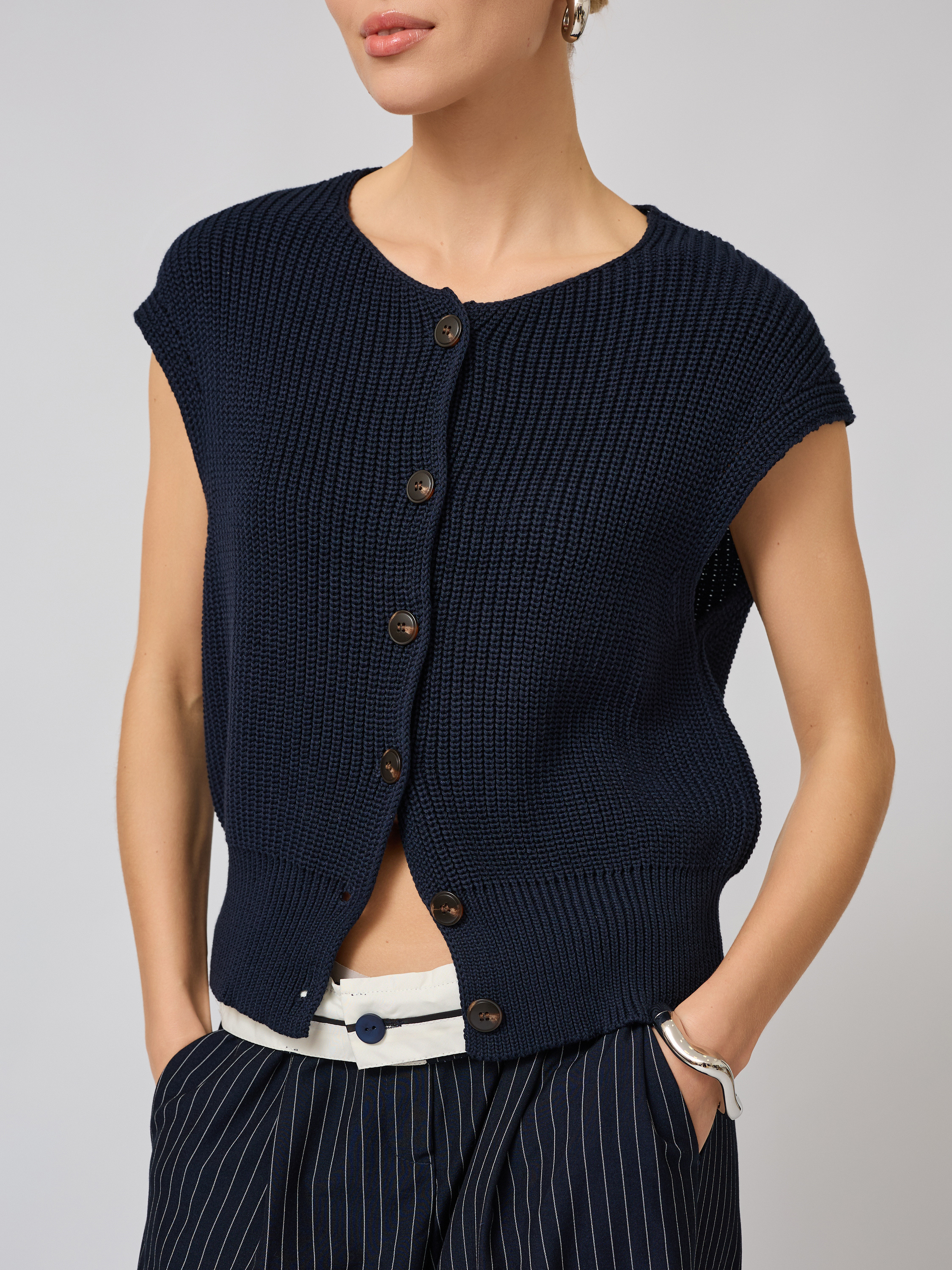 Стильный женский жилет вязаный на пуговицах — это тот элемент гардероба, который не стоит упускать при выборе вещей для прохладных дней. Этот жилет выполнен из высококачественных материалов, где основа — хлопка и акрила, что делает его отличным выбором для женщин, ценящих комфорт, универсальность и стиль. Молочный цвет придает особую элегантность и гладкость образу, позволяя вписываться как в офисный дресс-код, так и в повседневные наряды. Благодаря своей простотой и уникальным особенностям дизайна с круглым вырезом и прямым силуэтом, этот трикотажный жилет отличается безупречным исполнением. Жилетка превосходно держит форму за счет плотного трикотажа высокого качества. Хлопковая пряжа в составе позволяет изделию дышит при носке, а акрил добавляет мягкости и прочности. Вязаного рисунка нет — здесь ставка сделана на лаконичность линий и минимализм стиля. Не колется благодаря качественной обработке трикотажа: носите ее поверх водолазки или лонгслива — никакой лишней заботы о дискомфорте! Такой вариант согреет вас осенне-весенняя прохлада или холодные дни любого времени года. Этот удлиненный жилет свободного кроя подходит для женщин разных ростовки и легко адаптируется под особенности вашей фигуры за счет оверсайз силуэта. Он является универсальной основой коллекцию модных образов: сочетайте с базовый вещами или комбинируйте с различными элементами одежды для создания стильных нарядов любого назначения. Простой дизайн без декоративных элементов отлично впишется как в классические офисные стили, так и в более расслабленные повседневного направления. Не упустите возможность пополнить свой гардероб этим стильным вариантом: молочный оттенок прекрасно сочетается практически с любым цветом одежды; вырез круглый делает жилет идеальным дополнением к лонгсливам или водолазкам; застежка на пуговицах облегчает надевание при необходимости создать дополнительный слой тепла поверх рубашки либо футболки.