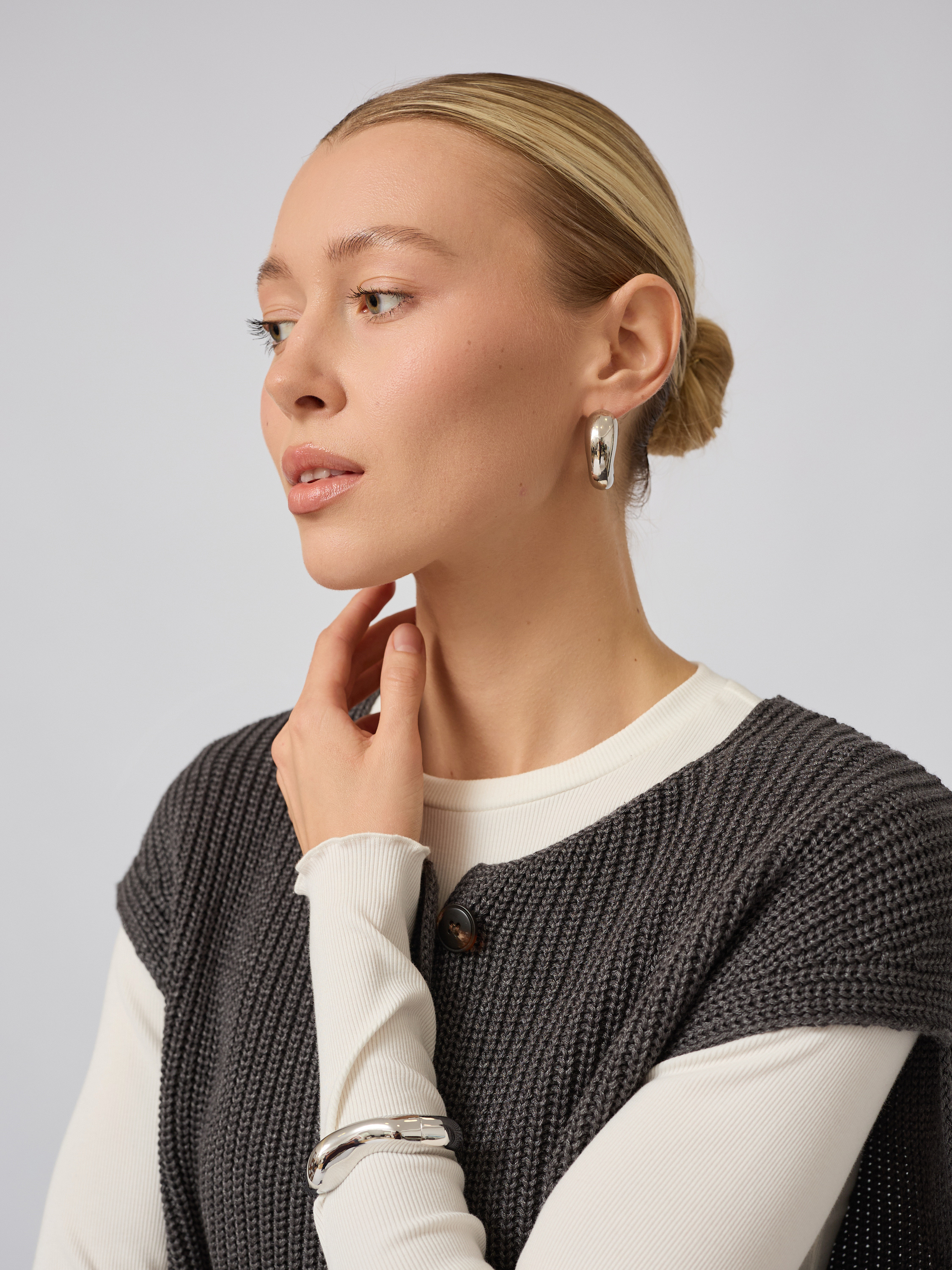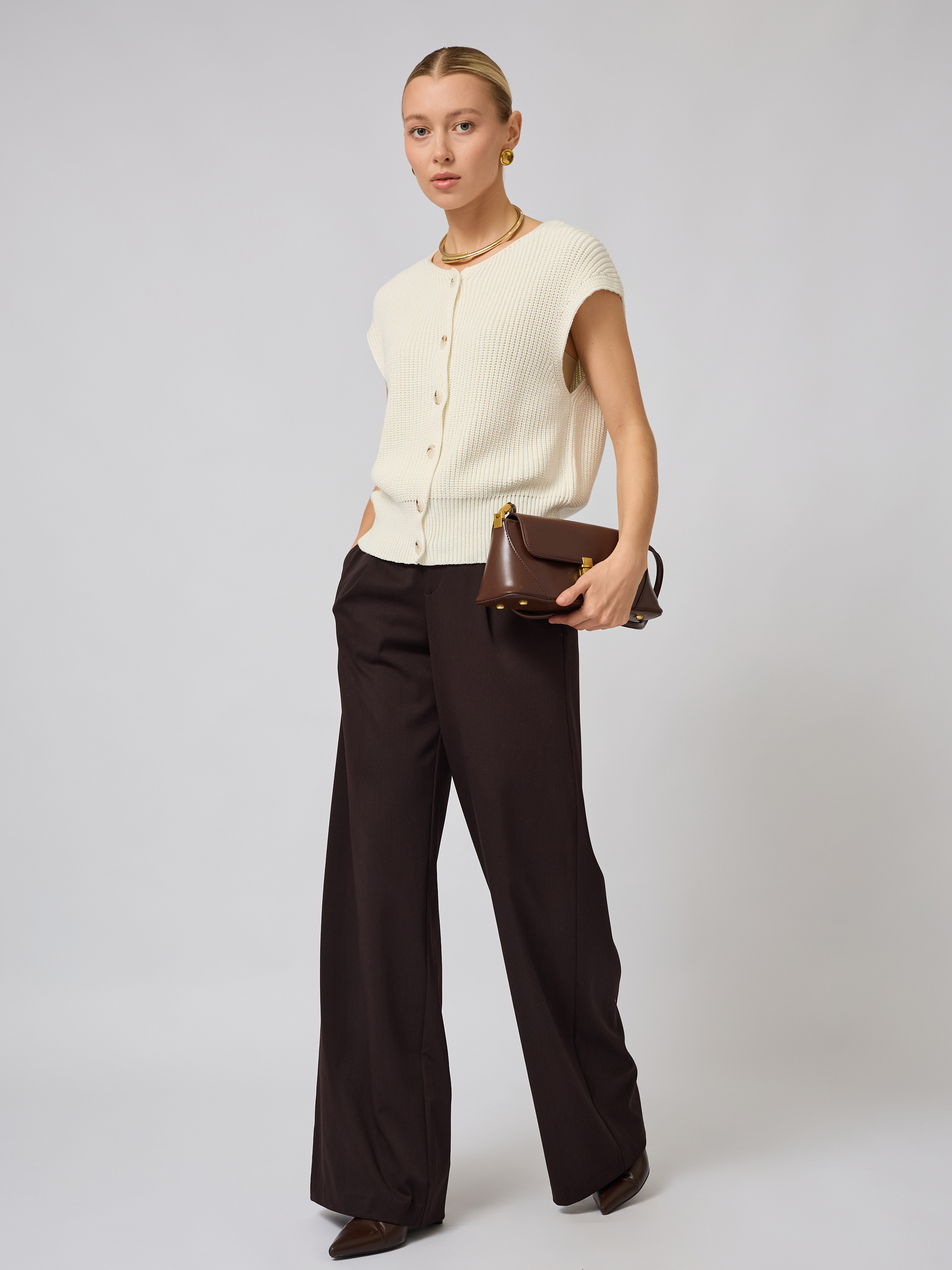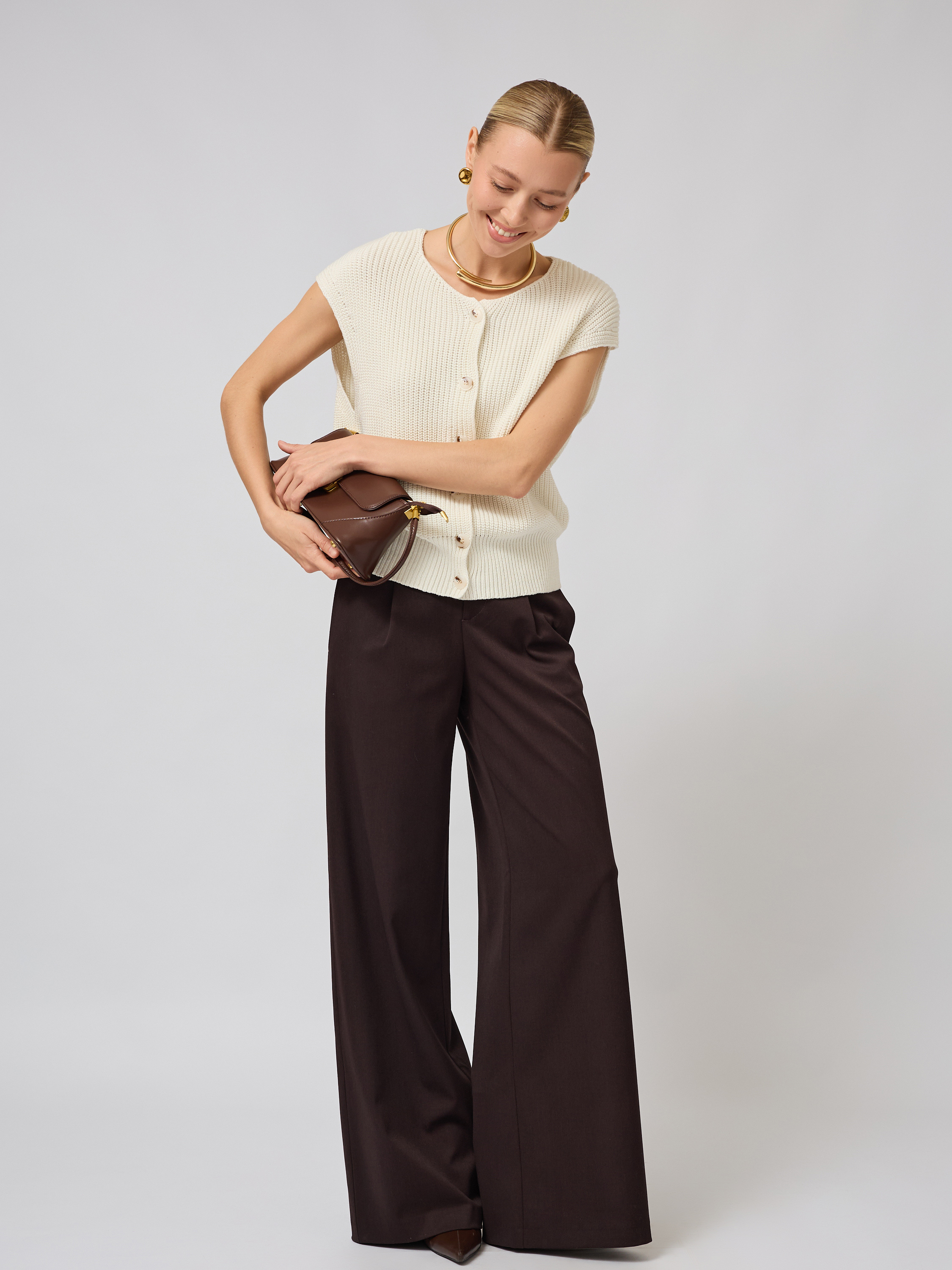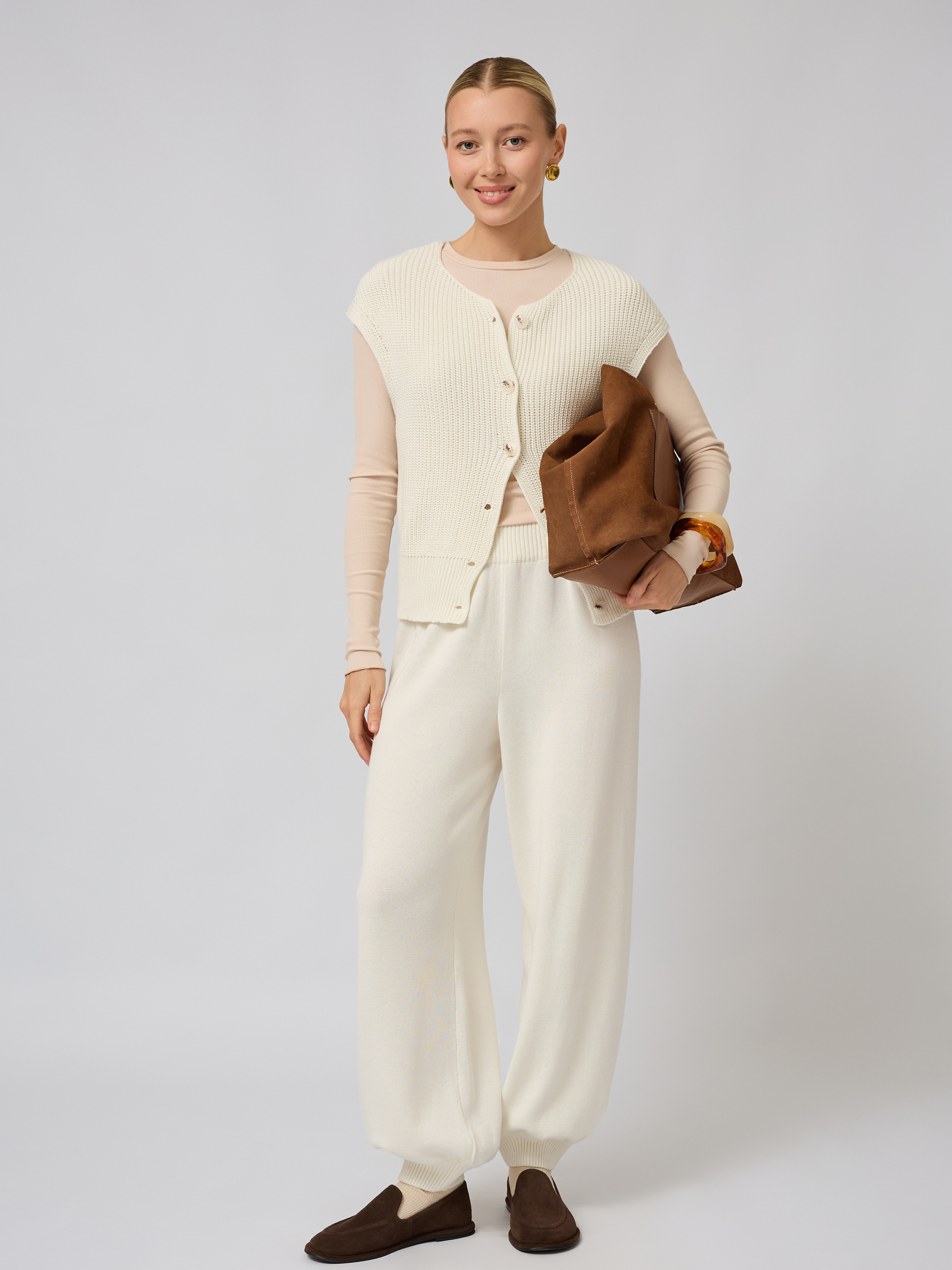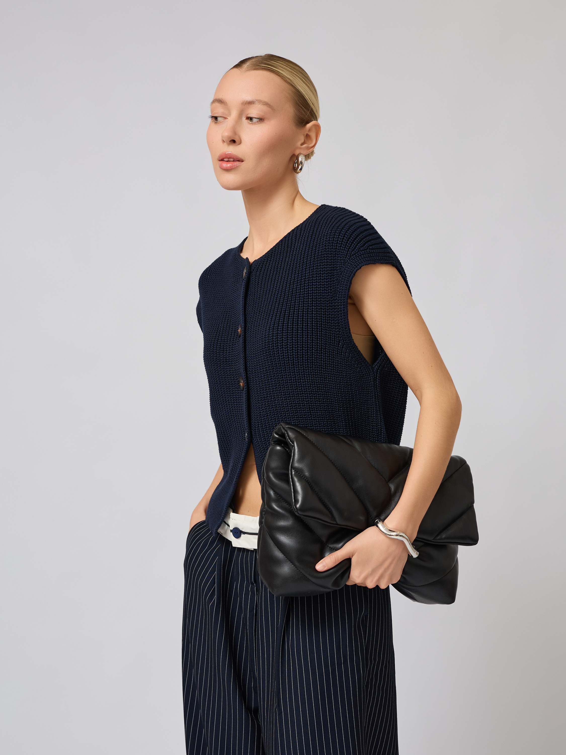 Стильный женский жилет вязаный на пуговицах — это тот элемент гардероба, который не стоит упускать при выборе вещей для прохладных дней. Этот жилет выполнен из высококачественных материалов, где основа — хлопка и акрила, что делает его отличным выбором для женщин, ценящих комфорт, универсальность и стиль. Молочный цвет придает особую элегантность и гладкость образу, позволяя вписываться как в офисный дресс-код, так и в повседневные наряды. Благодаря своей простотой и уникальным особенностям дизайна с круглым вырезом и прямым силуэтом, этот трикотажный жилет отличается безупречным исполнением. Жилетка превосходно держит форму за счет плотного трикотажа высокого качества. Хлопковая пряжа в составе позволяет изделию дышит при носке, а акрил добавляет мягкости и прочности. Вязаного рисунка нет — здесь ставка сделана на лаконичность линий и минимализм стиля. Не колется благодаря качественной обработке трикотажа: носите ее поверх водолазки или лонгслива — никакой лишней заботы о дискомфорте! Такой вариант согреет вас осенне-весенняя прохлада или холодные дни любого времени года. Этот удлиненный жилет свободного кроя подходит для женщин разных ростовки и легко адаптируется под особенности вашей фигуры за счет оверсайз силуэта. Он является универсальной основой коллекцию модных образов: сочетайте с базовый вещами или комбинируйте с различными элементами одежды для создания стильных нарядов любого назначения. Простой дизайн без декоративных элементов отлично впишется как в классические офисные стили, так и в более расслабленные повседневного направления. Не упустите возможность пополнить свой гардероб этим стильным вариантом: молочный оттенок прекрасно сочетается практически с любым цветом одежды; вырез круглый делает жилет идеальным дополнением к лонгсливам или водолазкам; застежка на пуговицах облегчает надевание при необходимости создать дополнительный слой тепла поверх рубашки либо футболки.