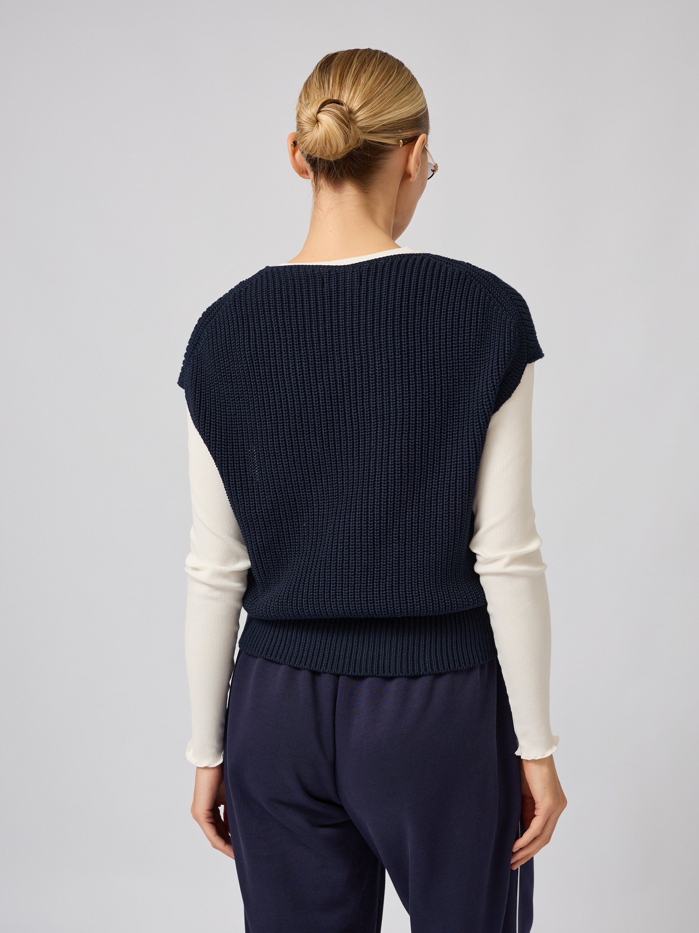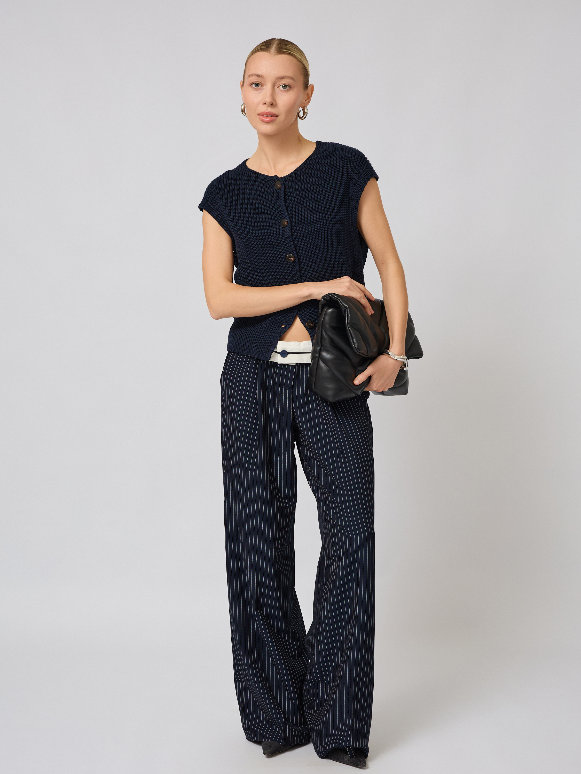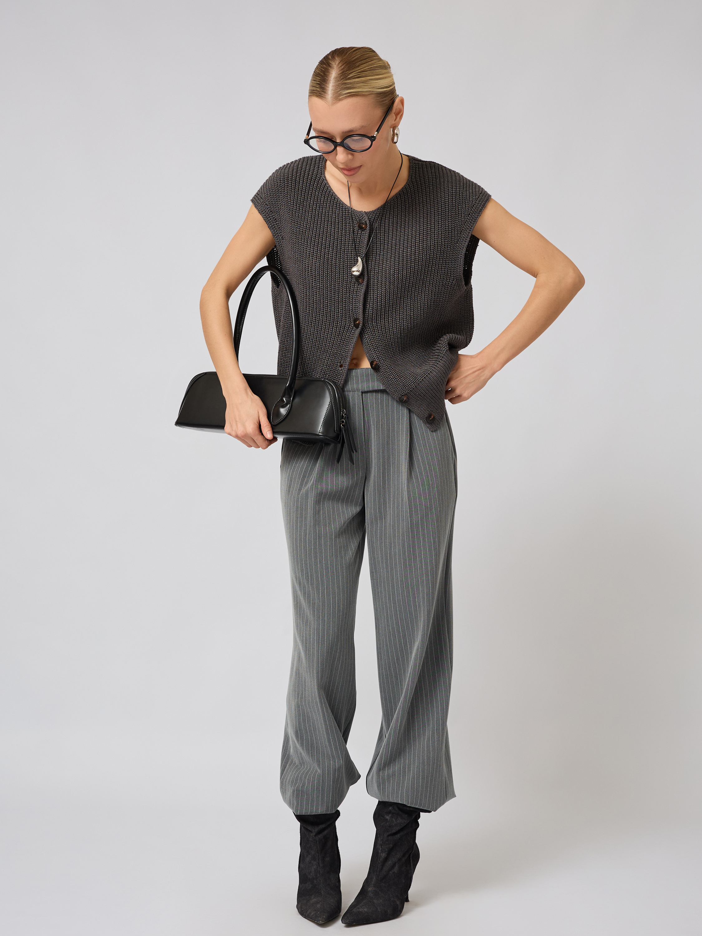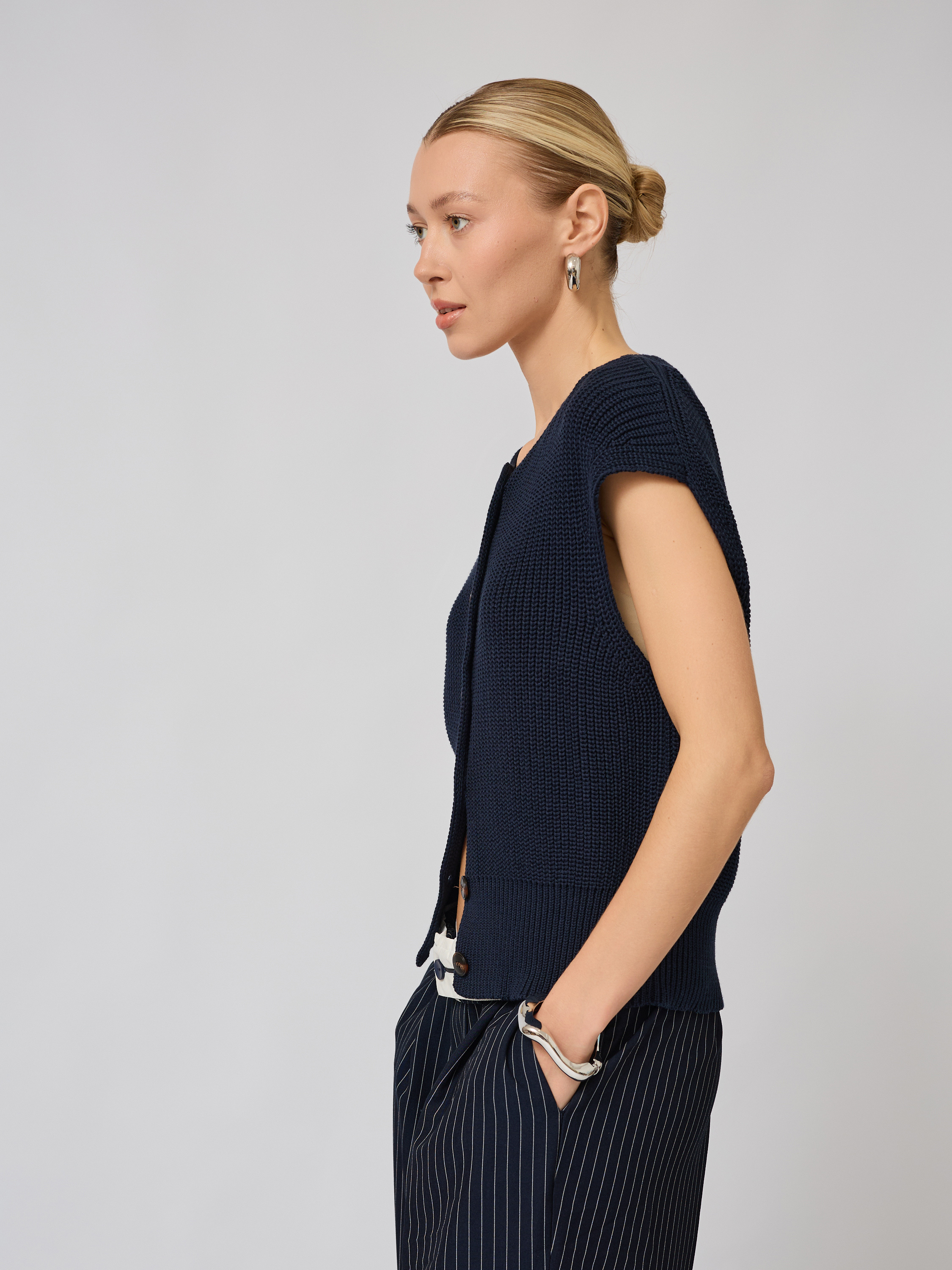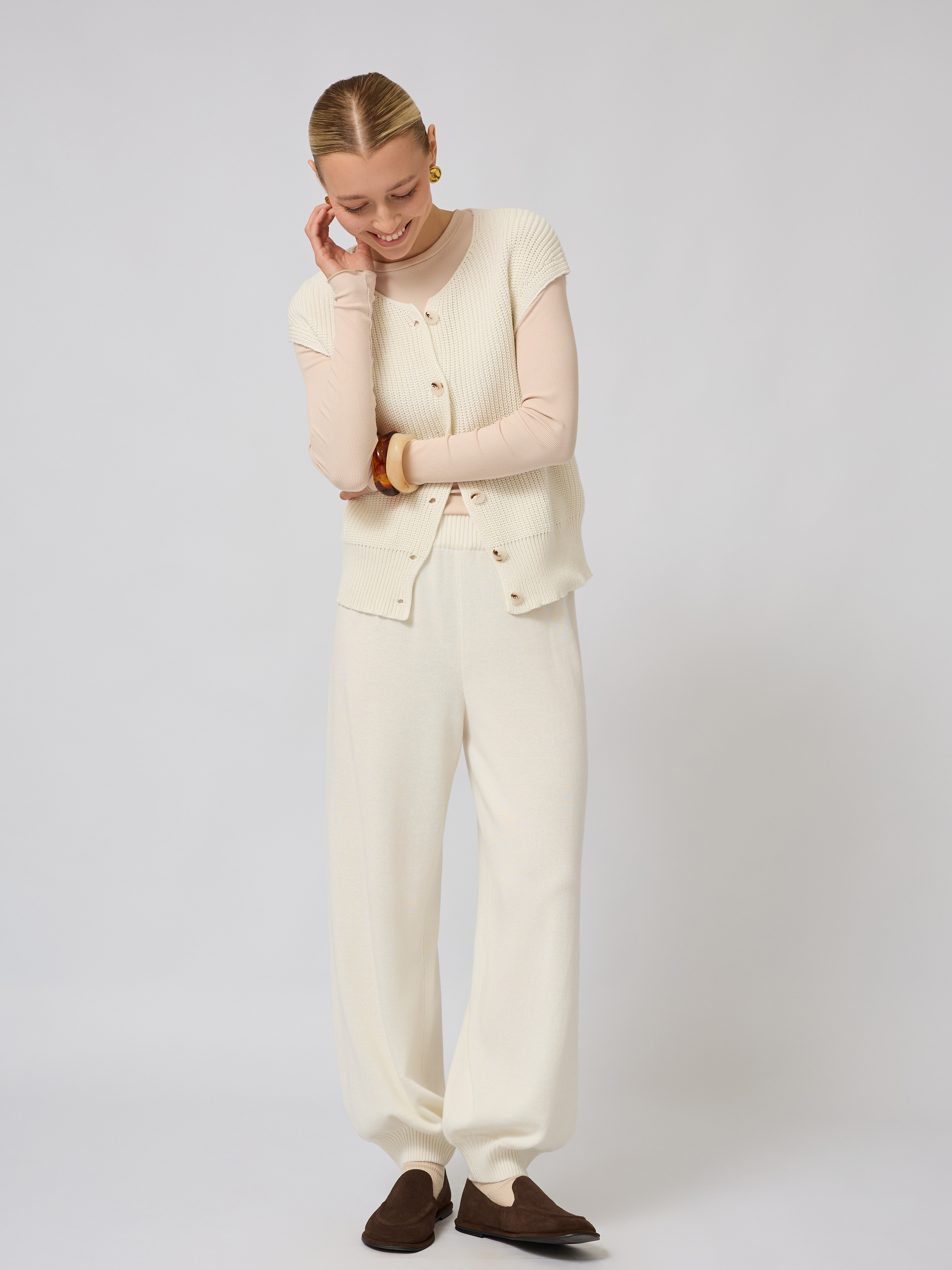Стильный женский жилет вязаный на пуговицах — это тот элемент гардероба, который не стоит упускать при выборе вещей для прохладных дней. Этот жилет выполнен из высококачественных материалов, где основа — хлопка и акрила, что делает его отличным выбором для женщин, ценящих комфорт, универсальность и стиль. Молочный цвет придает особую элегантность и гладкость образу, позволяя вписываться как в офисный дресс-код, так и в повседневные наряды. Благодаря своей простотой и уникальным особенностям дизайна с круглым вырезом и прямым силуэтом, этот трикотажный жилет отличается безупречным исполнением. Жилетка превосходно держит форму за счет плотного трикотажа высокого качества. Хлопковая пряжа в составе позволяет изделию дышит при носке, а акрил добавляет мягкости и прочности. Вязаного рисунка нет — здесь ставка сделана на лаконичность линий и минимализм стиля. Не колется благодаря качественной обработке трикотажа: носите ее поверх водолазки или лонгслива — никакой лишней заботы о дискомфорте! Такой вариант согреет вас осенне-весенняя прохлада или холодные дни любого времени года. Этот удлиненный жилет свободного кроя подходит для женщин разных ростовки и легко адаптируется под особенности вашей фигуры за счет оверсайз силуэта. Он является универсальной основой коллекцию модных образов: сочетайте с базовый вещами или комбинируйте с различными элементами одежды для создания стильных нарядов любого назначения. Простой дизайн без декоративных элементов отлично впишется как в классические офисные стили, так и в более расслабленные повседневного направления. Не упустите возможность пополнить свой гардероб этим стильным вариантом: молочный оттенок прекрасно сочетается практически с любым цветом одежды; вырез круглый делает жилет идеальным дополнением к лонгсливам или водолазкам; застежка на пуговицах облегчает надевание при необходимости создать дополнительный слой тепла поверх рубашки либо футболки.